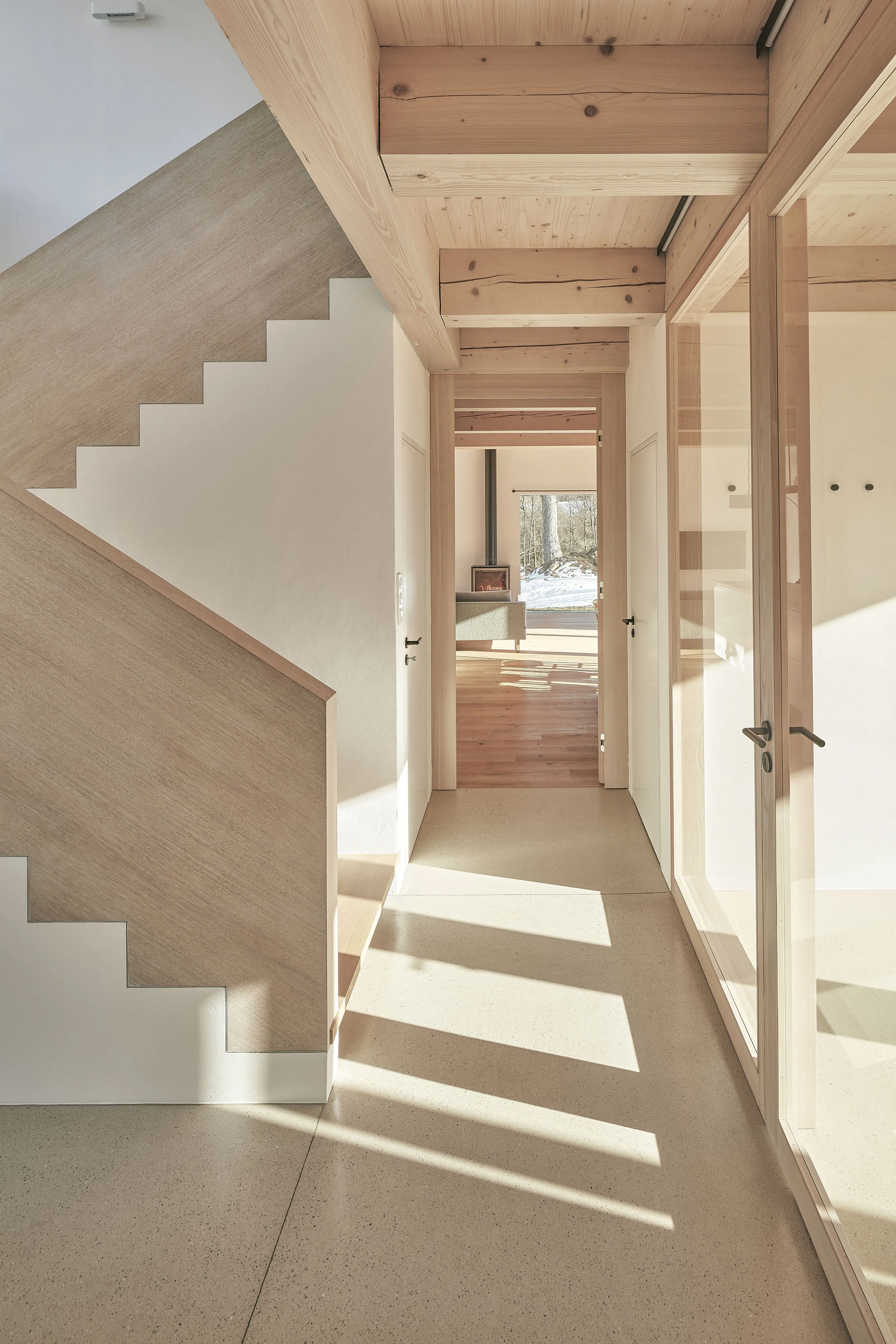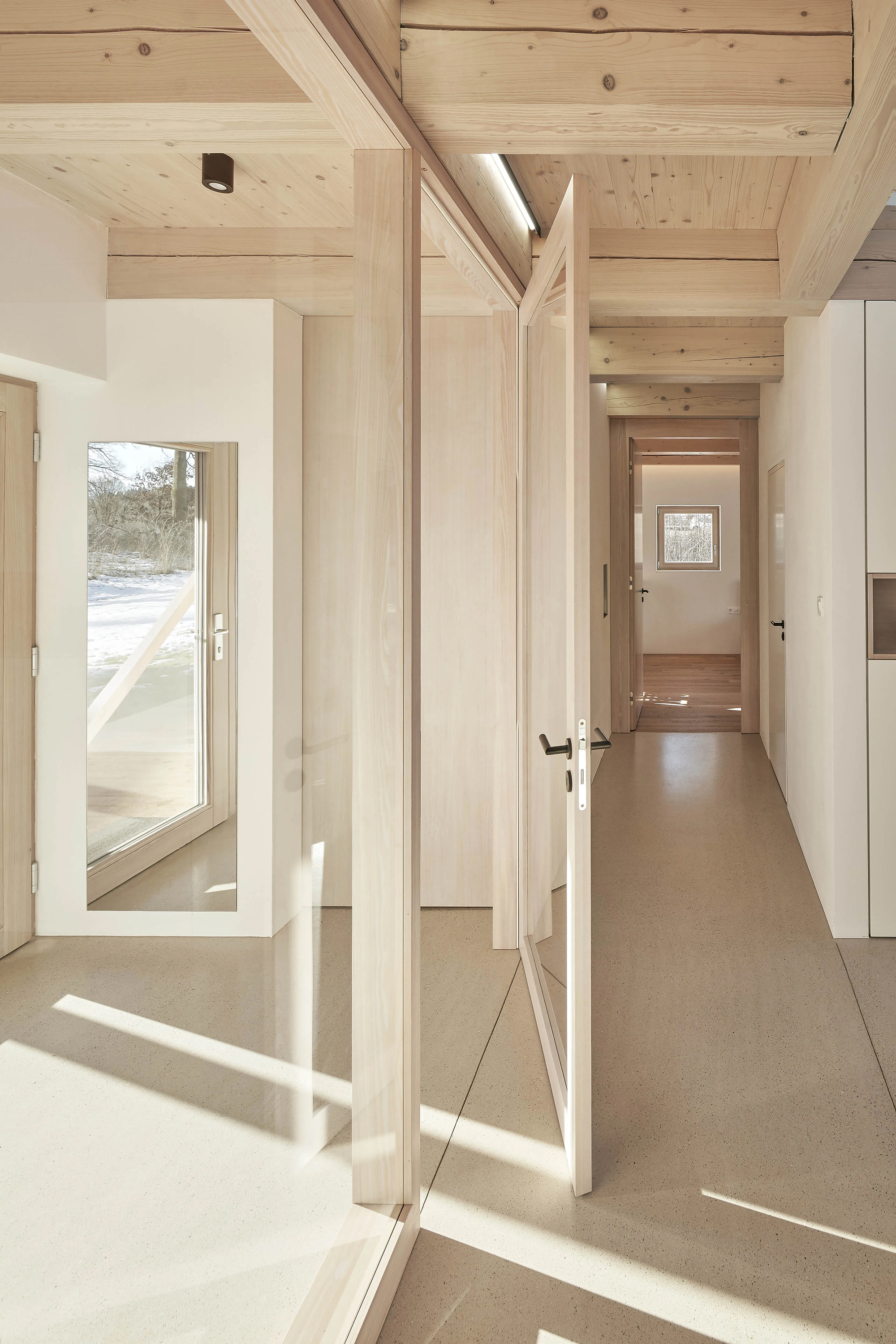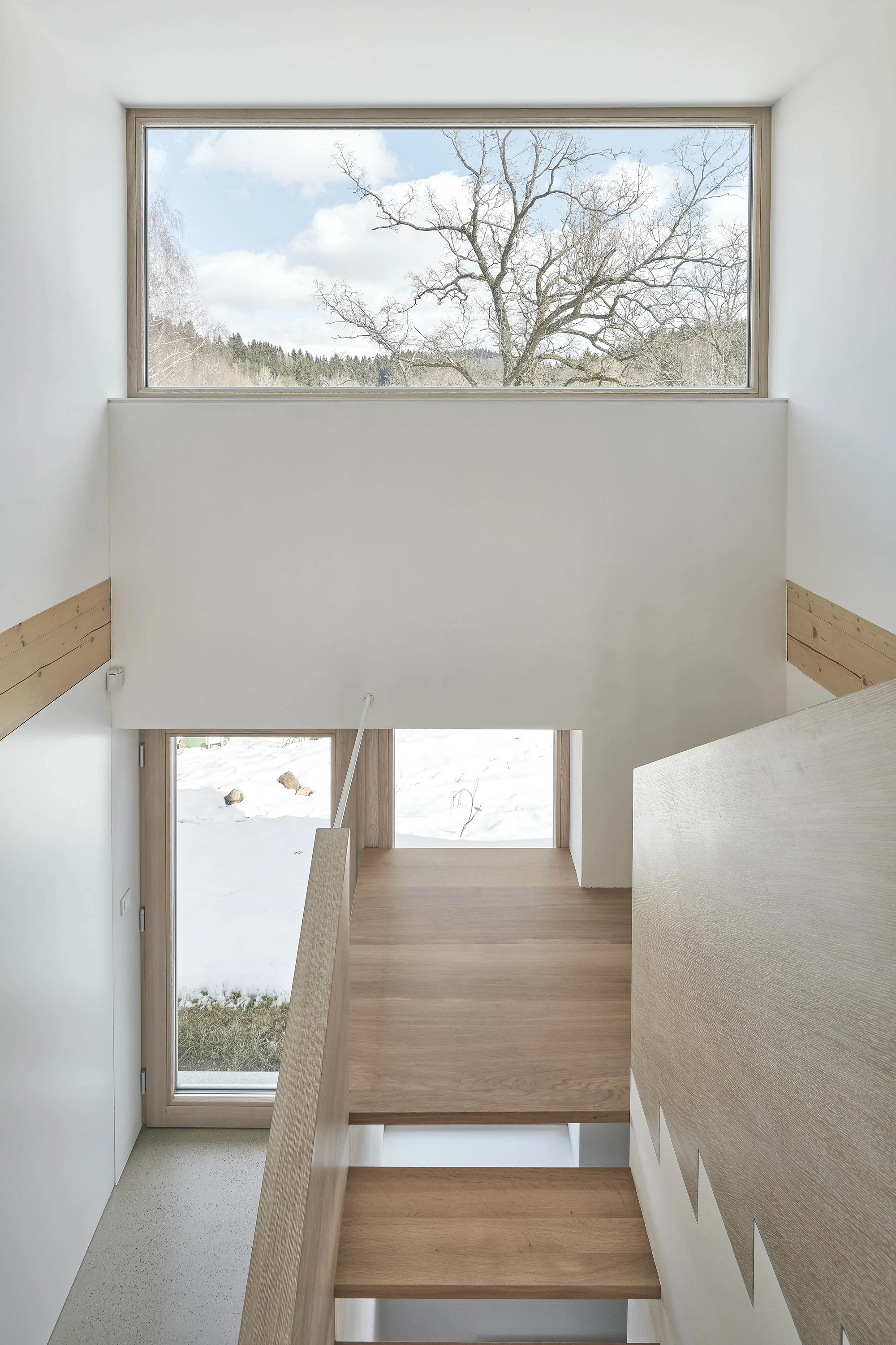 In the lounge area, a fireplace creates a cozy atmosphere. Here, there’s also a small office with a desk and chair, as the owner works from home. The ground floor also contains the master bedroom. A central staircase links the ground level with the gallery in the attic. This floor houses two bedrooms and a bathroom. Minimalist and elegant, the interiors were designed by a relative of the client. The living spaces feature white walls, larch and oak wood surfaces, timber furniture, and simple pendant lighting. Intentionally serene, the interiors thus allow the beauty of nature to become the focus throughout the house. To complete the project, the studio collaborated with a local bricklayer, who built the house and also designed the brick vaulted cellar in the basement. Photography © Peter Fabo.