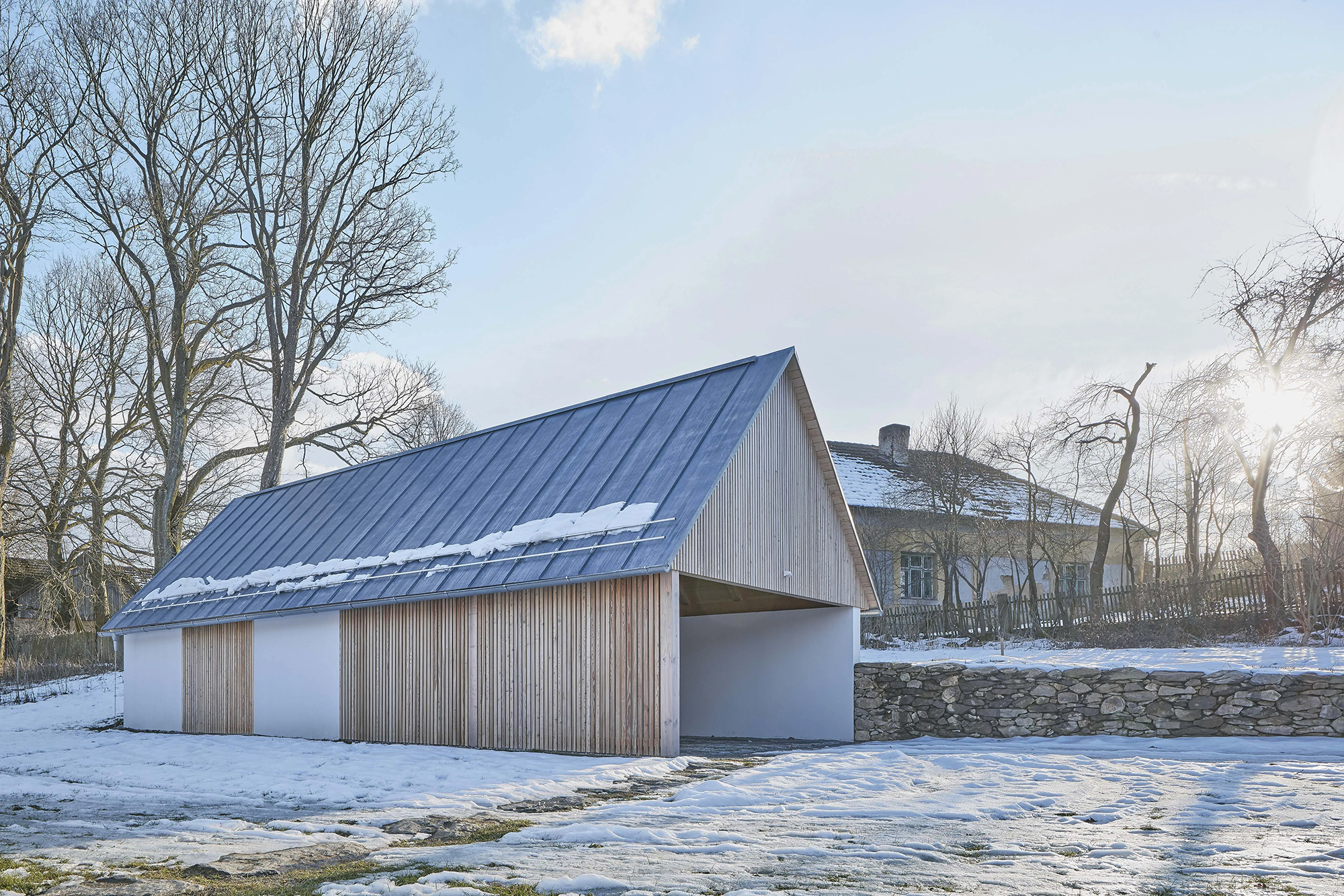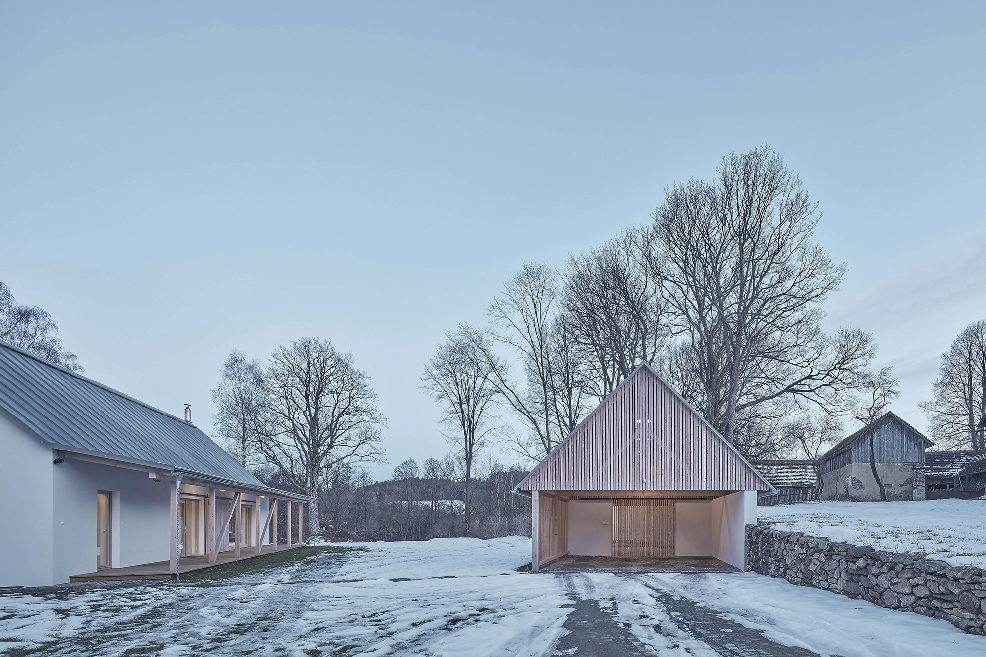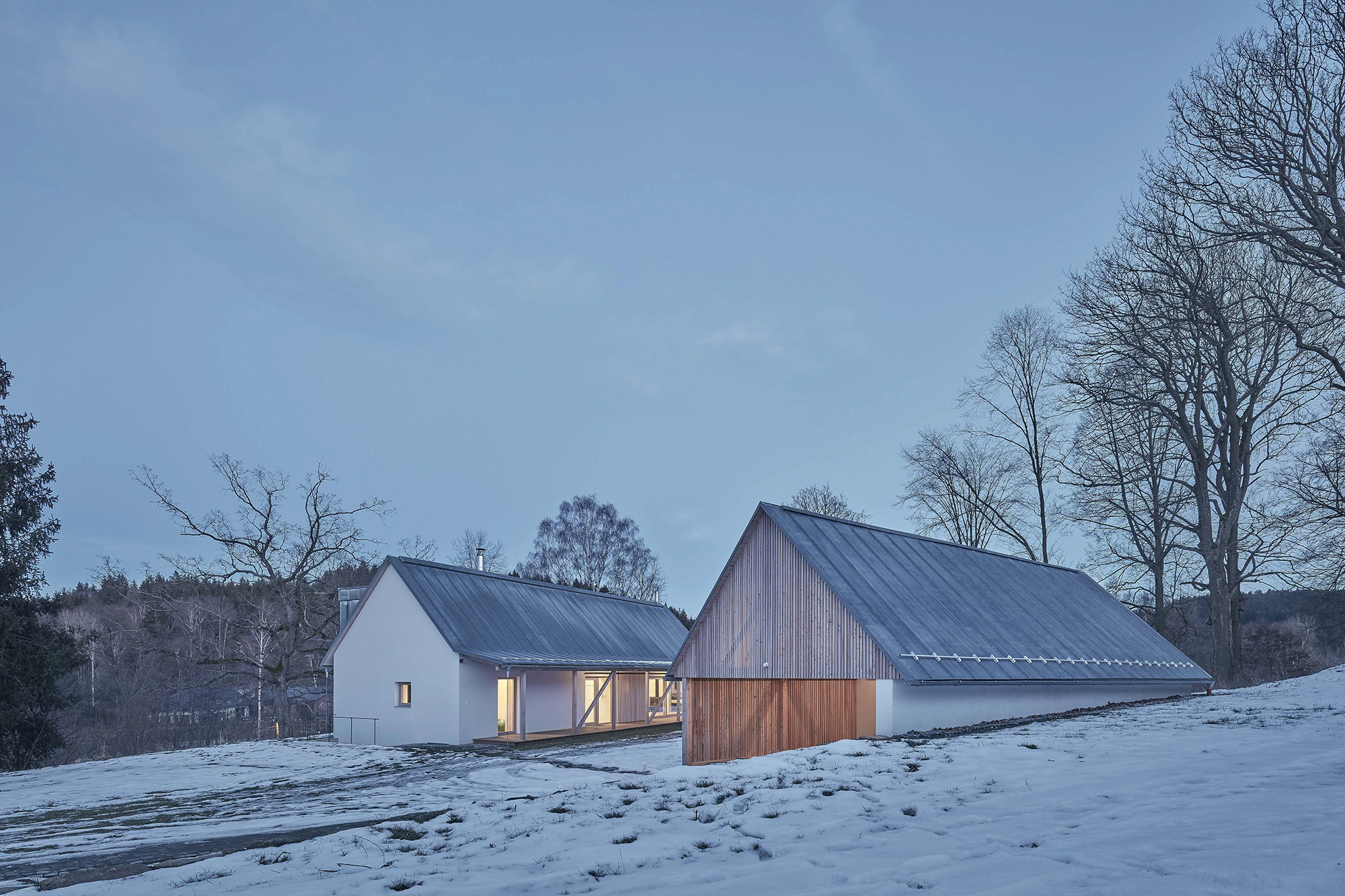 House with a Barn in Vysočina was designed by architecture and interior design firm Machar & Teichman. Located on the edge of a sloping site in the center of a village in the Vysočina Region, Czech Republic, both the house and the barn occupy the footprint of a former farmhouse. While the house contains living spaces on two levels and utility rooms in the basement, the barn features a garage and storage areas. The architects designed the two volumes with traditional gabled forms. They also used a blend of timber and steel along with classic white stucco walls. For the residence, the team designed a covered veranda that stretches along the south-western façade. Part of the main living area and the kitchen feature a double height ceiling. Large windows with minimal frames provide access to views of the village and the landscape.