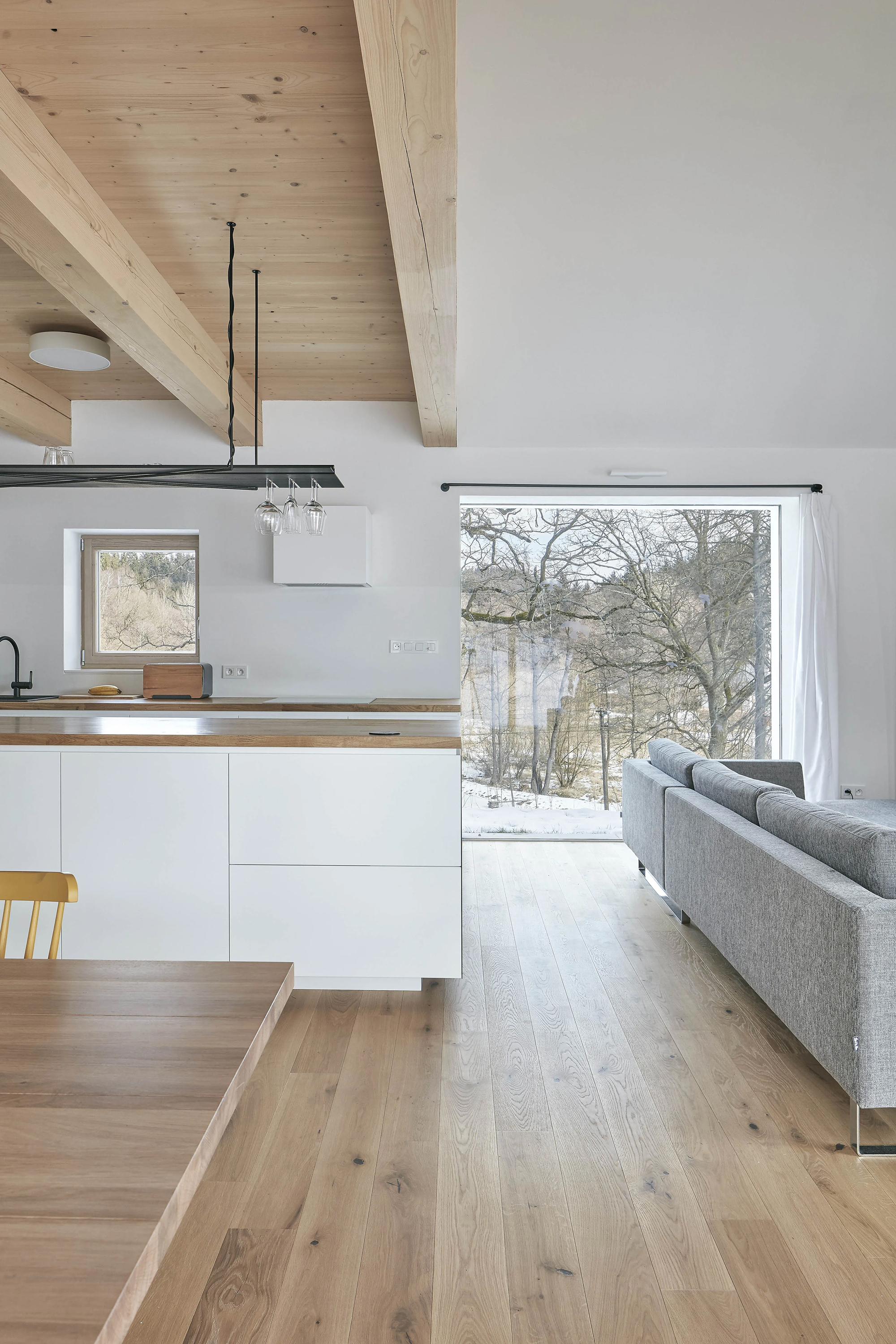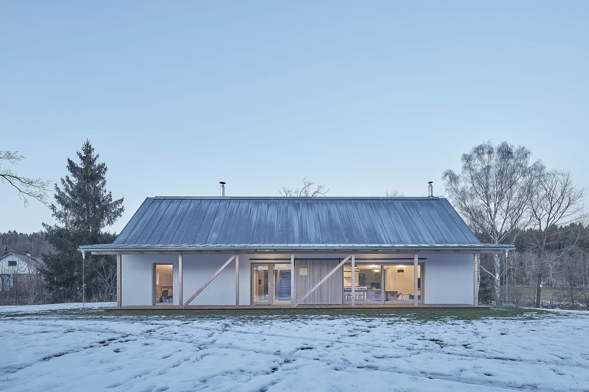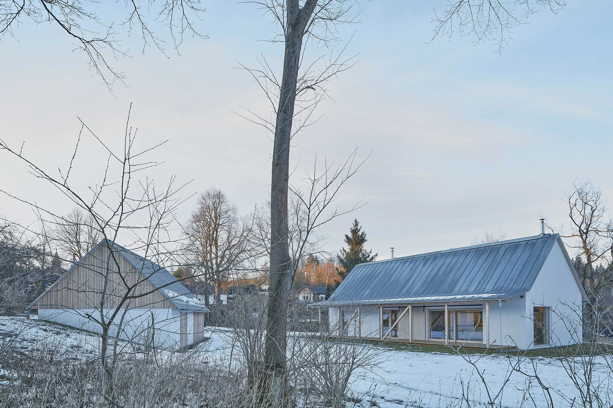 House with a Barn in Vysočina was designed by architecture and interior design firm Machar & Teichman. Located on the edge of a sloping site in the center of a village in the Vysočina Region, Czech Republic, both the house and the barn occupy the footprint of a former farmhouse. While the house contains living spaces on two levels and utility rooms in the basement, the barn features a garage and storage areas. The architects designed the two volumes with traditional gabled forms. They also used a blend of timber and steel along with classic white stucco walls. For the residence, the team designed a covered veranda that stretches along the south-western façade. Part of the main living area and the kitchen feature a double height ceiling. Large windows with minimal frames provide access to views of the village and the landscape.
