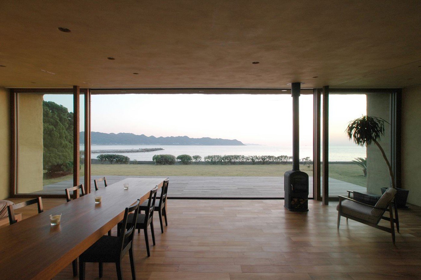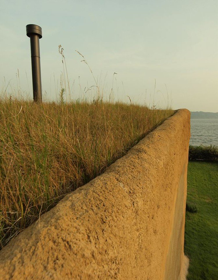 Those familiar with Japan will know that Chiba’s natural beauty is equivalent to Tokyo’s city excitement. Hiroshi Nakamura of NAP Architects draws from a hands-on, tactile experience of shaping the rich soil of Chiba’s ground as inspiration for House C. In fact, House C was commissioned by a Tokyo urbanite who wanted a getaway from the noise and a respite with the earth. Though not quite a vacation, the resident family of three chipped in the construction process as they helped cover the basic building structure with Chiba’s soil for both insulation and protection from erosion. Tufts of grass grow on the roof of the home, and make the entire residence seem like a friendly monster poking its head up from the earth after a gentle slumber. The house opens up to the sea, with one entire wall dedicated to a view over the rolling waves and endless horizon. Columns frame the picturesque scenery, and the minimal furniture inside the house creates an expanse within that matches the vastness of the open sky. A wooden veranda of the house extends its arms toward the water, encouraging its owners to do the same.