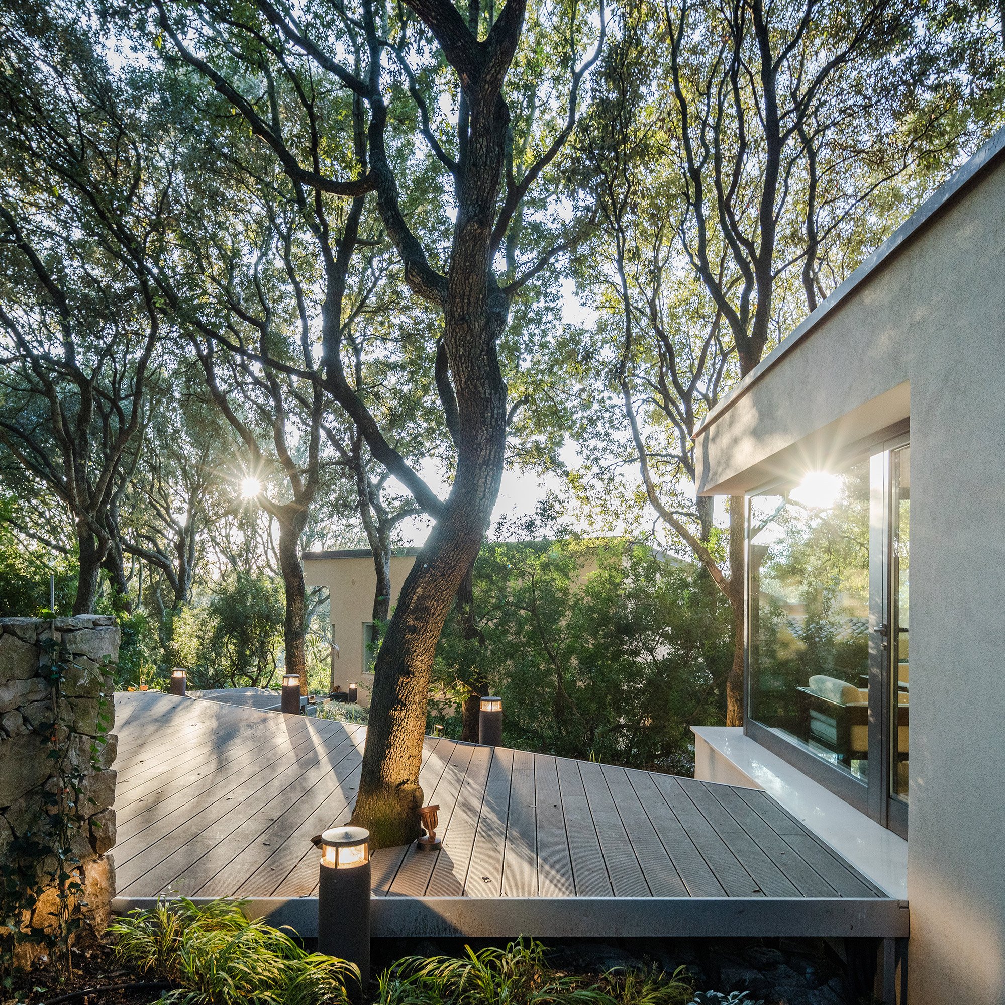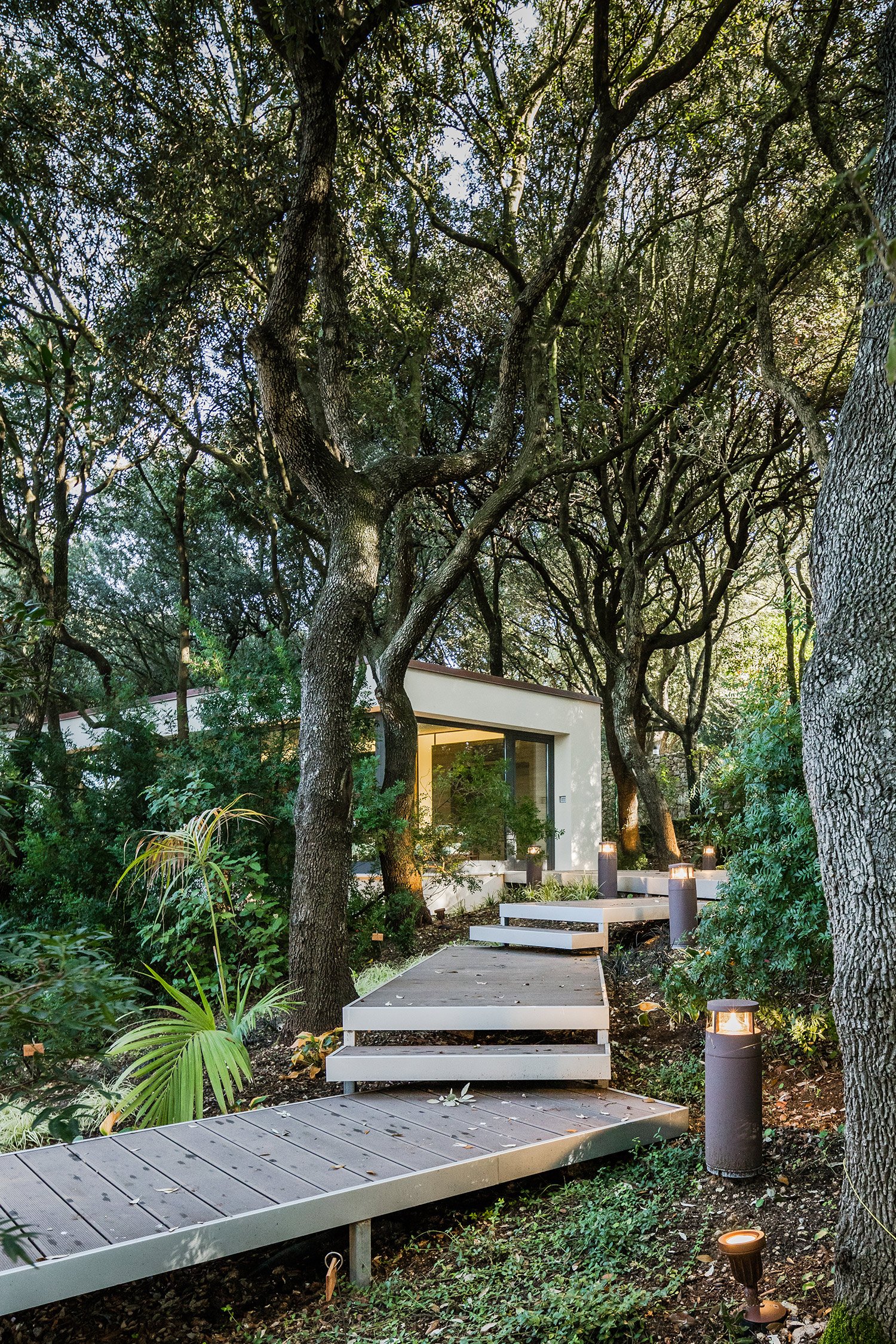 Casa nel Bosco, or the House in the Woods, is a small annex to a larger private home, both nestled in a beautiful oak forest in Sassari, Sardinia, Italy. The orthogonal structure was designed by Officina29 Architetti studio with the goal to perfectly preserve the location and to integrate the extension into the natural landscape.