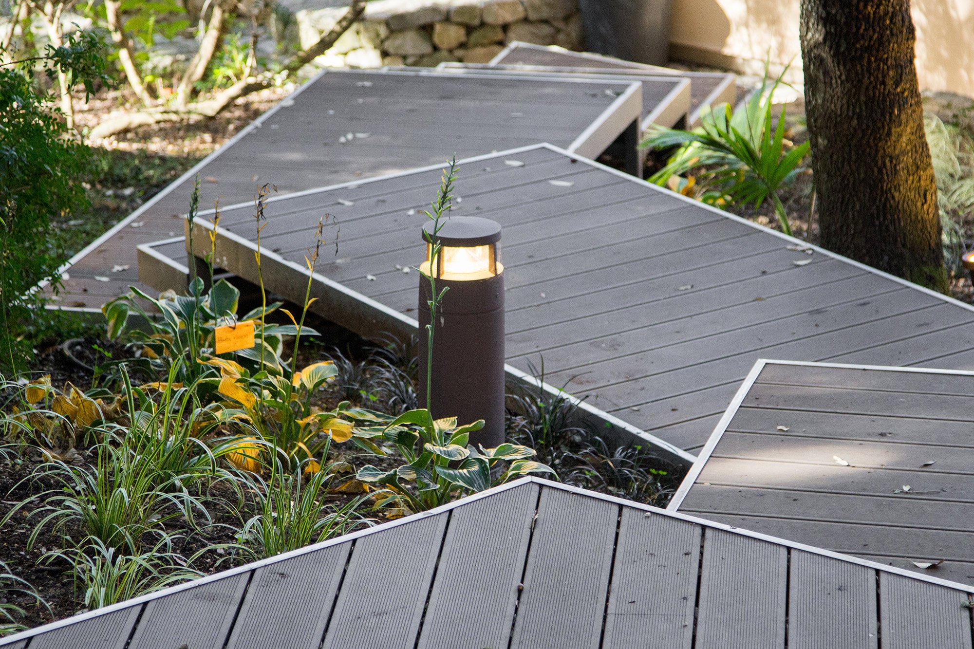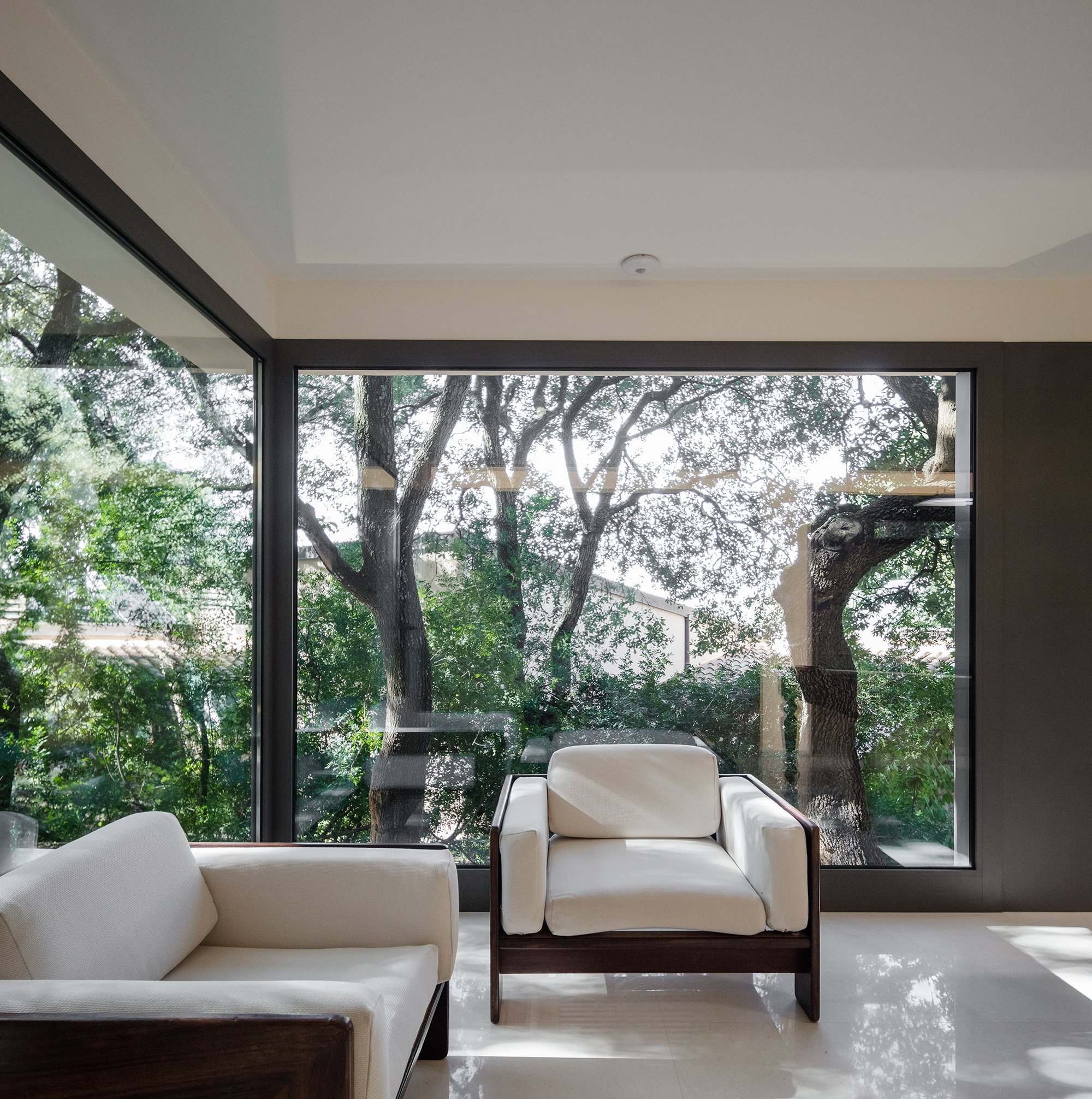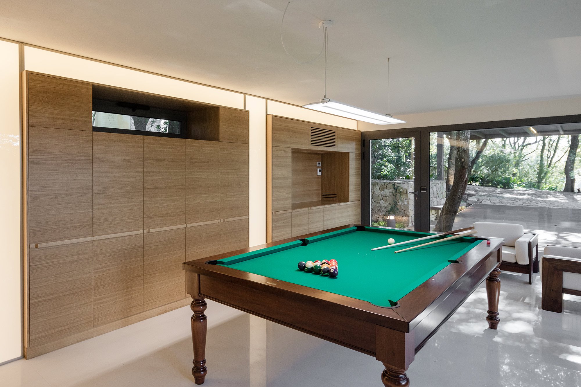 Crucially, no trees have been cut to make room for the structure, and the whole house is suspended on reinforced concrete pillars, allowing the ground, plants, and roots to remain completely unperturbed. The floating design also provided a convenient solution to adjust the elevation of the house on the steep slope. Wooden platforms and stone steps lead towards the entrance, with trees integrated in the deck area. The annex is deliberately designed with a smaller height and scale, to contrast the imposing trees. Expansive windows let the natural light come through and give the owners a gorgeous view of the majestic forest, while also helping to create a powerful link between the interior and the outdoors. A partitioned space allows the owners to transform the game room into a living room, while a kitchenette, a bathroom and bedroom act as the perfect area for guests, offering complete privacy away from the main house. A small terrace provides a great relaxation space, and just like the interior it allows a direct connection to the surrounding natural landscape and the tranquil forest. Photography by Joao Morgado.