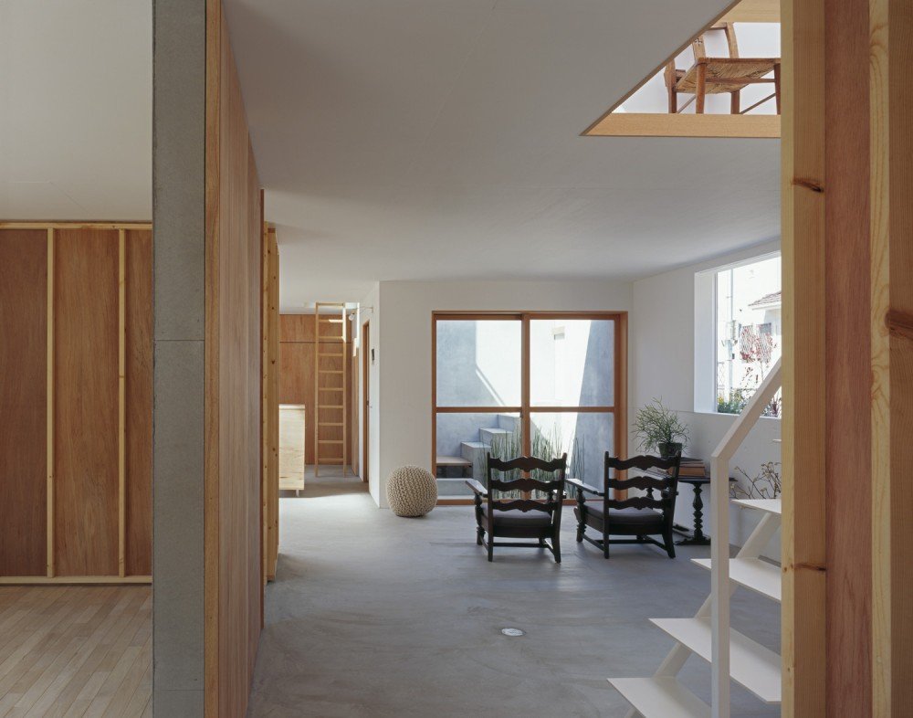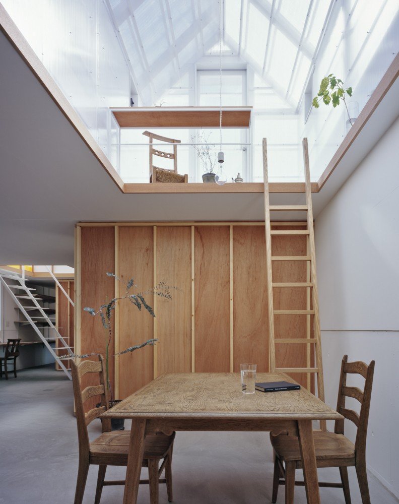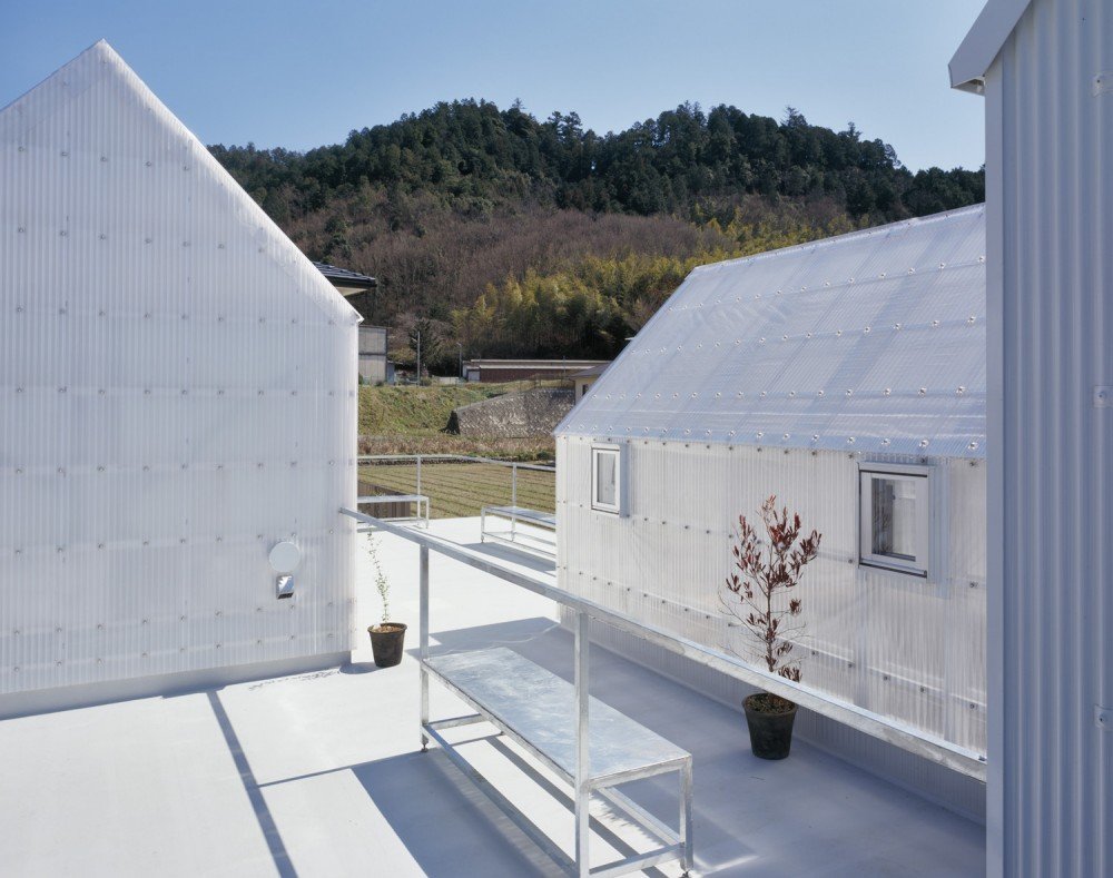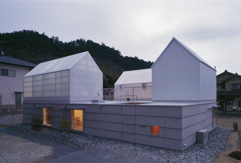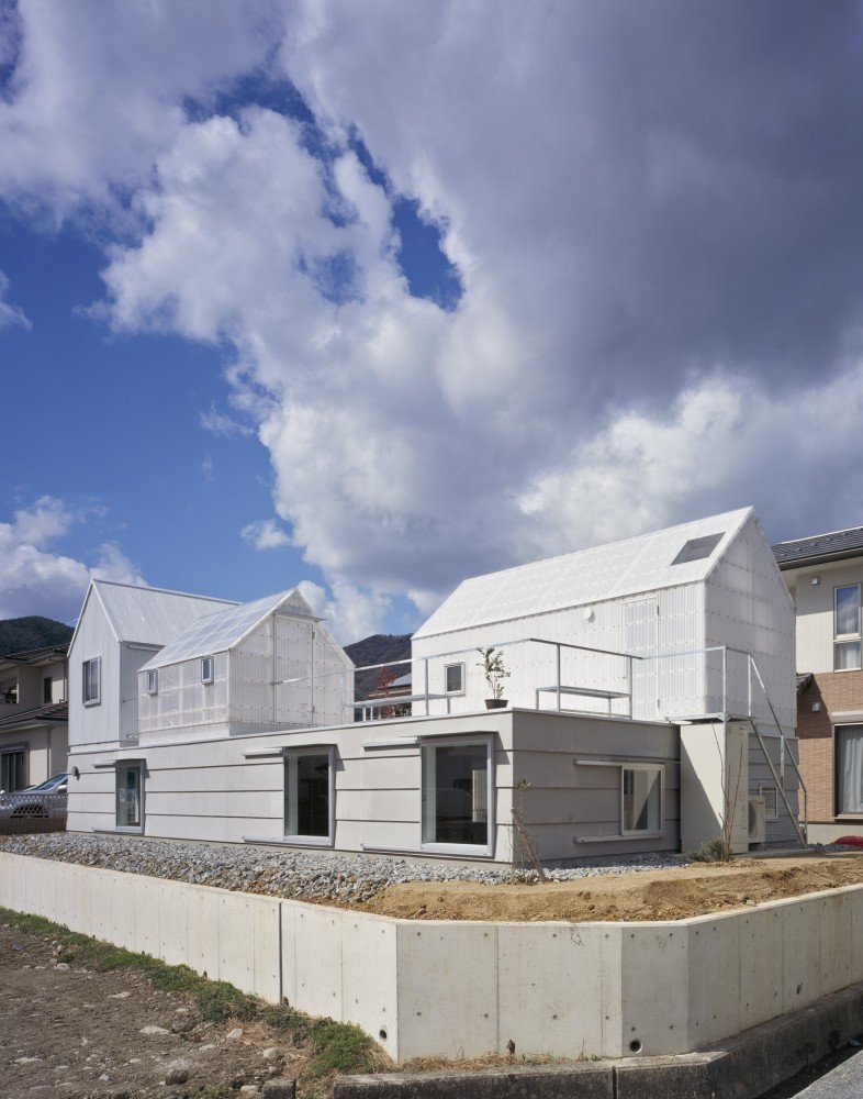 At the corner of a street in Hyougo Prefecture in Japan sits what appears to be three separate, semi-translucent house forms. However, these three mini-houses are all part of House in Yamasaki, a residence designed by Tato Architects. The primary floor of the house is a slab that lies below, with an open plan and white, ladder-like staircases that lead to a second floor underneath the house-shaped forms and exit to the rooftop patio and garden. The translucency of the skin creates a skylight effect, allowing sunlight to penetrate the house’s volume. White plaster and wooden walls complement the cheery ambiance of the residence, which bears accents of golden yellow by means of a gossamer privacy curtain, and the illumination of the house’s interiors.