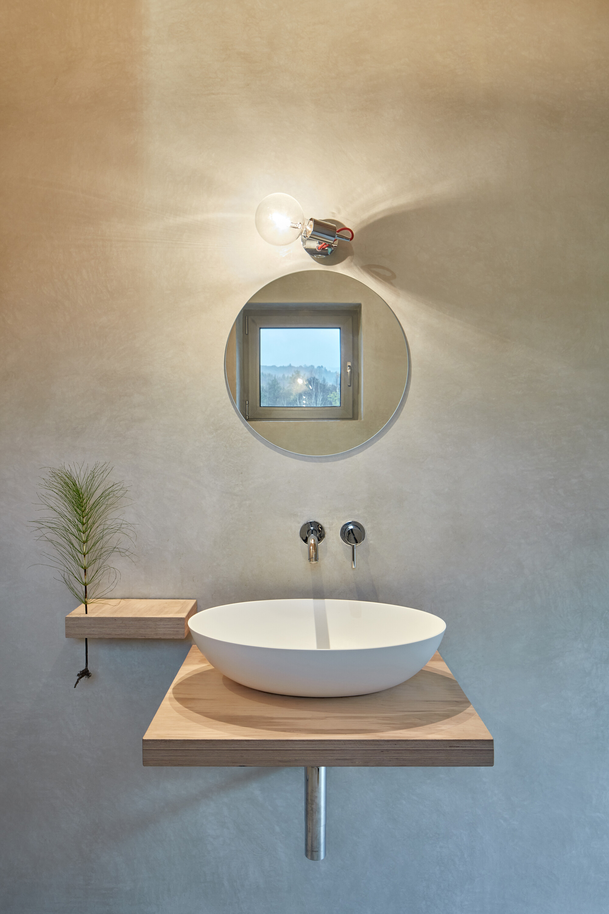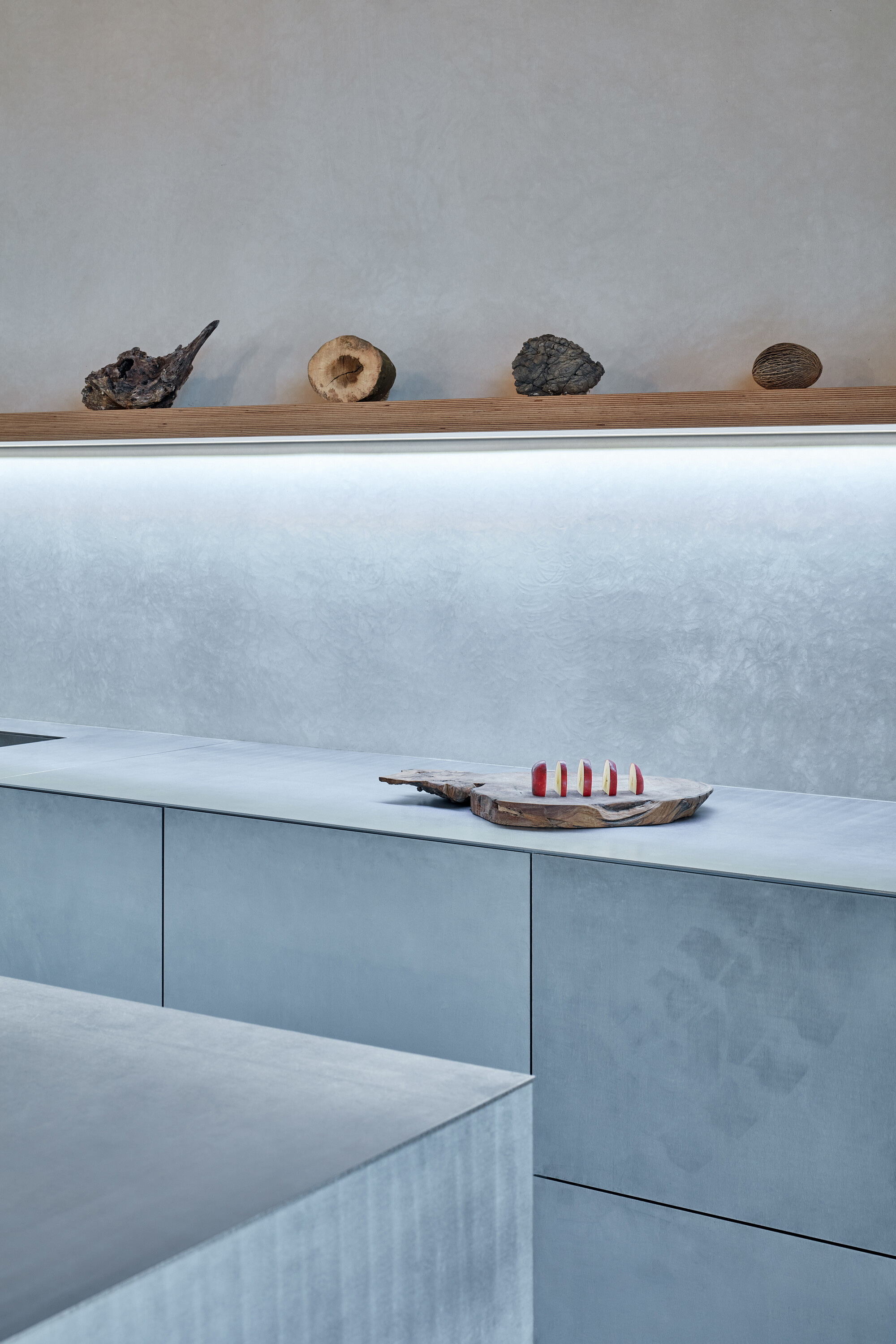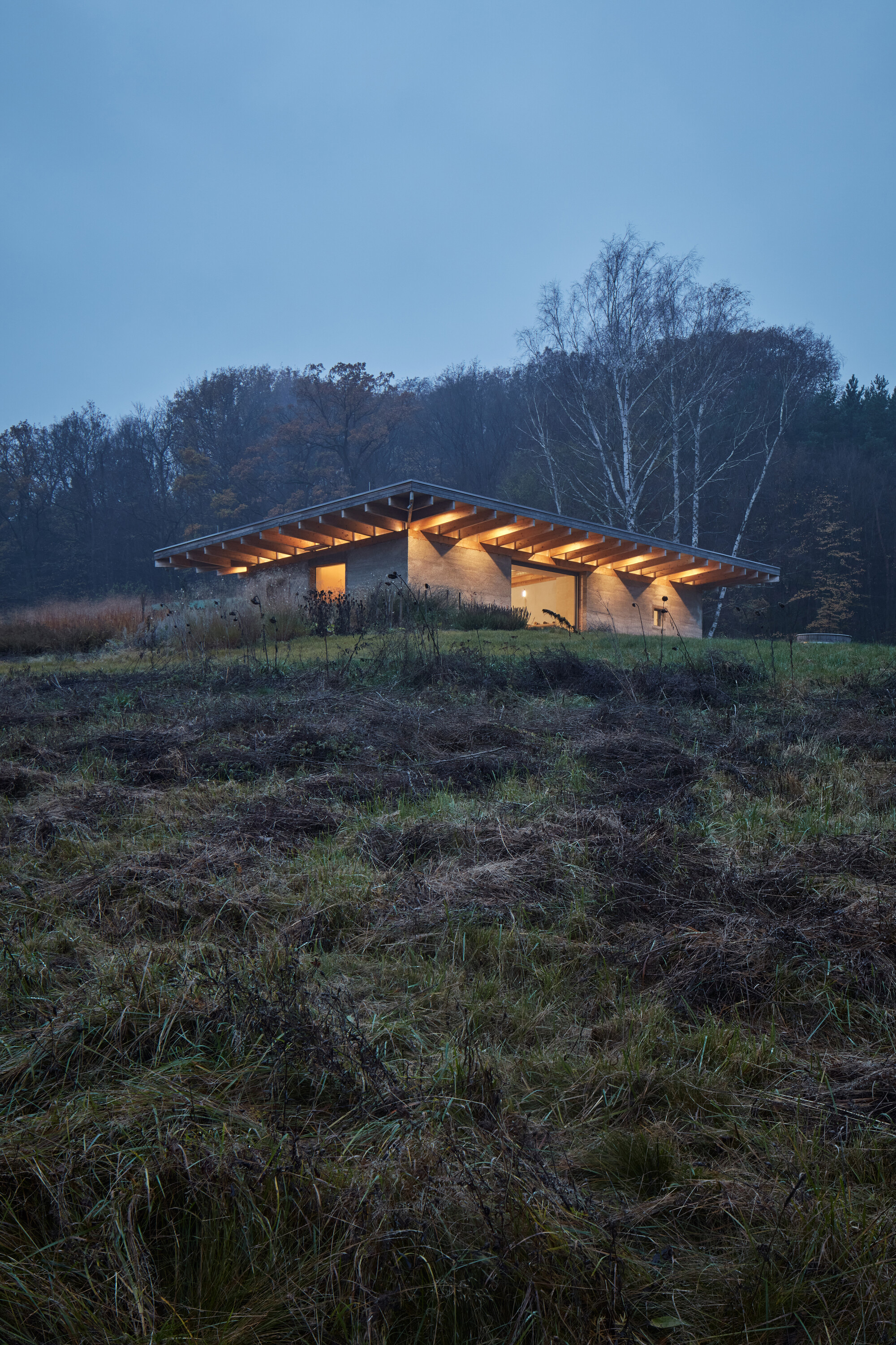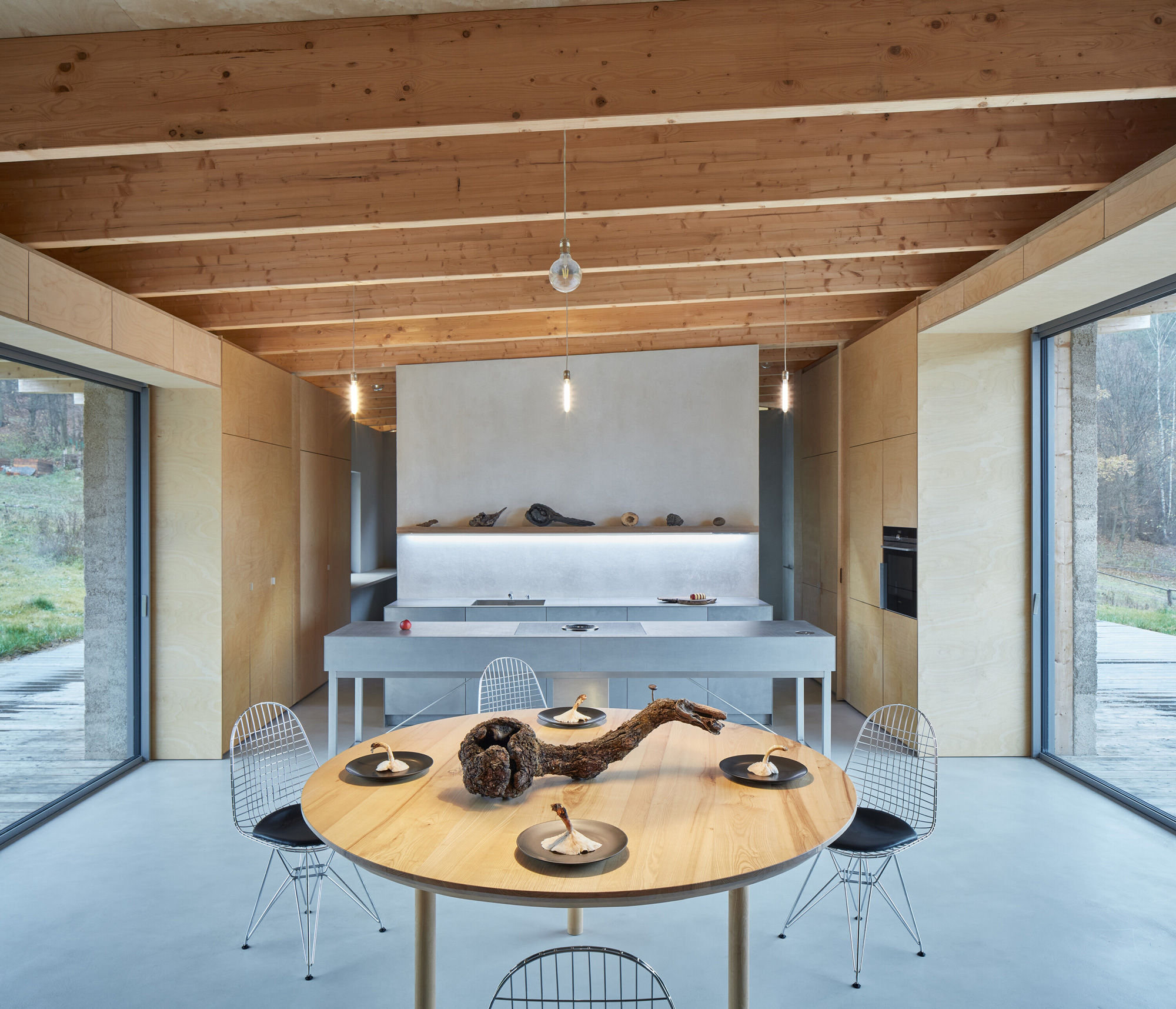 The house has two bedrooms and a bathroom with a sunken concrete bath as well as a kitchen with an intimate dining space in the center. In the concrete cellar, there’s a darkroom where the client can develop his photos in the evenings. This level also contains technical facilities, a lounge area, and storage spaces. The architect designed a porch that wraps around the house underneath large roof overhangs. This sheltered outdoor space allows the client to spend more time outdoors while admiring the surrounding landscape. Designed with flexibility in mind, the house will become a family home, then a summer retreat, and finally a home for an elderly couple. Photography© BoysPlayNice.