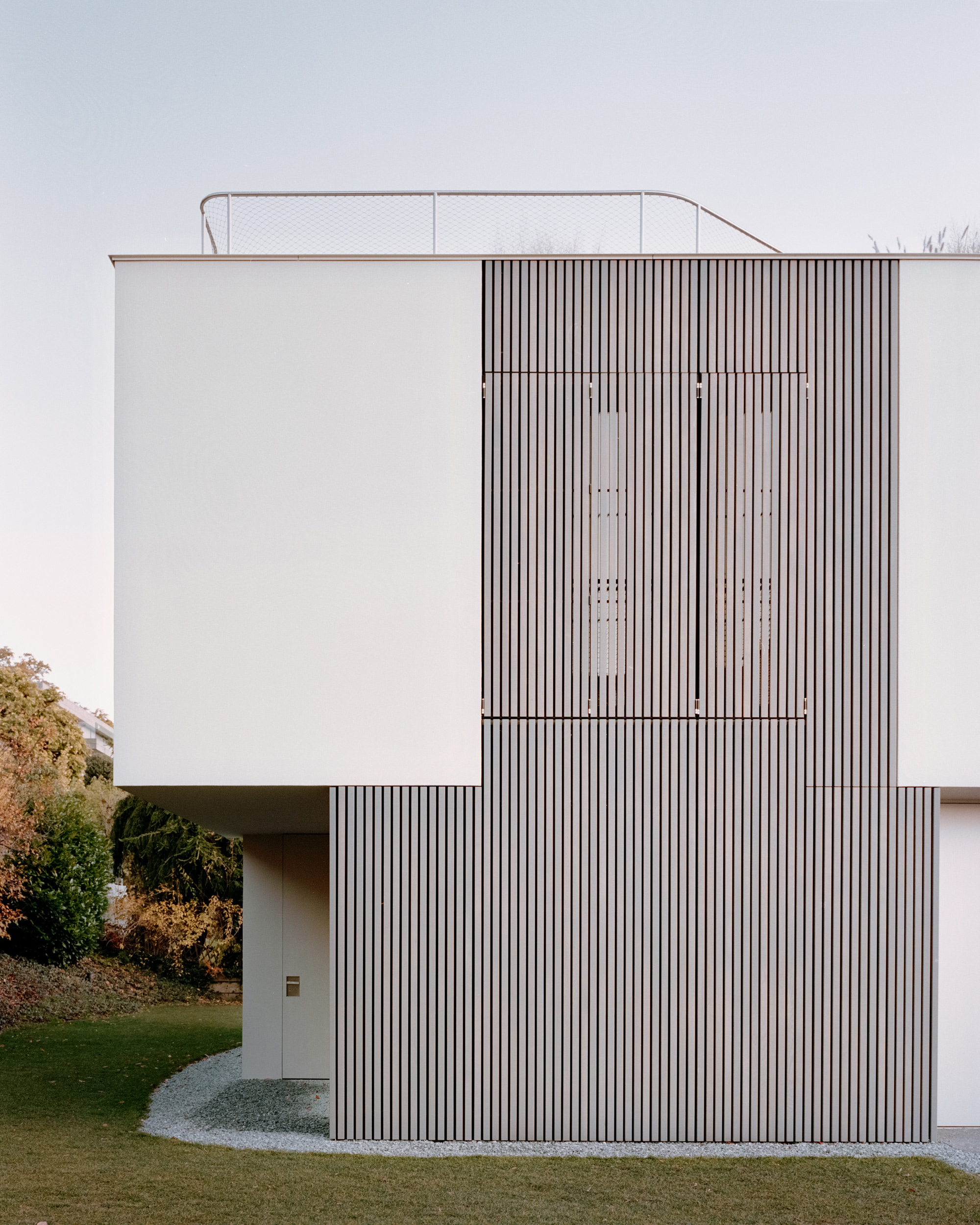 A minimalist house designed with three slightly offset volumes.