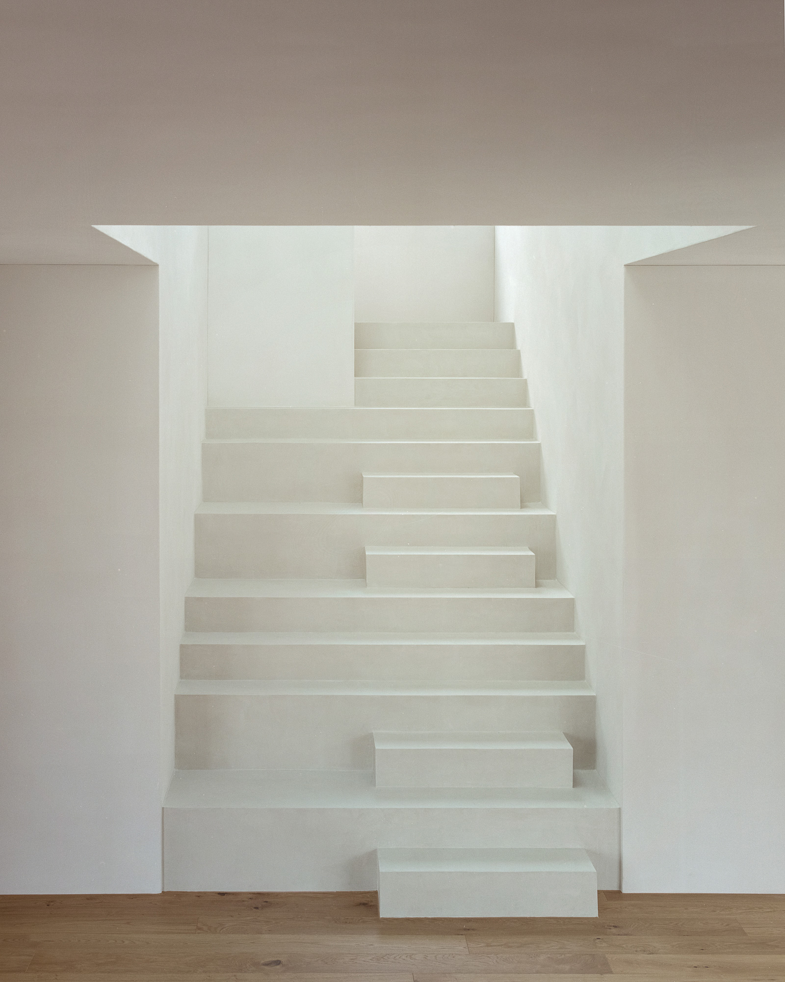 The studio placed the main living spaces on the ground floor, along with an office. Organized in a cross shape, this level features a two-story high hall that becomes the heart of the house. This opening features a circular skylight that brightens the living spaces. A wide staircase leads to the upper level where the architects designed a flexible space. The core central hall separates the children’s rooms from the parent’s suite. Windows open to views of the surroundings and bathe the interiors with natural light. The staircase also gives a nod to the offset design of the main volumes, with steps that jut forward to create a dynamic rhythm. Following the minimalist style of the exterior, the living spaces boast clean, angular lines, white walls and warm timber flooring. Photographs © Simone Bossi.