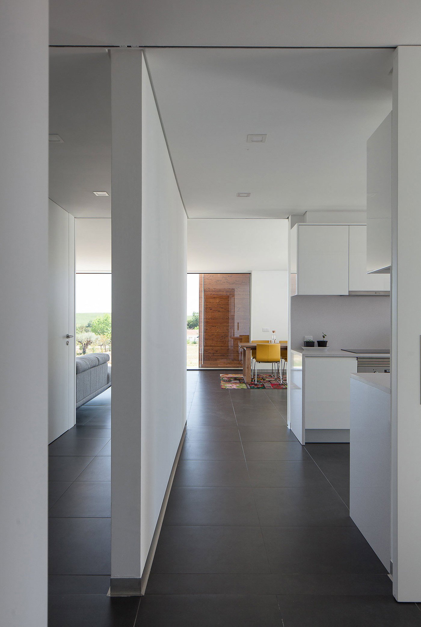Inside, a kitchen, bathroom, and service area separate the north corridor from the bedrooms, lounge and outdoor spaces. On the south section of this weekend retreat, the bedrooms provide peace and quiet away from the road. Stepping outside, the owners can enjoy complete privacy while relaxing on the terrace or taking a swim in the pool. The minimalist aesthetic of the exterior continues throughout the house; white walls as well as gray flooring complement modern furniture in neutral colors. Large windows welcome the rural landscape inside and also bring the inhabitants closer to nature. Photographs© José Campos.