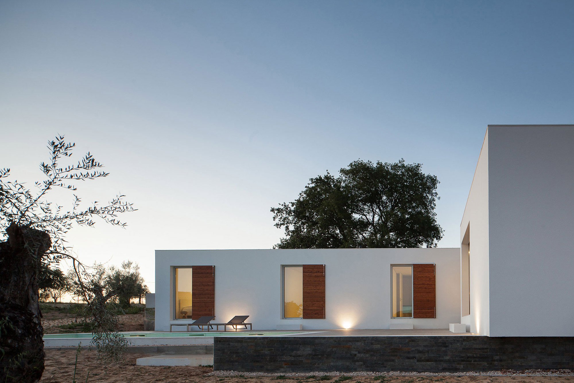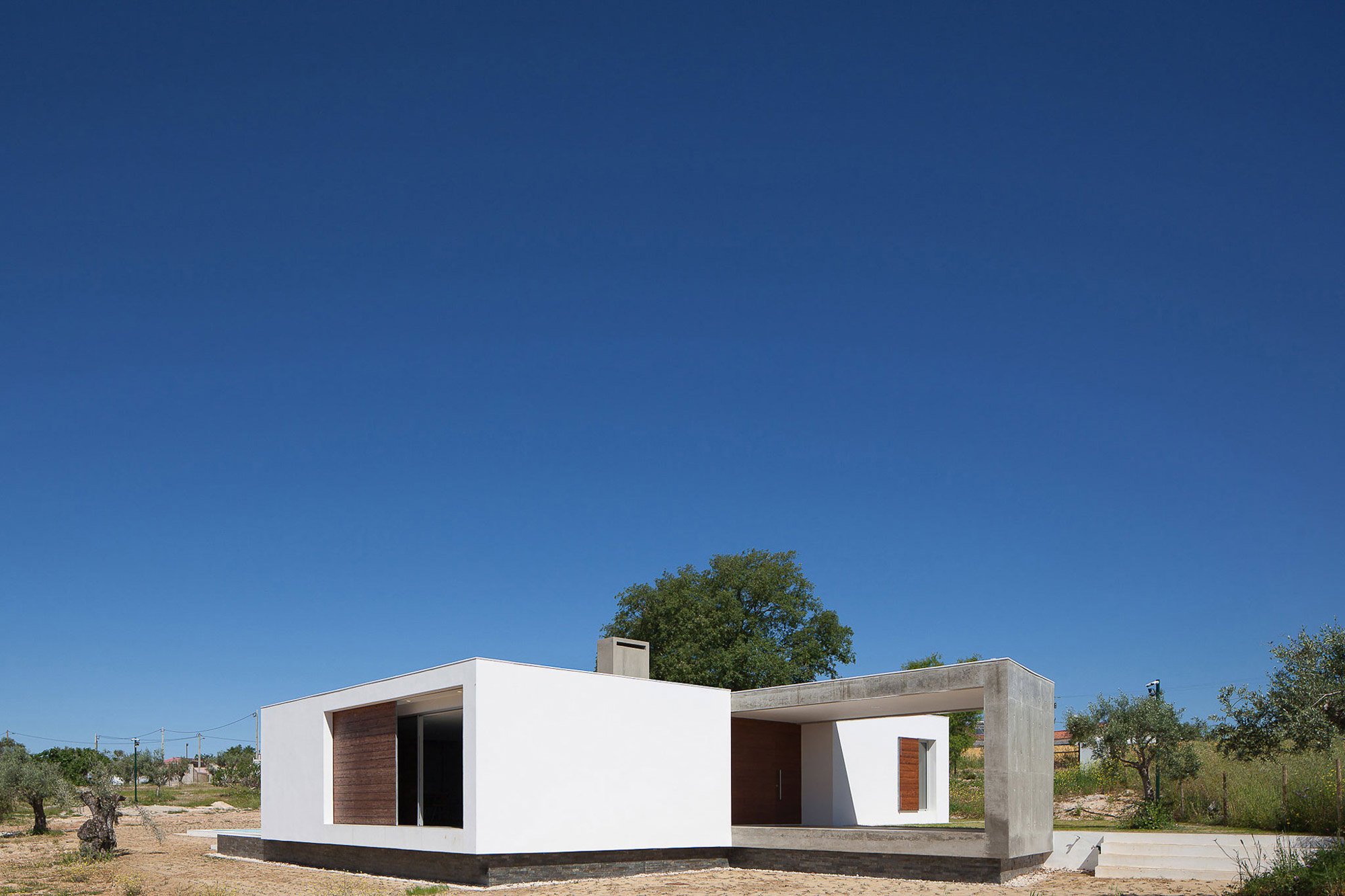 Designed by Vasco Cabral + Sofia Saraiva Architects as a weekend home for a family of four, House in Santarém has a distinctive urban character that effortlessly blends into a traditional, rustic setting. The minimal design aims to complement the natural landscape of Santarém, Portugal, while also clearly defining the three separate areas of the building. As a one-story house, the structure integrates beautifully among the smaller orchard trees and vegetation. A gentle slope provides privacy for the outdoor areas. At the same time, it helps to create a stronger connection between the interior and nature.