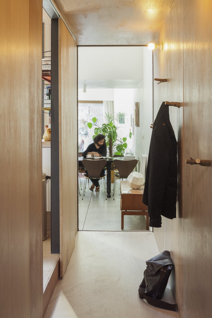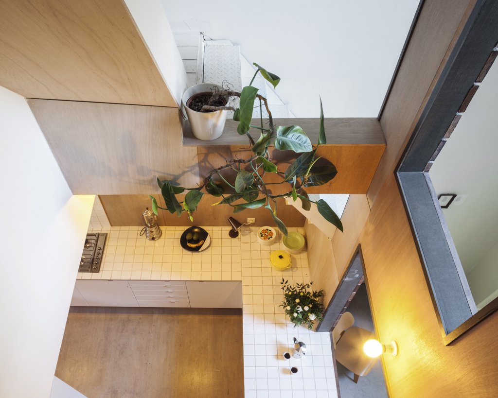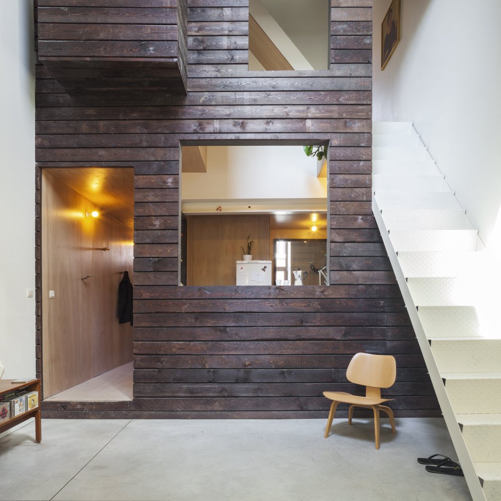 Like a present wrapped inside another present, House Tijl&Indra features a house within a house. The extension to the residence in Gent, Belgium takes the formal appearance of a planked façade, which becomes an unexpected presence in the home’s white interiors. Studio Atelier Vens Vanbelle chooses to play up this juxtaposition and continues the unconventional use of material by lining the walls of his mini-house (actually hiding a raised kitchen and a pseudo-balcony) with wooden panels as well. A set of functional stairs cut through the walls of the mini-house, as if to make a statement that both inner and outer are connected entities yet different spatial experiences in their own rights.