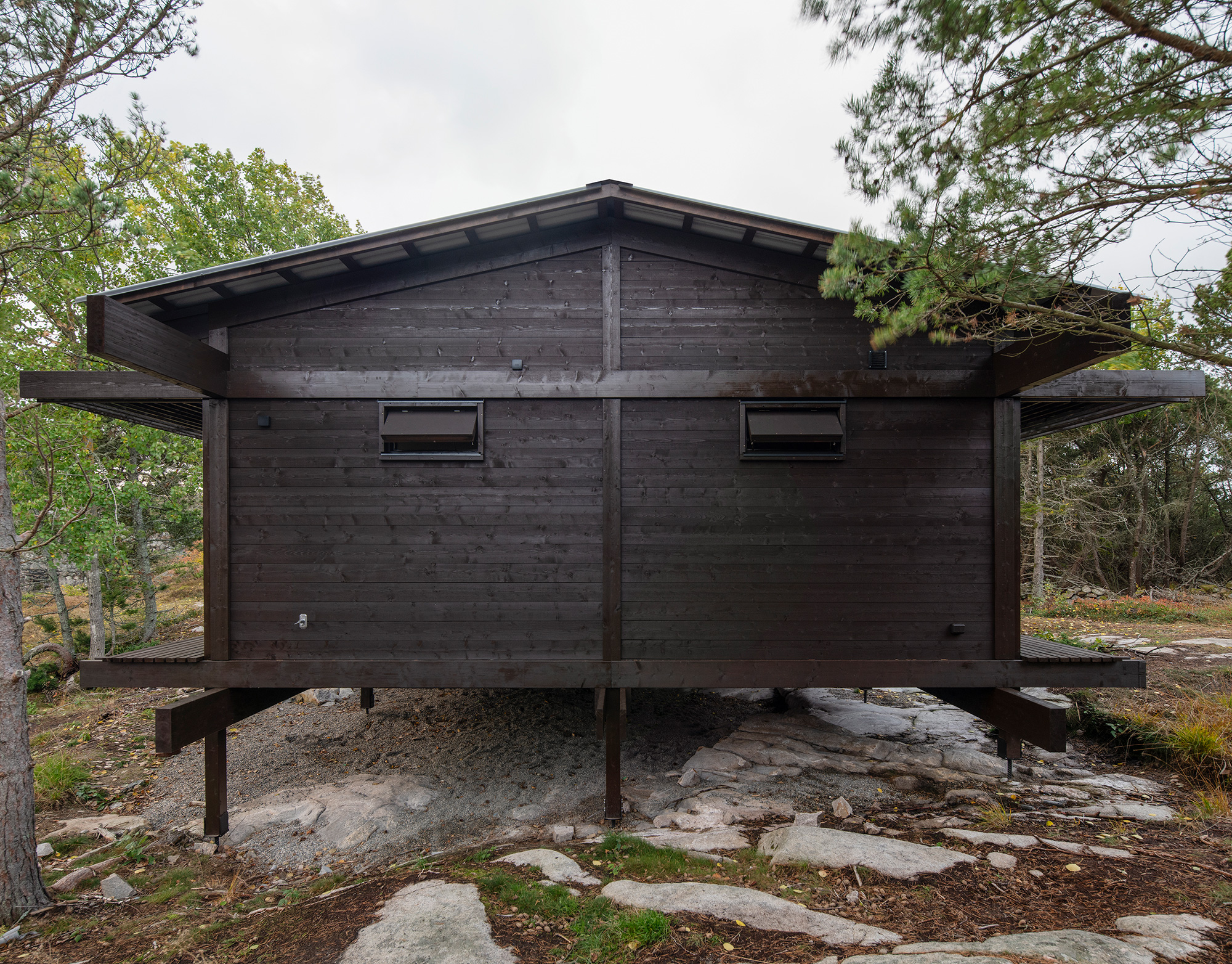 Inside the cabin, the studio used simple glulam posts and standard wooden elements found in a local store to separate areas while allowing rooms to have a visual connection with each other. Multi-functional and flexible, the interiors allow the clients to use the cabin in different ways. For example, as a weekend home or as a high-end camping base for outdoor activities. Left exposed, the interior structure gives a harmonious rhythm to the living spaces. While the exterior boasts a tar finish with a black hue, the interiors feature dark brown wood surfaces.