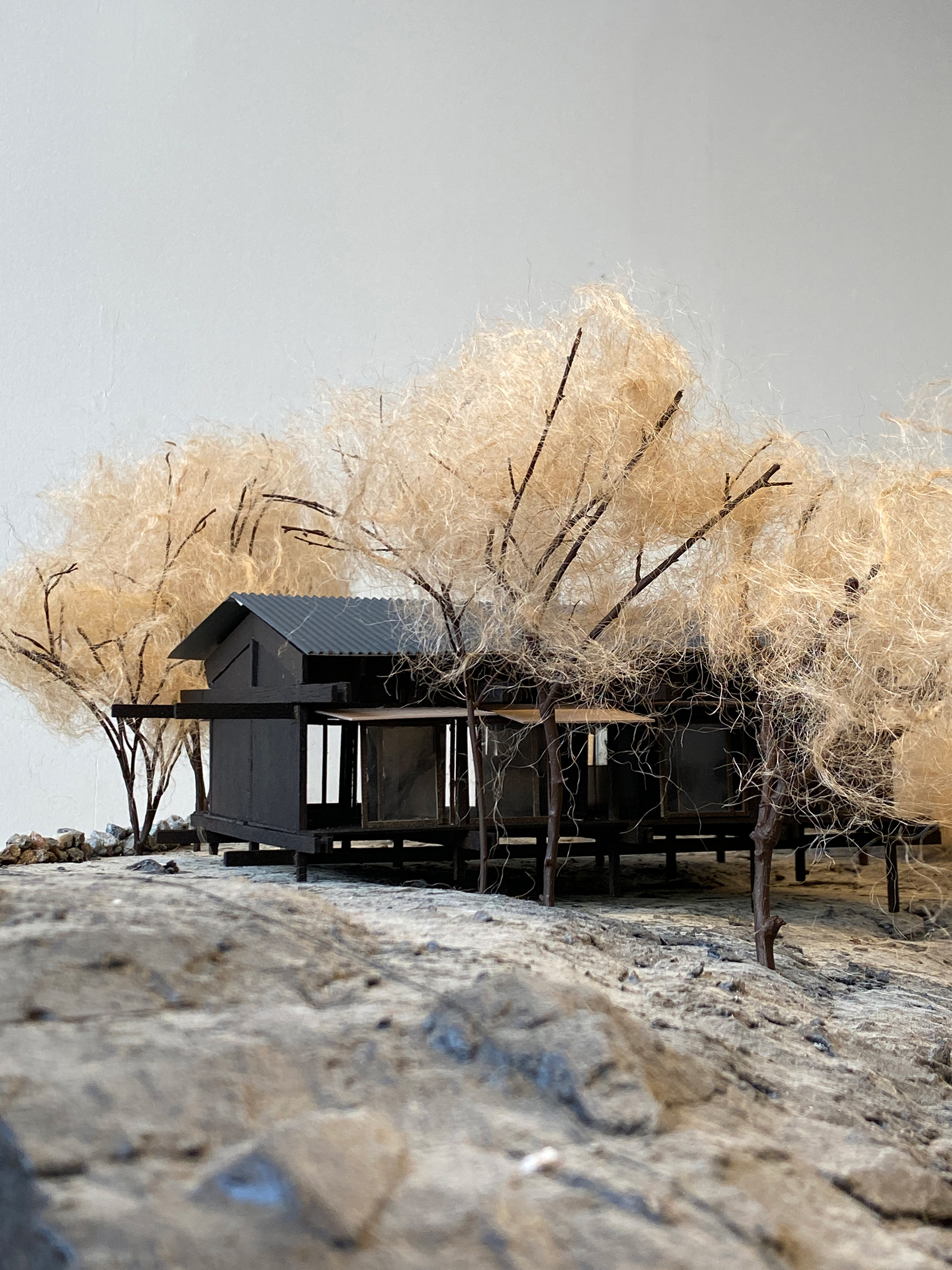 Raised on plinths to preserve the existing terrain, the black house features dark wood cladding and a low profile. Both of these design decisions help to blend it into the surrounding woodland. Full-height windows and glass doors overlook the landscape, with the latter also providing access to narrow decks. Large overhangs protect these terraces from the elements.