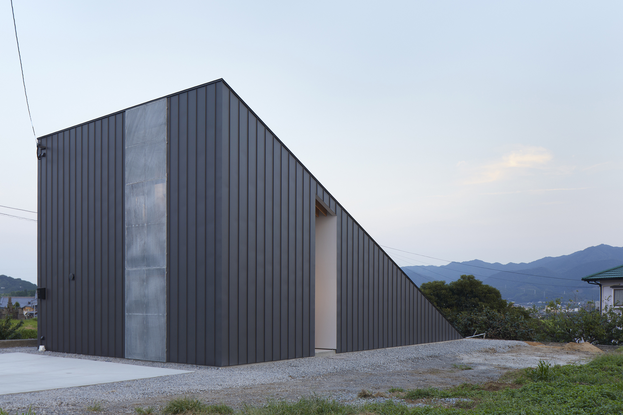 Located in a mountainous and hilly landscape in the city of Usuki, the Ōita Prefecture, Japan, this black house has an unusual shape that references the terrain. Architecture firm Kenta Eto Architects designed the family home with a wedge-like shape that not only gives a nod to the surrounding hills and mountains, but also minimizes its visual presence. The design thus transforms into an extension of the topography. The volume’s slope of 24 degrees allows the residents to climb directly on the roof/wall from the ground level. Made with a wooden frame and dark siding, the house also features large windows and skylights. The glazing brings more natural light inside while framing the views.