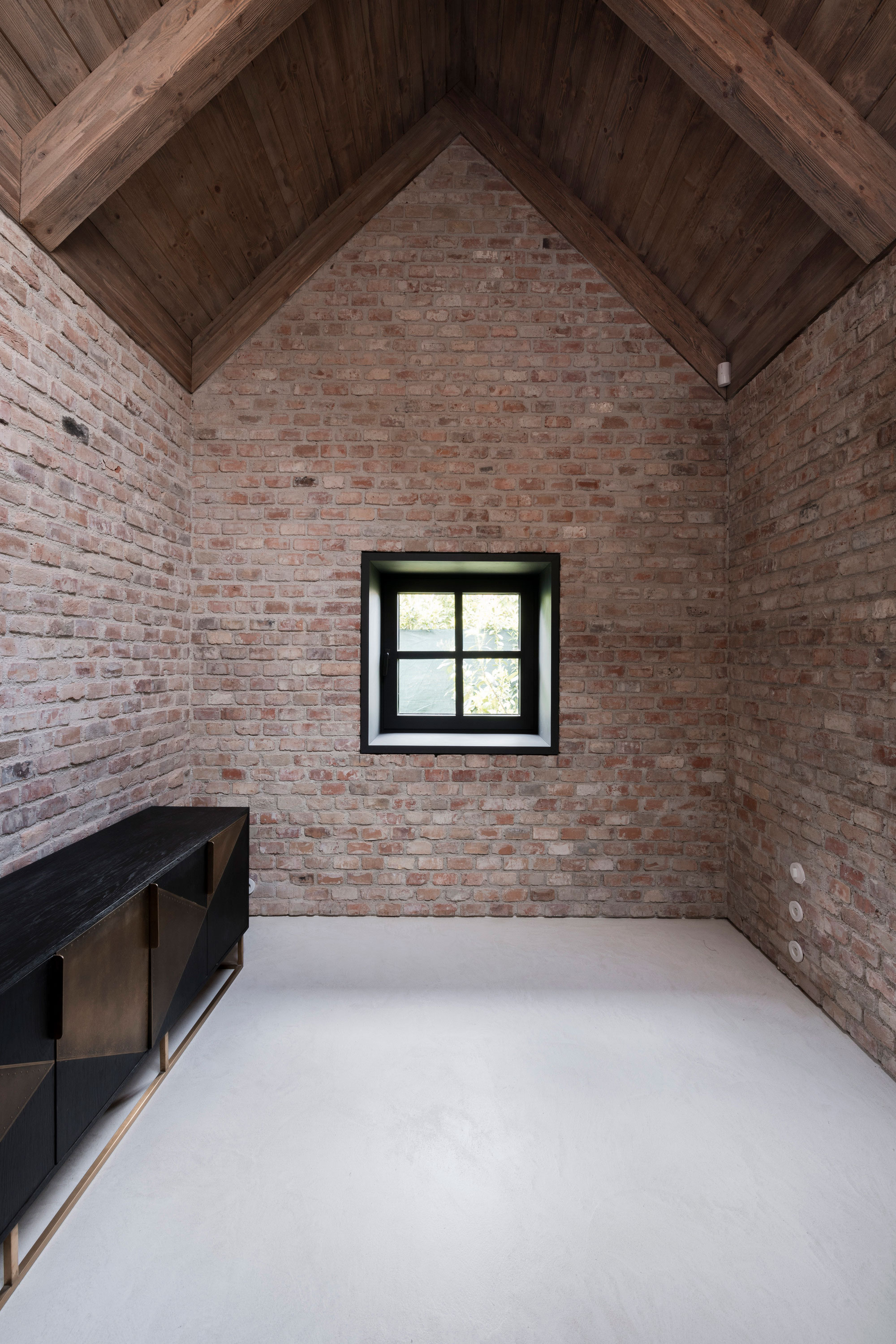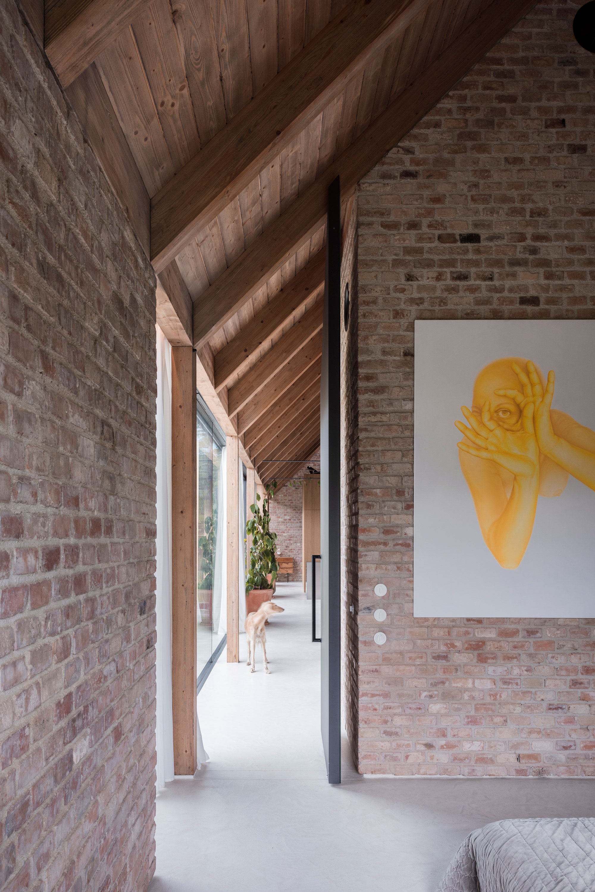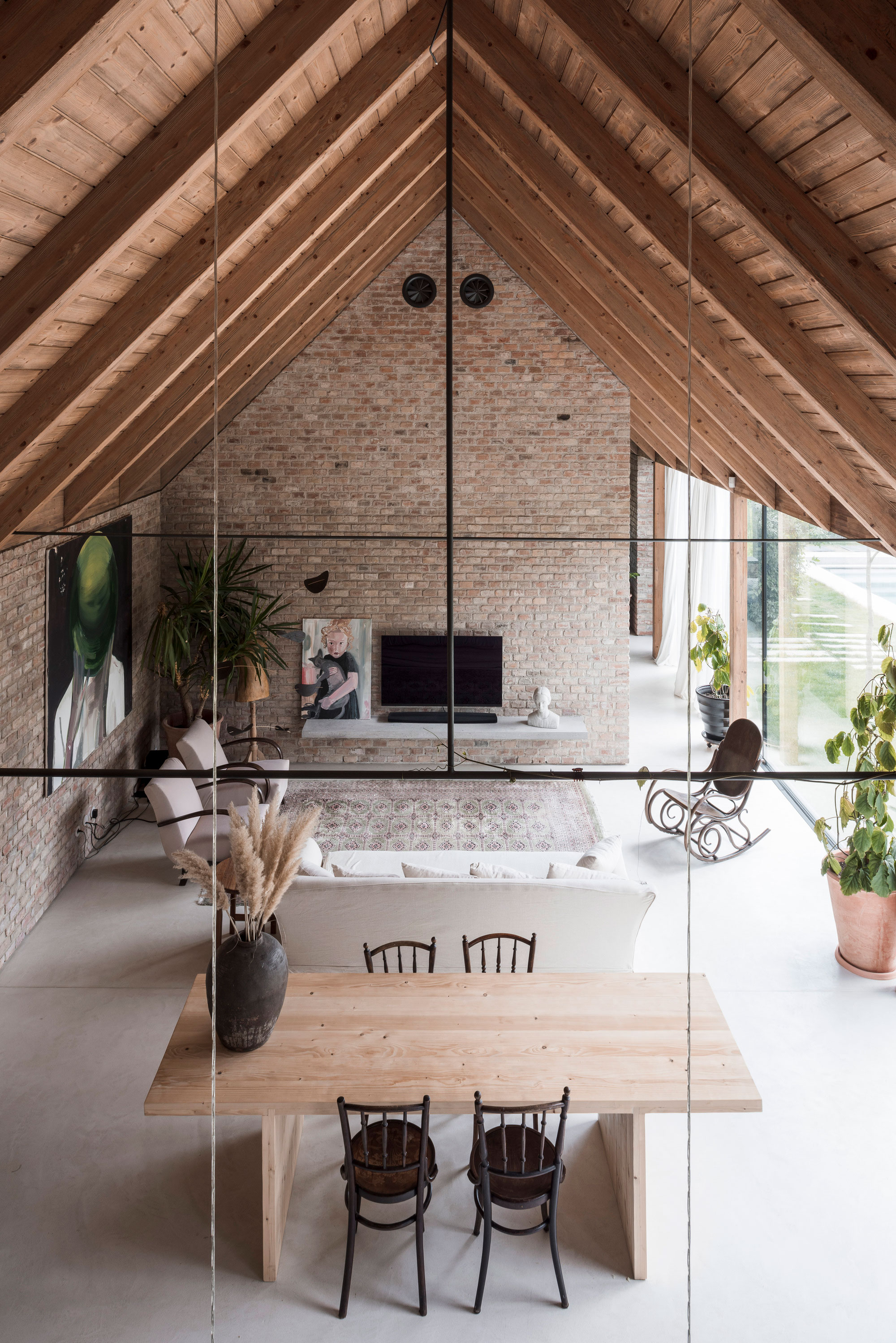 The shaping of the roof trusses allows the addition of skylights while still maintaining the continuous mass of the roof as seen from the garden. In the main living area, the double height space and the open-plan design along with the glazed wall that overlooks the garden create a welcoming and relaxed atmosphere. The studio designed the interiors with a strong rustic character but also with a contemporary twist. Both the exposed brick walls and the wooden roof and furniture bring warmth to the living spaces. At the same time, the concrete floor, designer lighting, and artworks add modern refinement to the decor. Large windows and glass sliding doors transform the garden into a part of the interior. Outside, the clients have access to a dining space and a pool. Photographs© Matej Hakár.