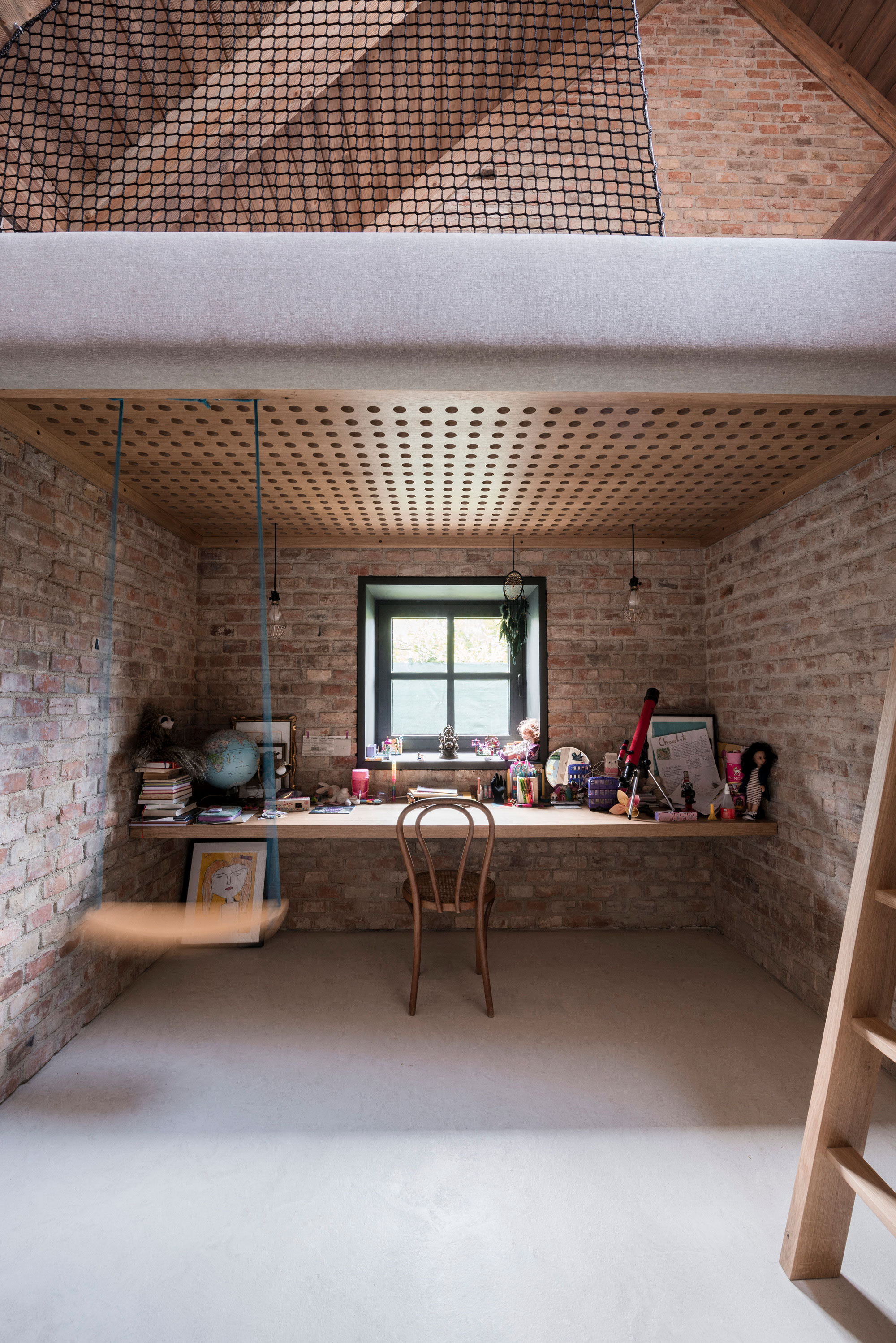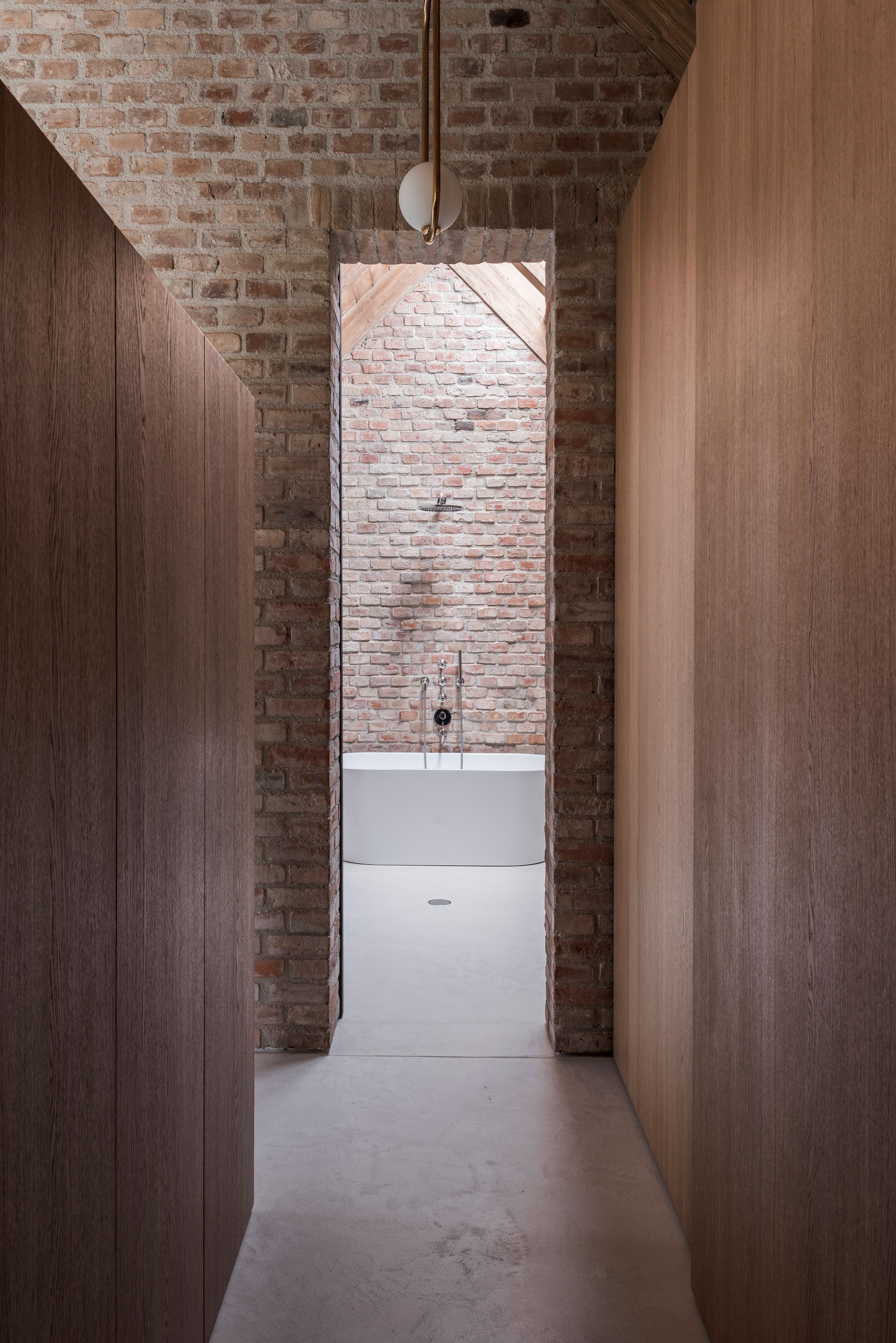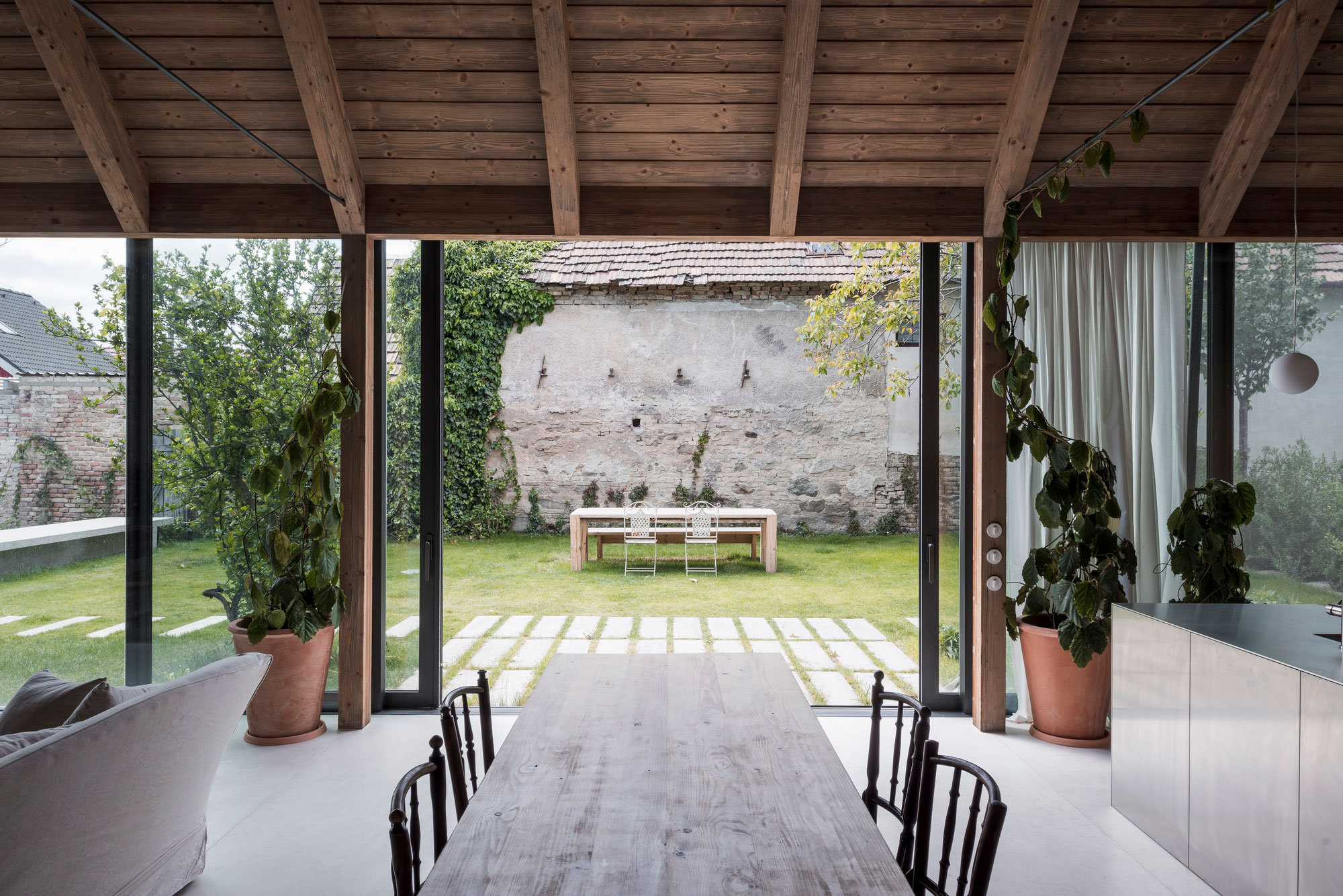 The shaping of the roof trusses allows the addition of skylights while still maintaining the continuous mass of the roof as seen from the garden. In the main living area, the double height space and the open-plan design along with the glazed wall that overlooks the garden create a welcoming and relaxed atmosphere. The studio designed the interiors with a strong rustic character but also with a contemporary twist. Both the exposed brick walls and the wooden roof and furniture bring warmth to the living spaces. At the same time, the concrete floor, designer lighting, and artworks add modern refinement to the decor. Large windows and glass sliding doors transform the garden into a part of the interior. Outside, the clients have access to a dining space and a pool. Photographs© Matej Hakár.