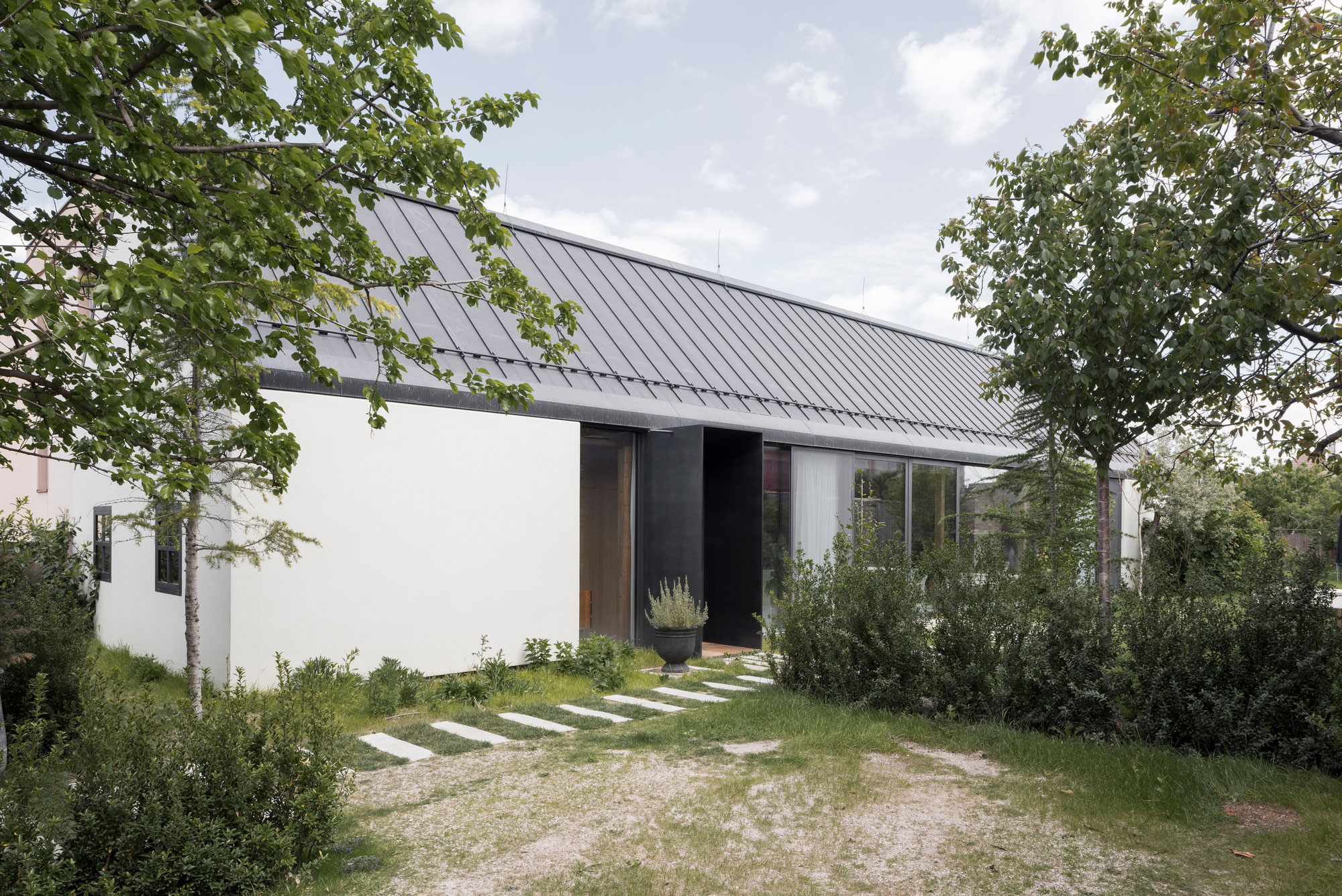 Built in the rural outskirts of Bratislava, Slovakia, House V references vernacular architecture to blend into the setting. Architect Martin Skoček designed the house with a layout that references traditional Slovak dwellings, where a central space becomes a front hall with direct access to the outdoors. While painted white on the exterior, the gabled roof volume boasts exposed brick walls and wooden surfaces throughout the interior. The new building rises from the site of an old house; it looks at home here thanks to the linear volume and the classic facade typical of the area.