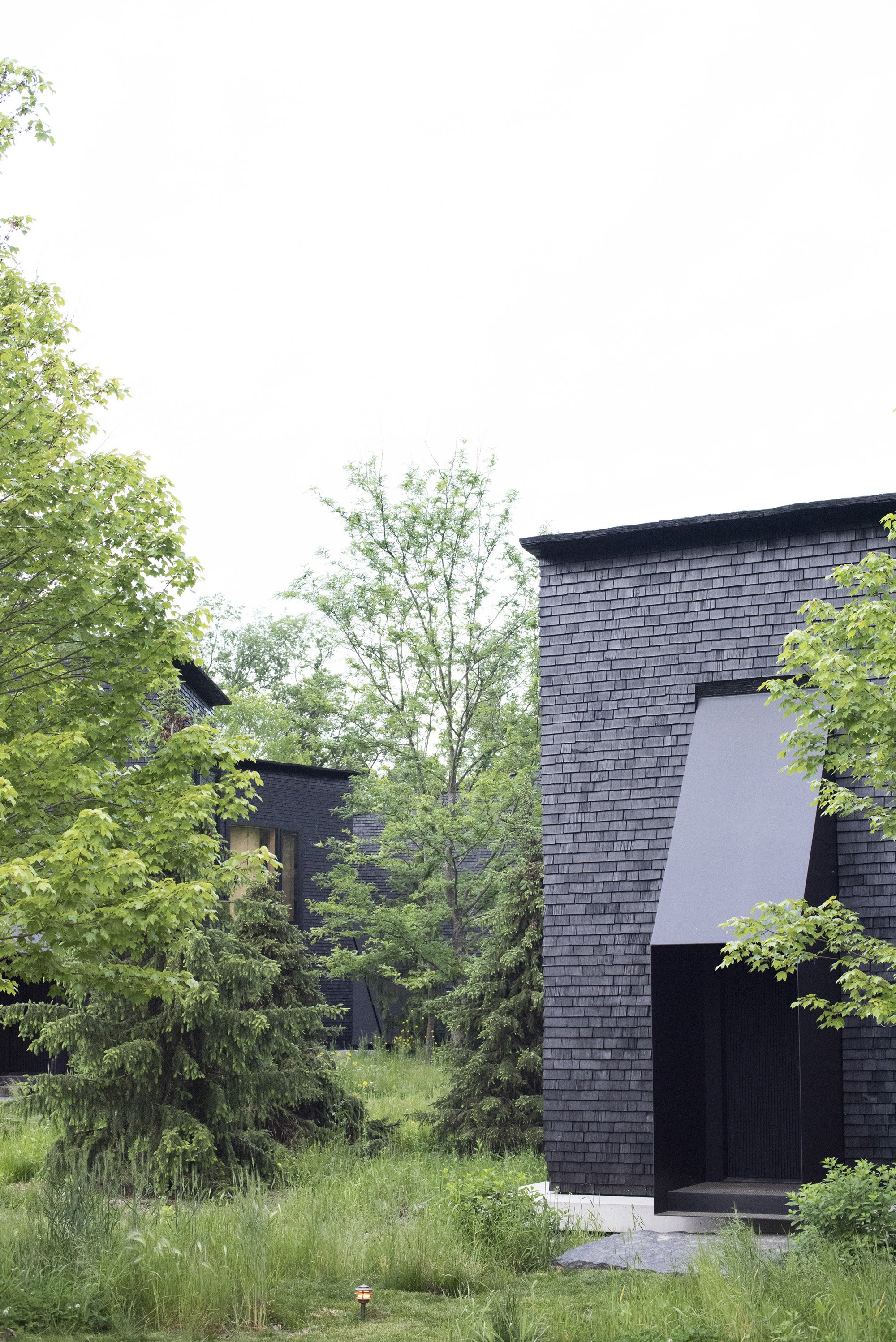 Nestled in Upstate New York, Hudson Valley House II has a serene presence in the natural landscape. NYC-based architecture firm Thomas Phifer and Partners designed this Hudson Valley cabin complex with a creative layout that separates the living spaces in different volumes, each with its own purpose. The black cabins create a central space where a garden becomes the connecting link between the rooms and the rest of the landscape. Here, native grasses, honey locust trees, and mature conifer trees surround the cabins and link them to the setting further.