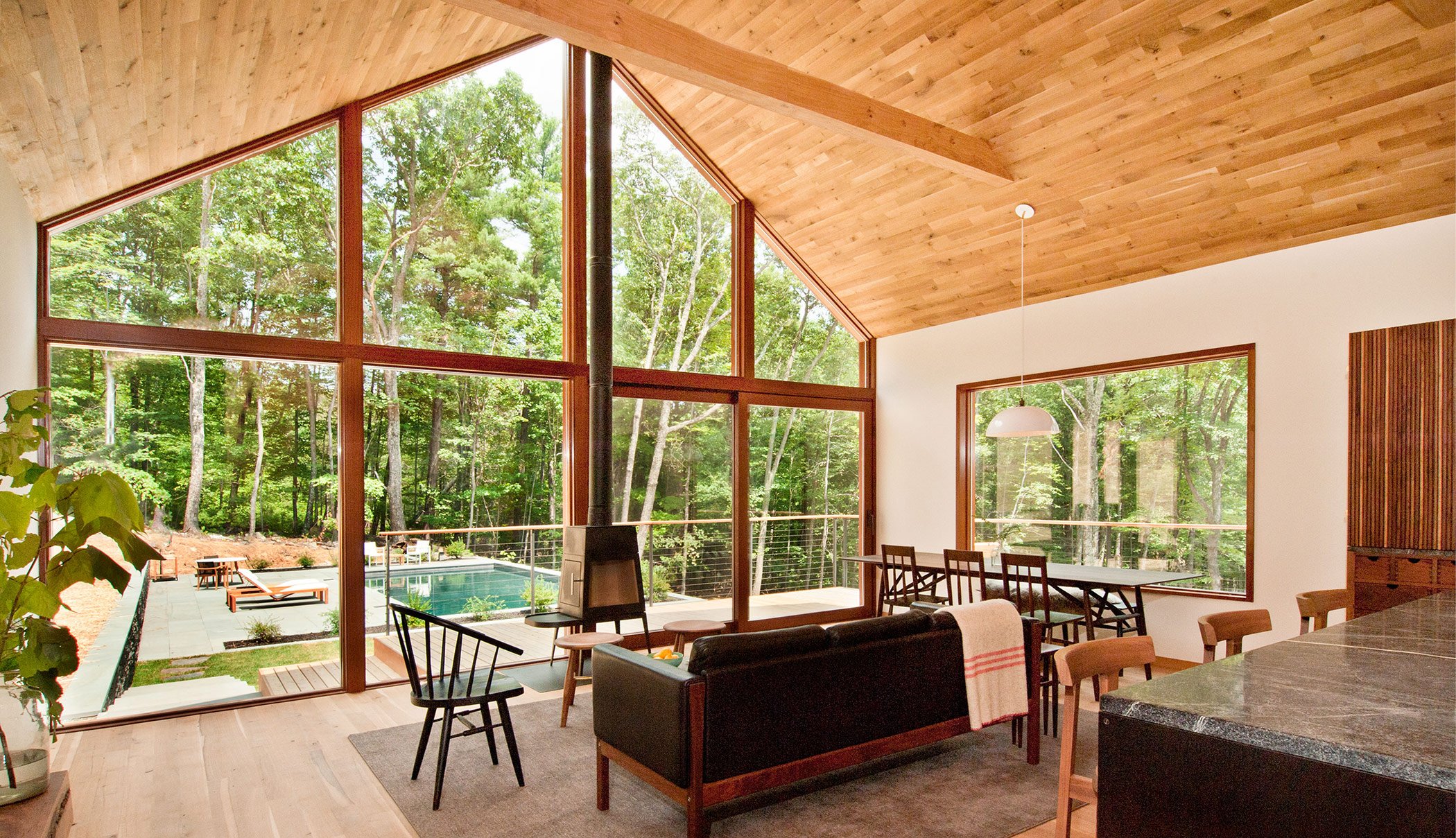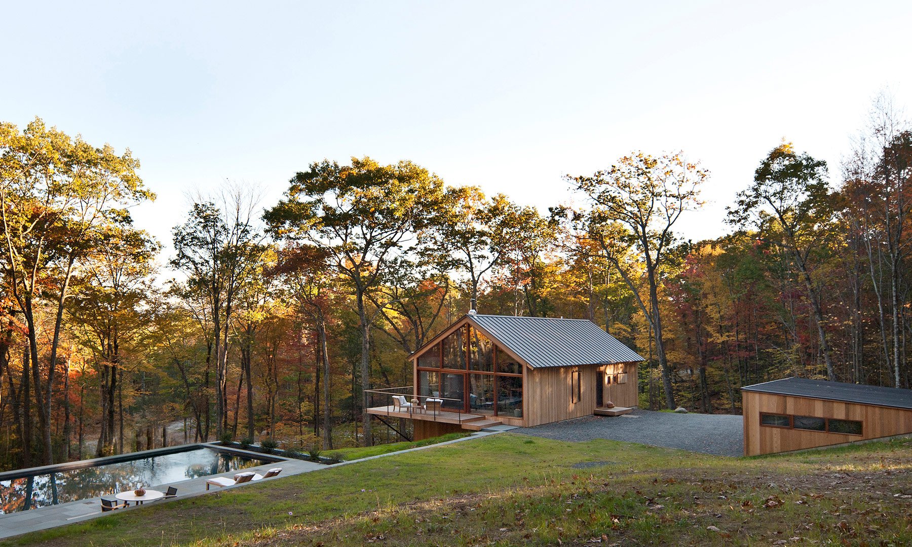Located in Hudson Valley, about 100 miles away from Manhattan, the Hudson Woods Development is a good example of the way many design studios start to create and to build on a larger scale, following a new property development trend. Here you can now find 26 homes spread across a plot of land measuring 131 acres, with woodland and vegetation maintaining a sense of wilderness. Every house has between 2.7 and 10 acres of private land, so the owners can enjoy complete privacy; every structure is also a perfect example of the “modern cabin vernacular”, blending contemporary style and warm rustic tones. Designed and built by the New York-based Lang Architecture studio, the wooden cabins provide the perfect opportunity to take a break from the busy metropolitan life, if only for a weekend. The first completed home has found an owner quickly: Drew Lang, founder of the studio and main architect for the project. The stick frame property is built on two levels; the top floor houses the master bedroom overlooking the forest, an en-suite bathroom, a kitchen with a custom-made island boasting black walnut and a soapstone countertop, and a large living room designed as an open place space offering direct access to the deck and pool area. On the ground floor, there are two other bedrooms and a utility space, along with a multi-functional den area and a garage which doubles as the family’s game room. The materials are natural and rustic, from the durable western red cedar adorning the exterior, to the rift and quartersawn white oak found in the interior. Local craftsmen were hired to add unique touches in the wooden detailing and to collaborate with the architects throughout the project on various aspects of the build. This is an environmentally friendly complex as the wood was sourced from “FSC certified four-generation family owned forest and mills”, Lang explains. But every property buyer also receives a fruit tree grove pack and access to a private vegetable garden, proving that Hudson Woods is more than a holiday retreat. It’s a place to call home. Images courtesy of Lang Architecture. Photography Deborah DeGraffenreid.