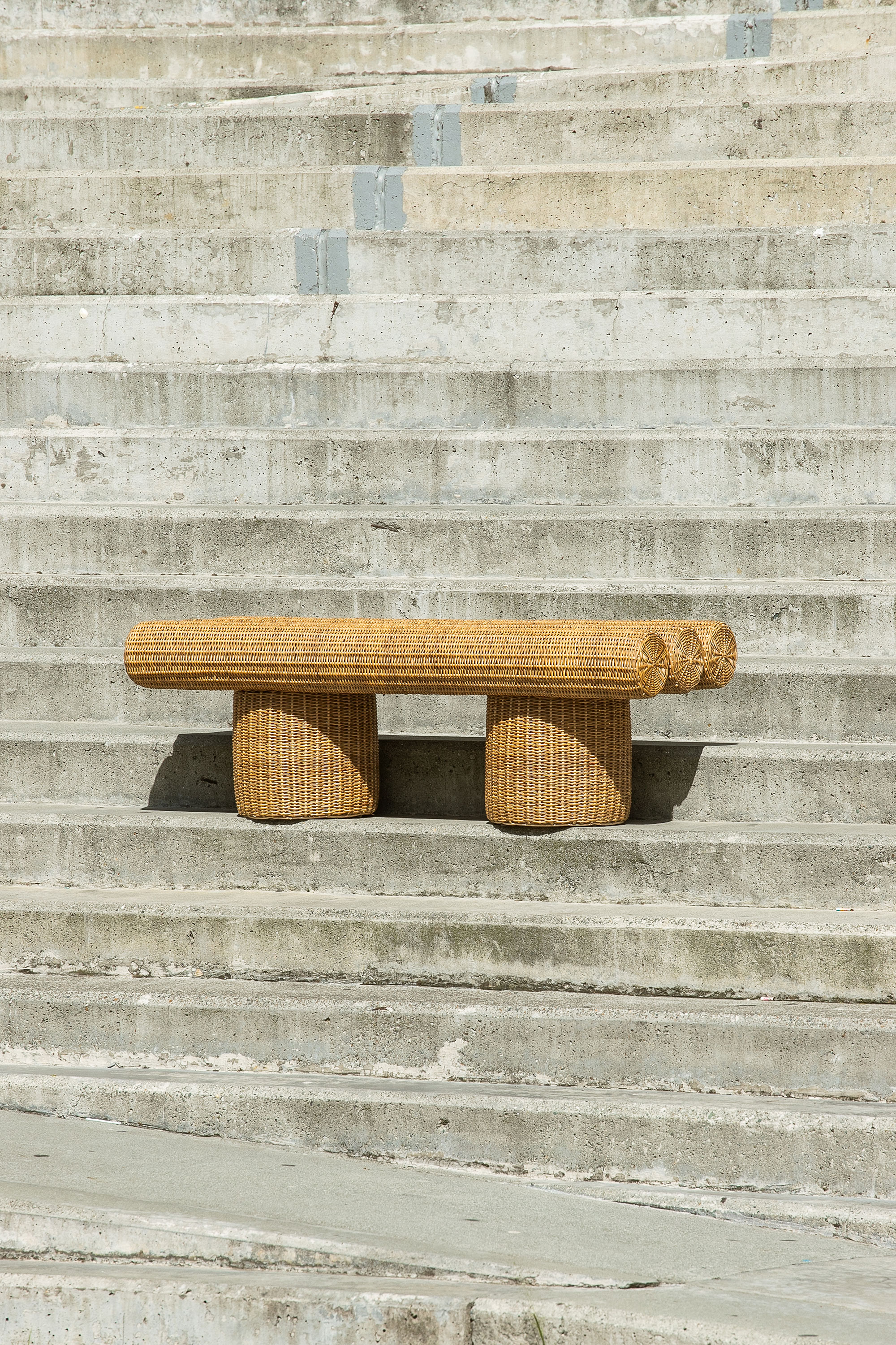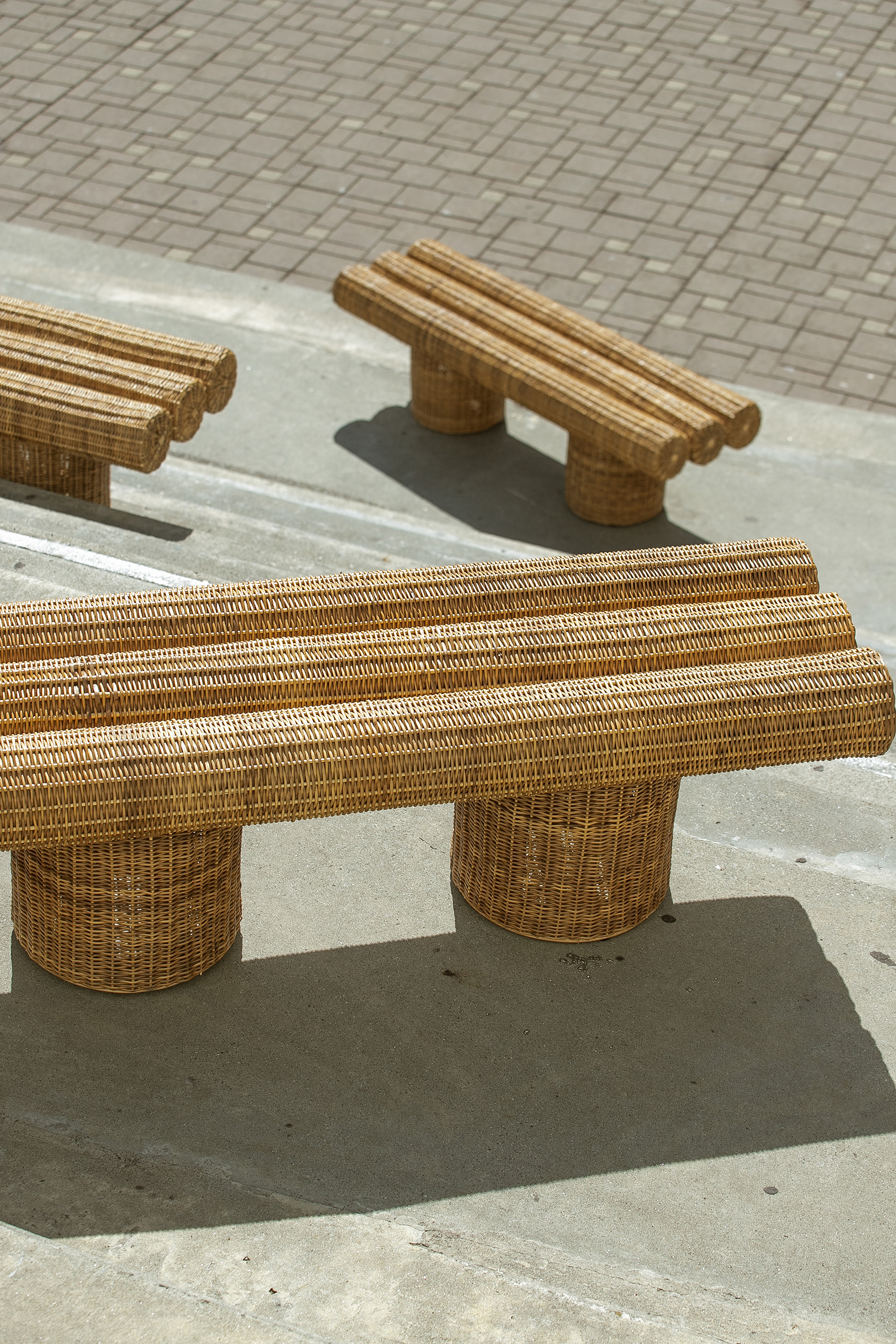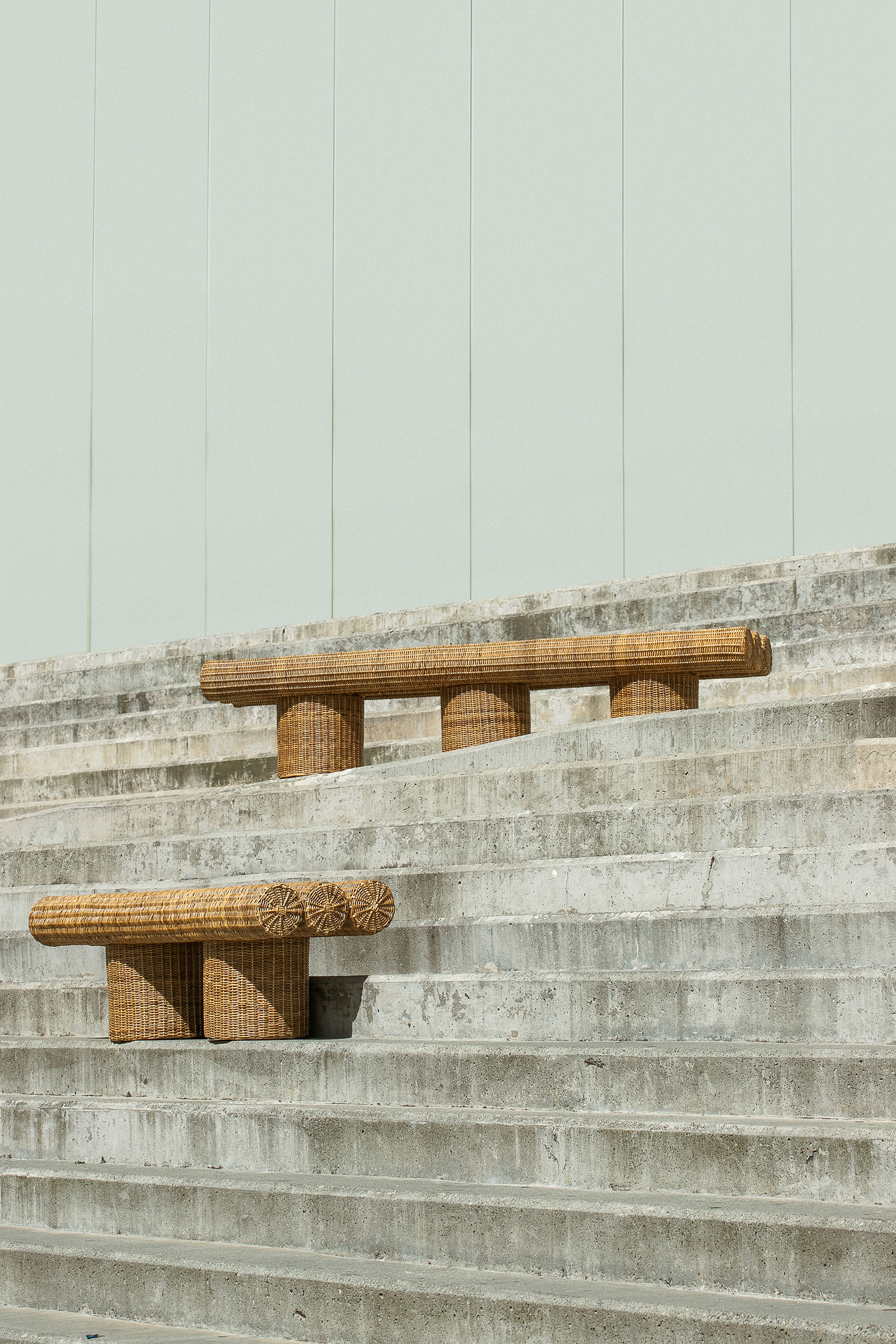 Crafted by hand, the range translates the curved and cylindrical forms of traditional timber furniture into yaré-woven geometries. The Ibuju modern wicker patio furniture series comprises a coffee table, a bench and a stool. All of them feature similar cylindrical and rounded shapes. While the coffee table has a circular top placed on crisscrossed yaré “logs”, the bench features two hefty cylinders as a base and a seat made up of three horizontal logs. As for the stool, it features two half-cylinders “stacked” on top of each other perpendicularly. An environmentally conscious alternative to solid wood furniture, this series also helps to support local communities and skilled artisans. Photographs © Juliana Gómez Quijano, Juan Silva.