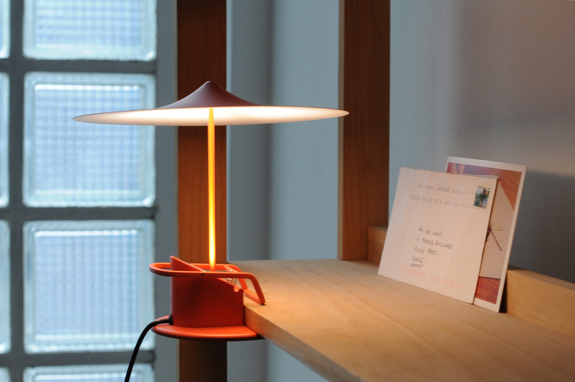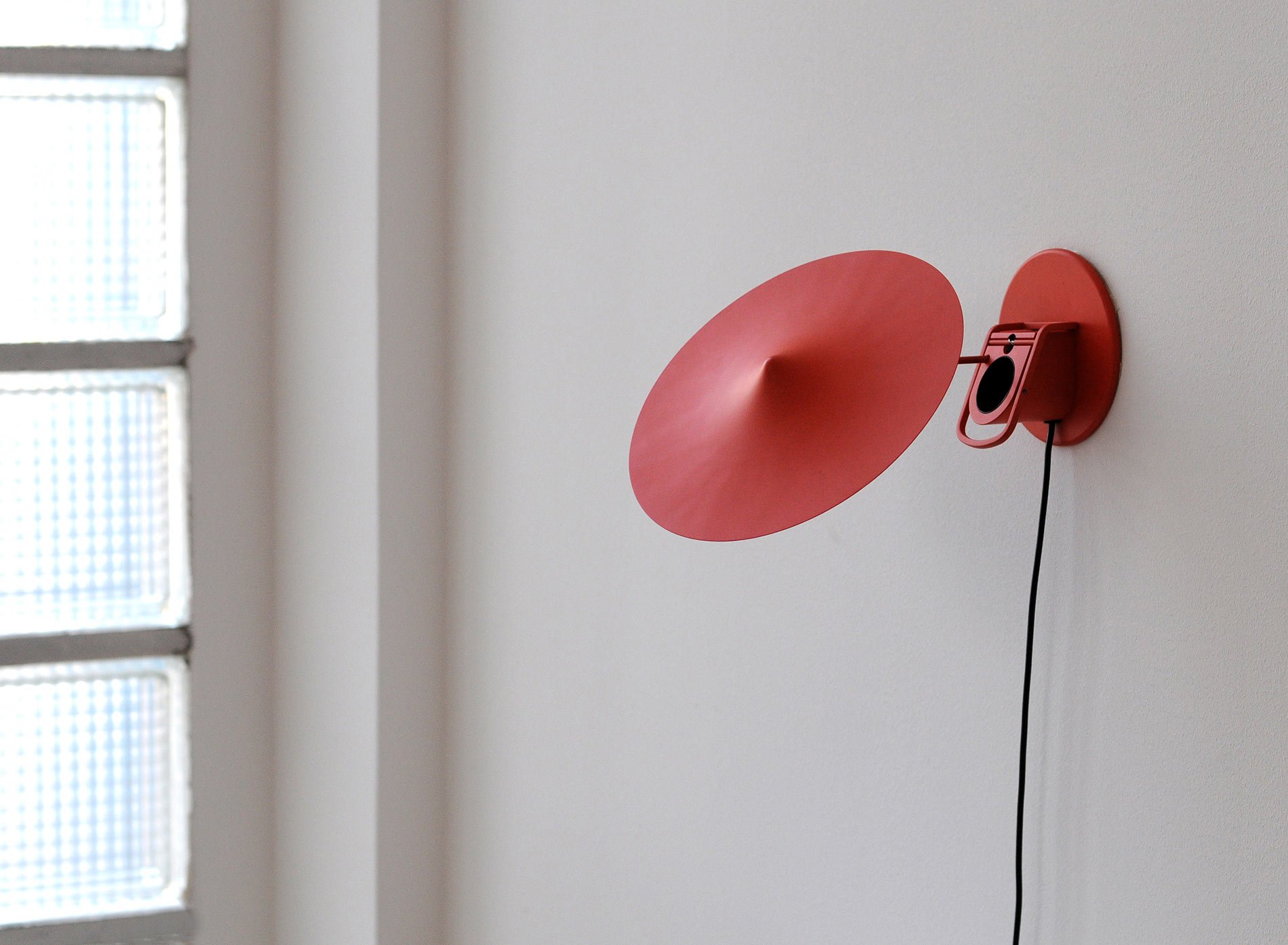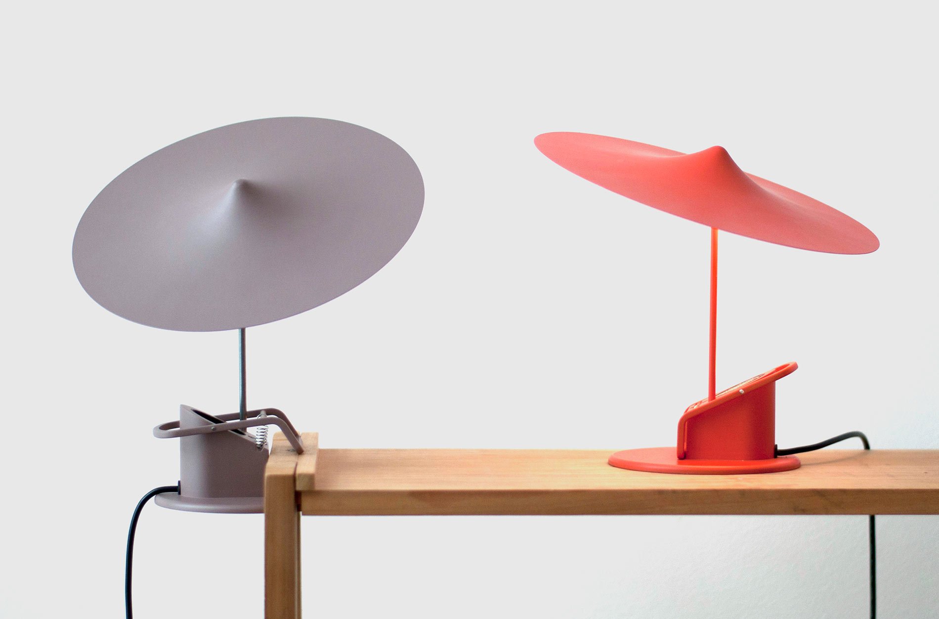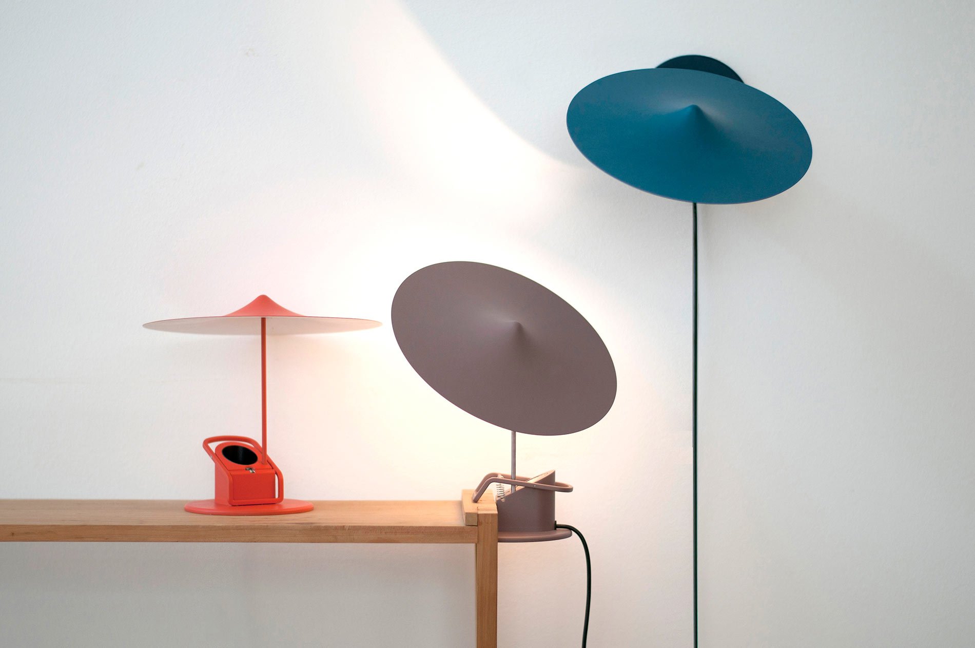 Available this October, Ile, Wastberg designer Inga Sempé’s newest lamp features a matte sheen aluminum and steel, multi-purpose clamp light in a bright pastel 70’s inspired pallet. Reminiscent of bright parasols lightly blowing at the beach, or small orchestral cymbals, the dainty lamps appear elegant against any surface. Named Ile, the French word for island, the colors available in Sempé’s mobile clamp lamp sets the tone for island time relaxation. Designed for smooth movement and simple assembly, a spherical magnet attaches the pressed-iron canopy shade to a thin wiry pipe shaft. The flat circular bottom mimics and compliments the form of the circular pressed-iron shade, bringing a sense of balance and cohesion throughout the overall design. At your convenience, the flat base not only allows the lamp to easily clamp and mount a variety of flat surfaces, but also allows it to function as a regular free standing desk lamp. Interestingly, as the LED system is situated at the base of the lamp, the brimming shade may be used to reflect light in any direction without burning up. Overall, the modernistic thin wiry form and cymbal-esque shade favors lightness and harmony, bringing light, openness and expansion to any interior space.