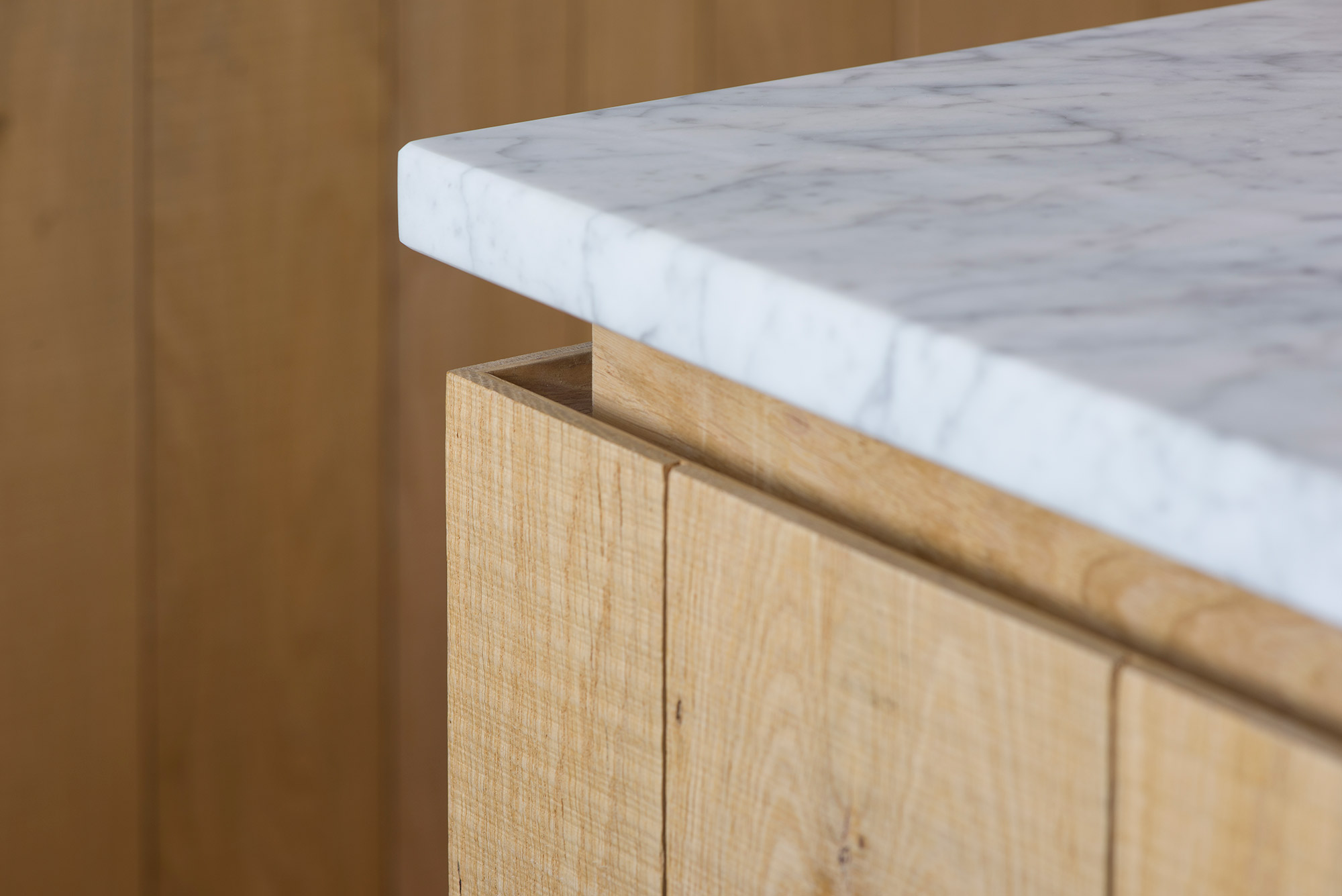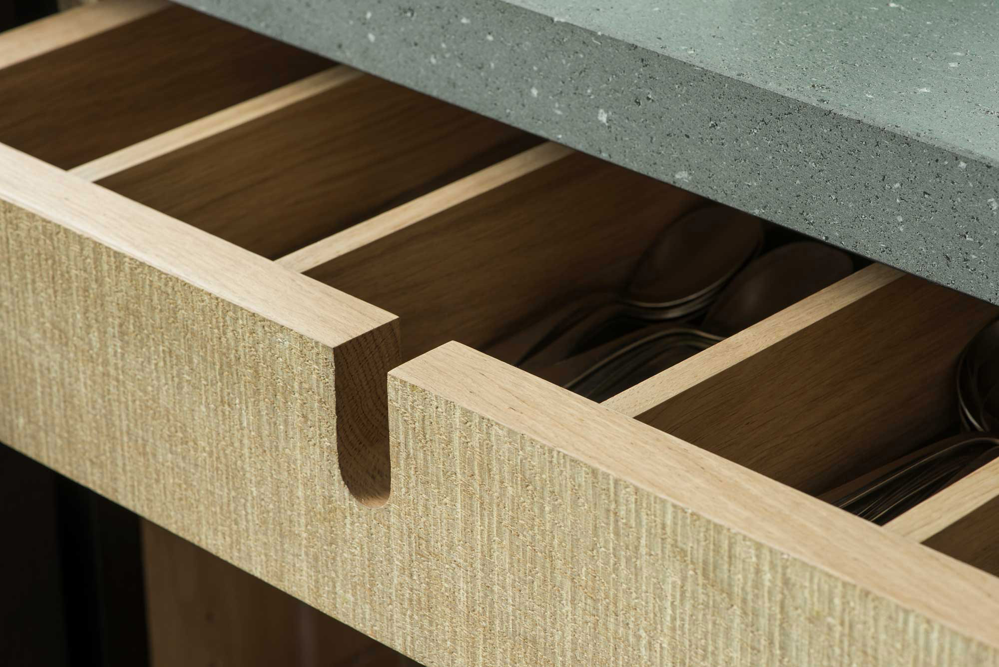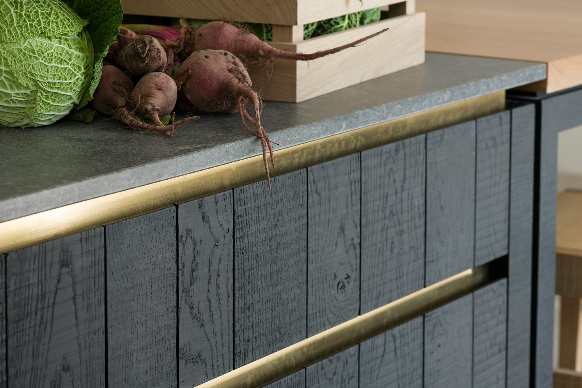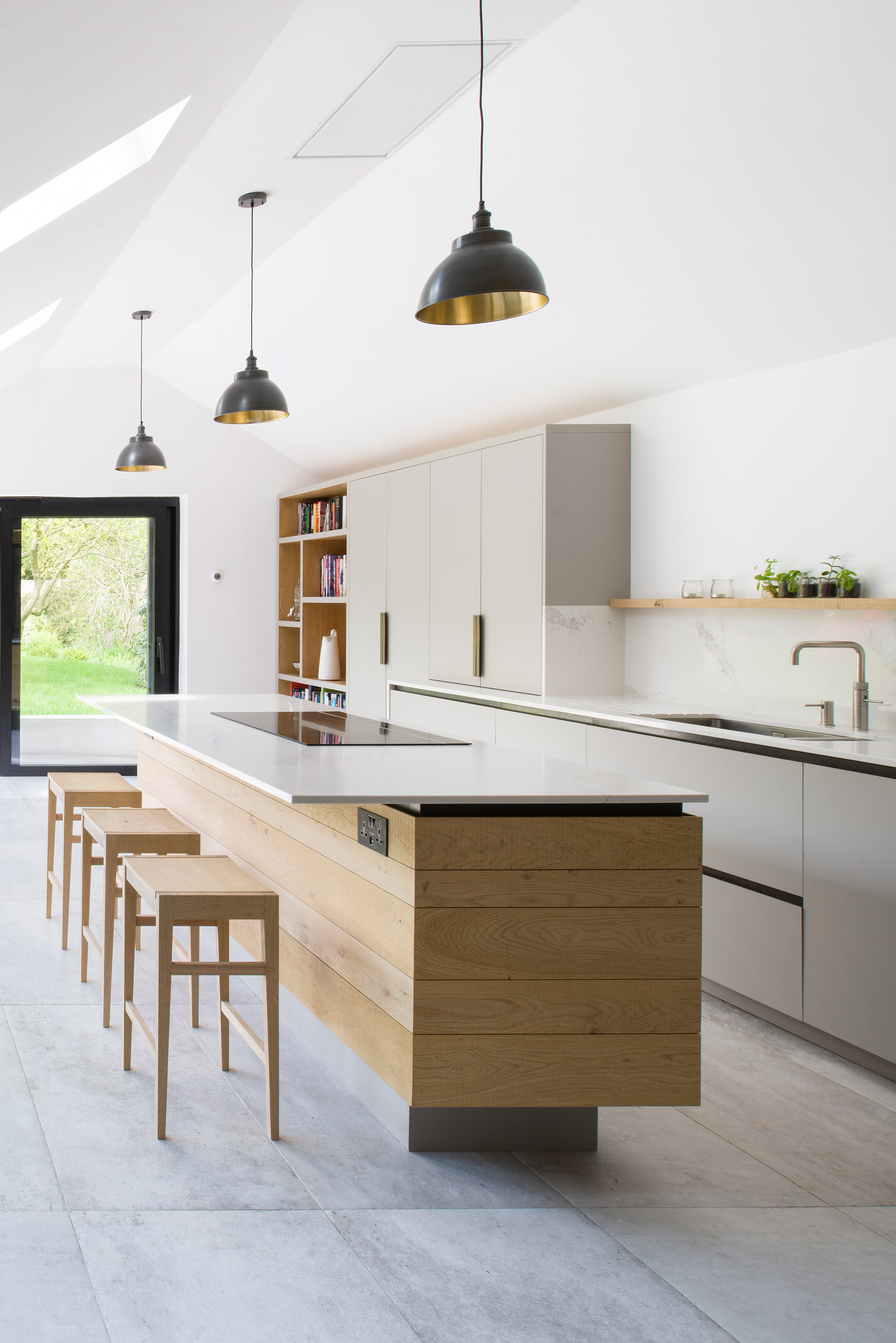 Created in a close collaboration with the clients, each design brings warmth to the heart of the home. Often, in different ways. For example, one kitchen in a copper roofed extension, completed with a design that provides a modern counterpoint to the main home, an Edwardian house. This kitchen features raw band-sawn oak with quartz, fluted glass and brass accents in light color palette. Subtle contrasts and the use of light wood give a bright, laid-back feel to this family kitchen.