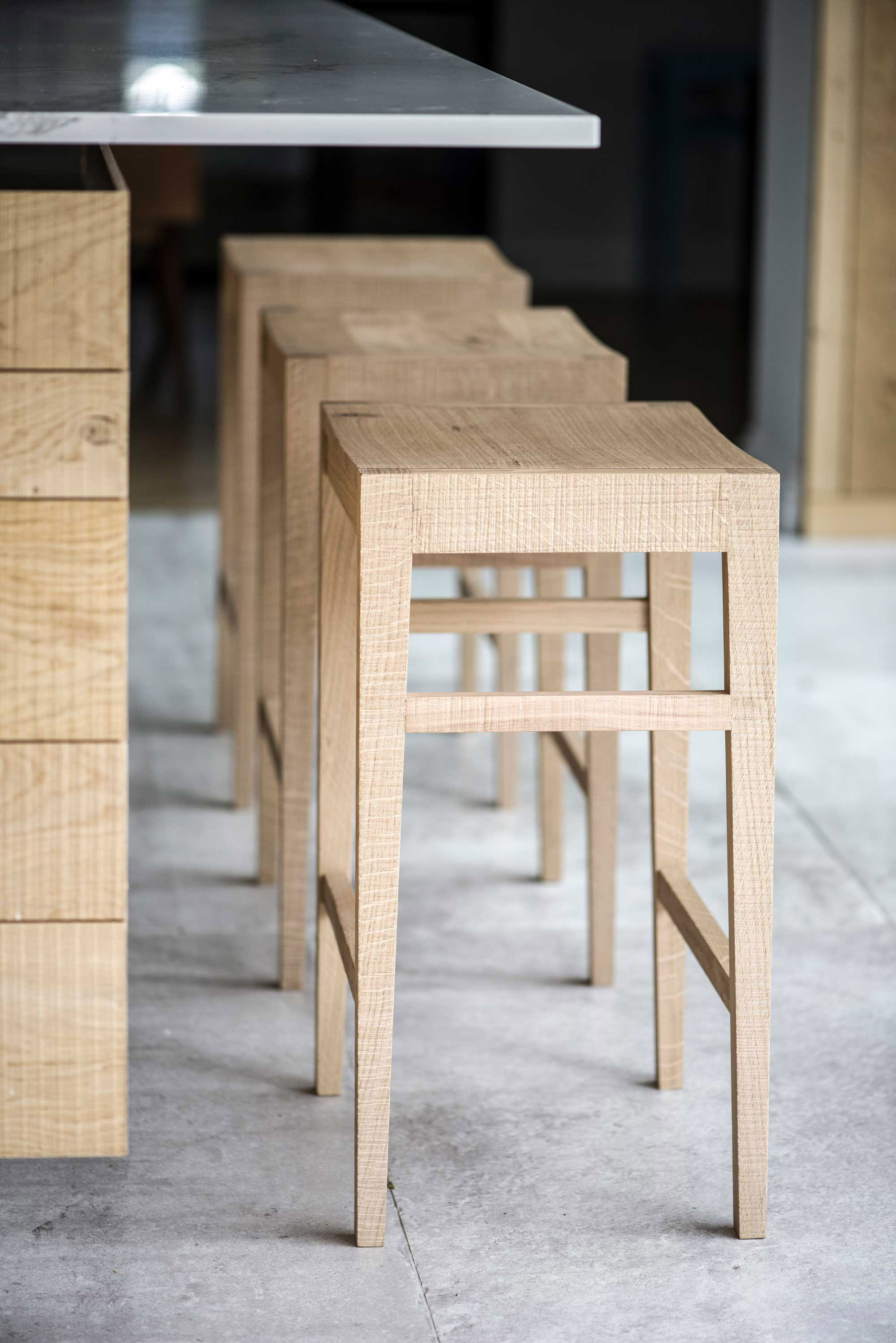 The company doesn’t just design and craft custom kitchens. It also designs spaces around them. For example, a larger project, completed for a contemporary home featured on the popular TV show Grand Designs. Apart from the bespoke kitchen, the Inglis Hall team also designed a timber staircase and a blackened oak entrance area. In the kitchen, two imposing, monolithic islands combine stainless steel and blackened oak, with basalite concrete and planed oak also used to finish the stylish space. In a manor house, the company designed a contemporary kitchen with subtle industrial influences. Sawn oak with a blackened and a natural finish complement burnished brass accents and quartz countertops as well as rugged concrete surfaces. Here, a cabinet doubles as a home bar and as a workstation. For more inspiring Inglis Hall kitchens, head over to the company’s website. Photography © Inglis Hall.