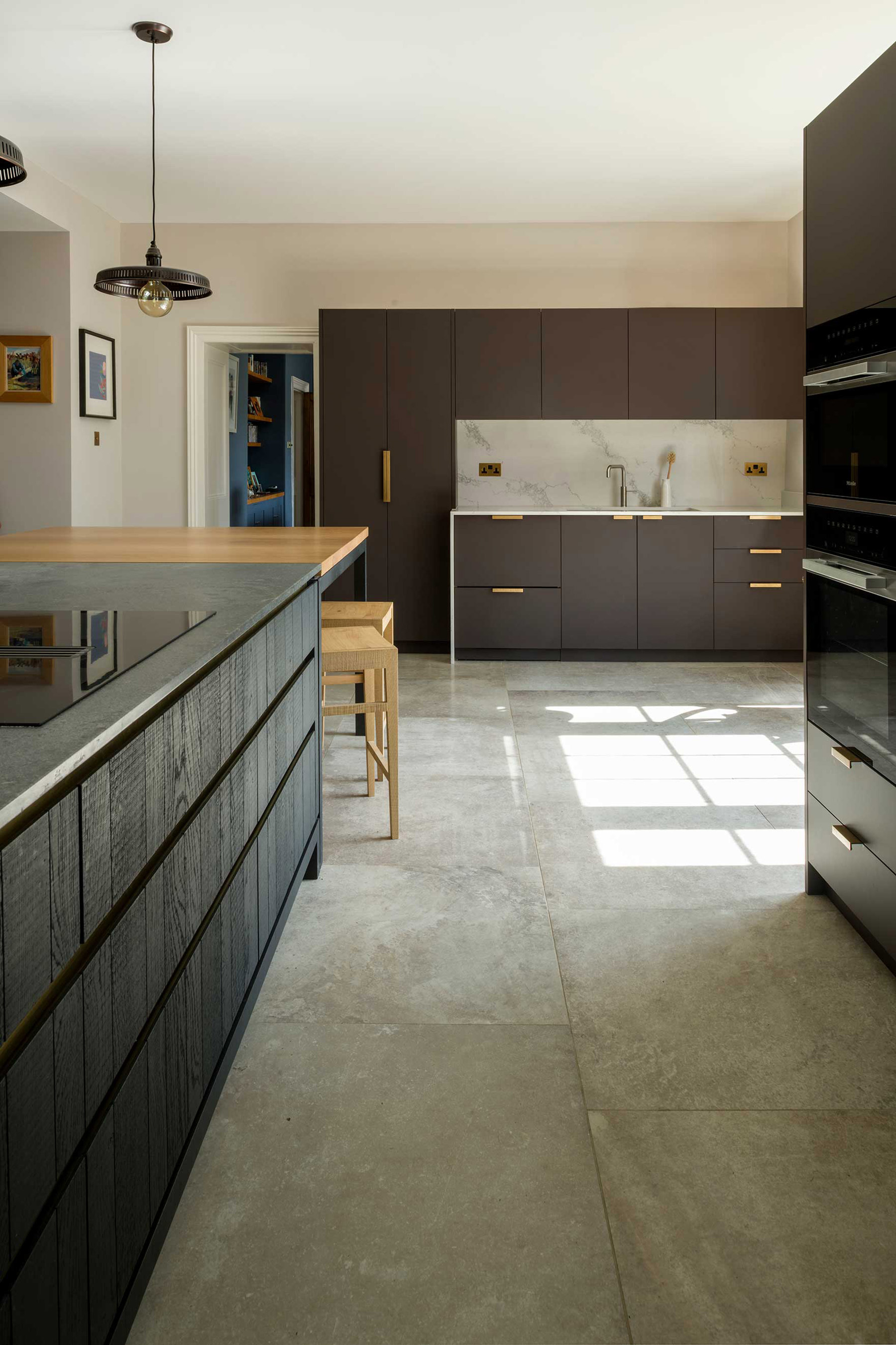 Another project required the company to design a kitchen for an apartment in a Victorian house that opens to views of the English Channel. Bright and spacious, the living spaces needed a similar aesthetic for the family hub. As a result, the company created a bespoke Inglis Hall kitchen with oak cabinets and Carrara marble countertops. Modern open shelving and a light, Slimming Stone paint finish complete the serene design.