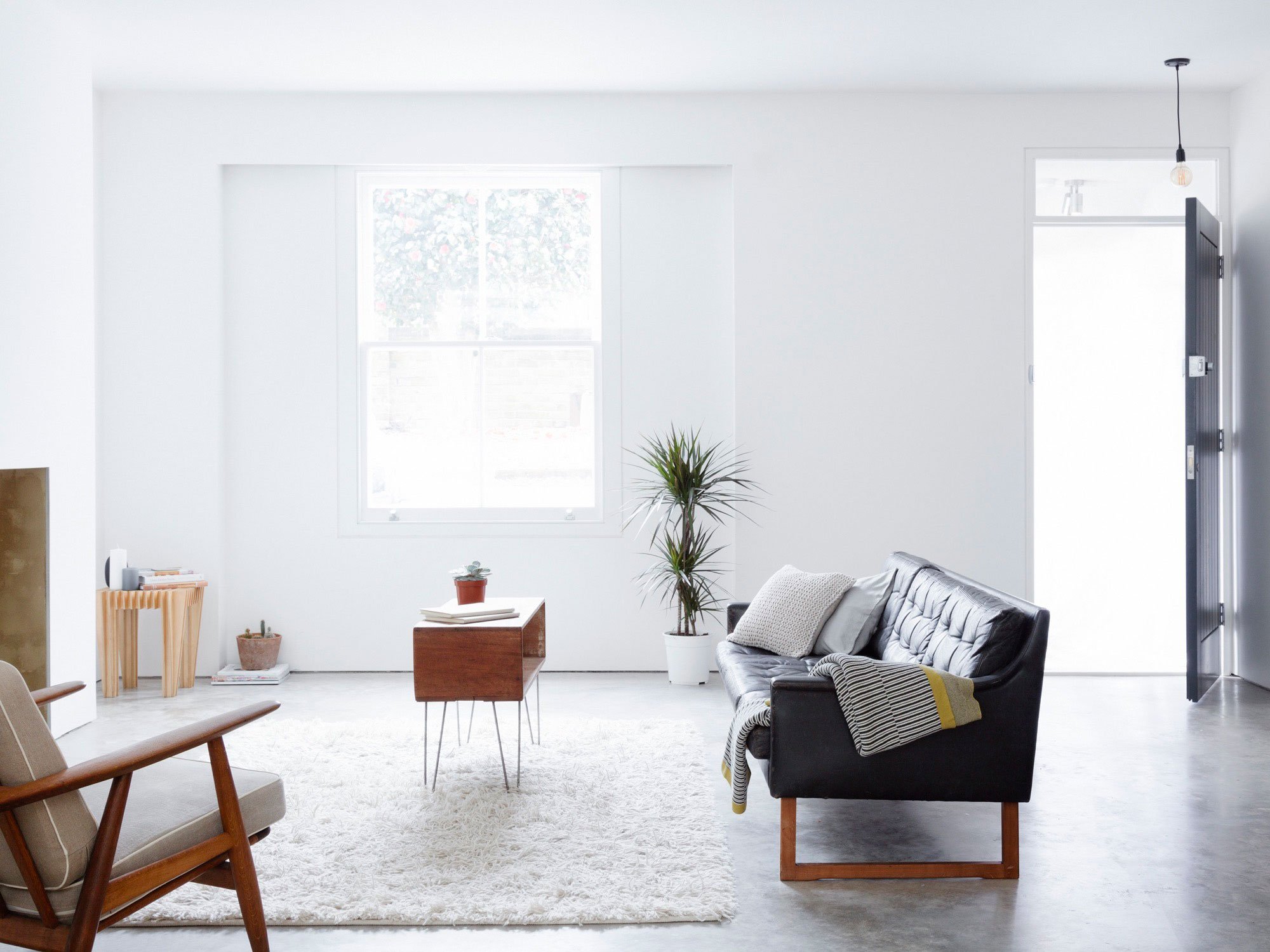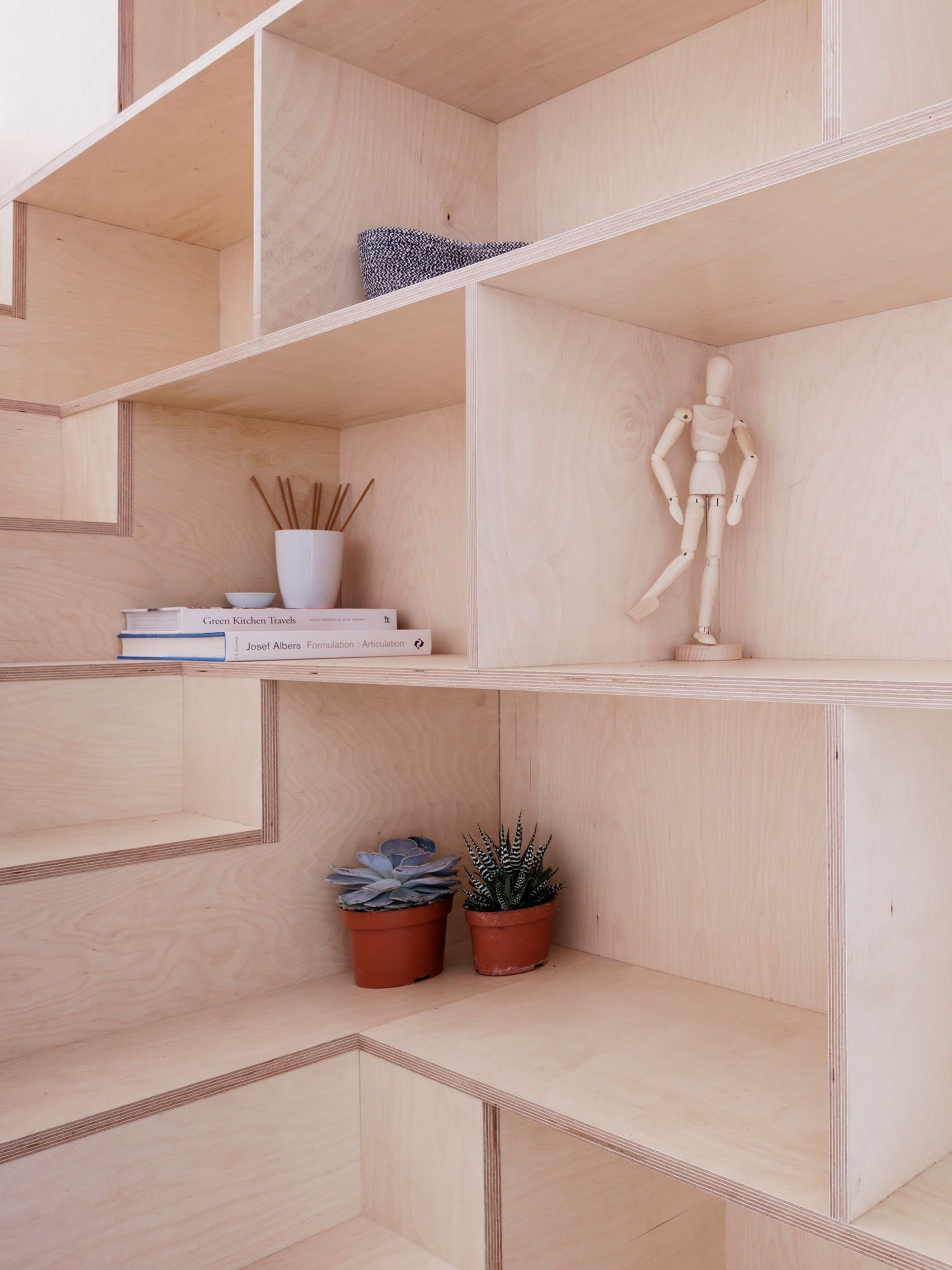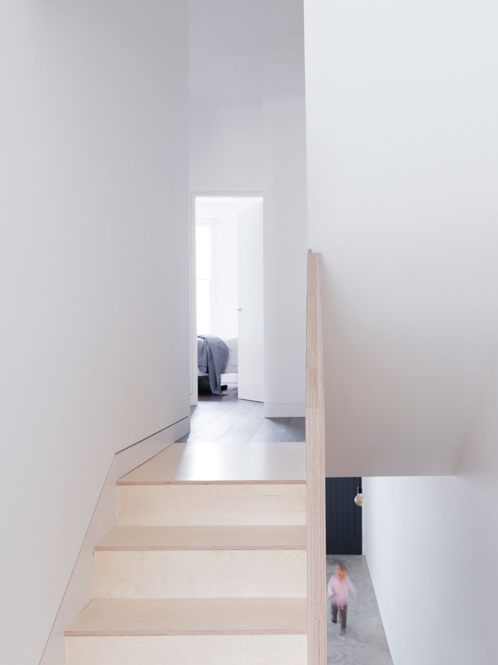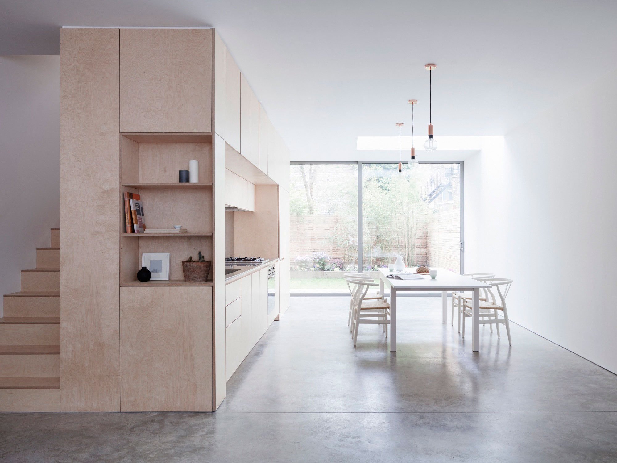Relocated on the ground level, the open-plan kitchen and living room now have plenty of natural light. The airy space includes a large plywood unit that incorporates a kitchen, a staircase, cleverly hidden storage spaces as well as a study area. Throughout the home, natural wood, polished concrete, stainless steel, and white plaster enhance the restrained aesthetic while also complementing the minimal décor. Photography by Rory Gardiner.