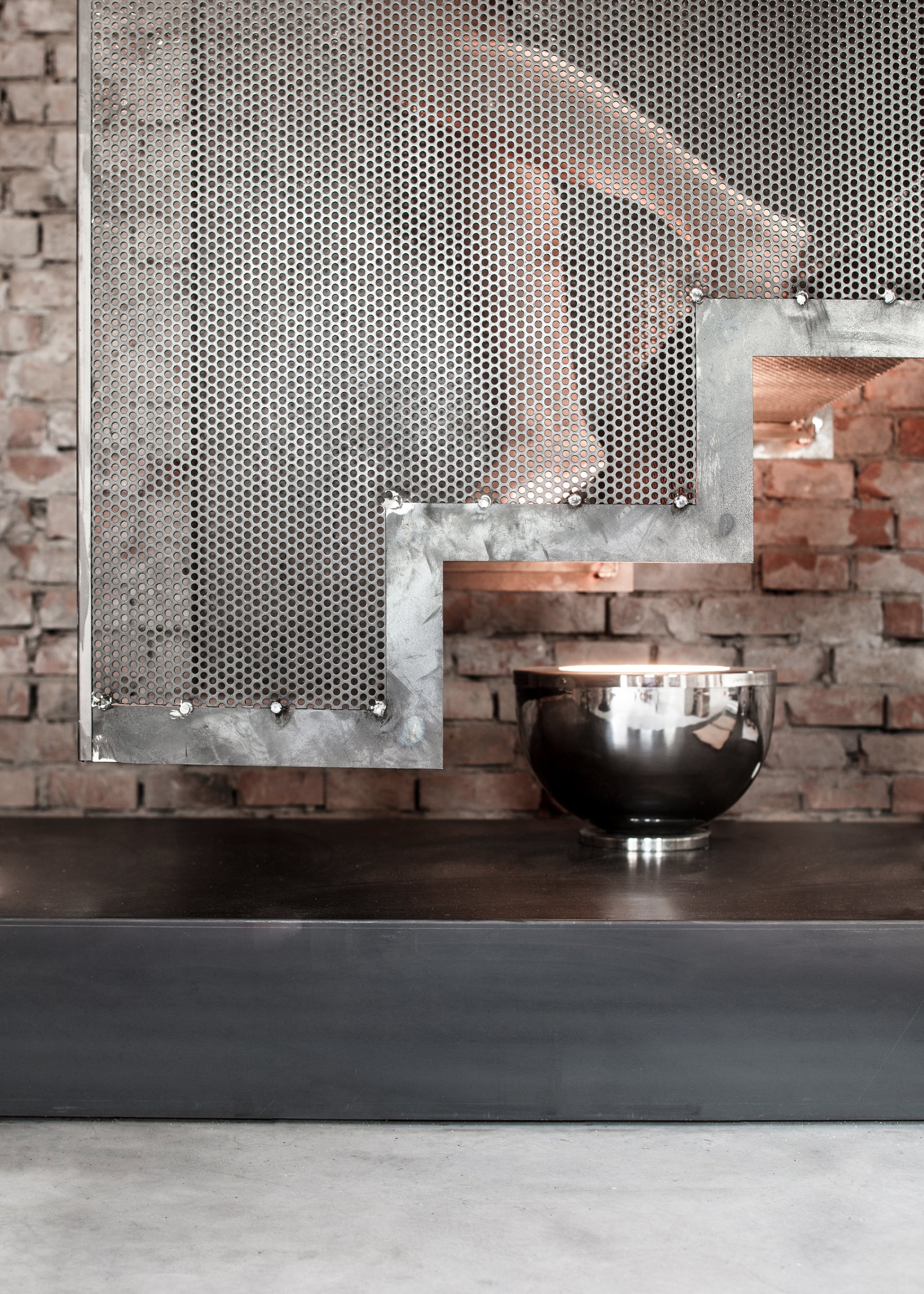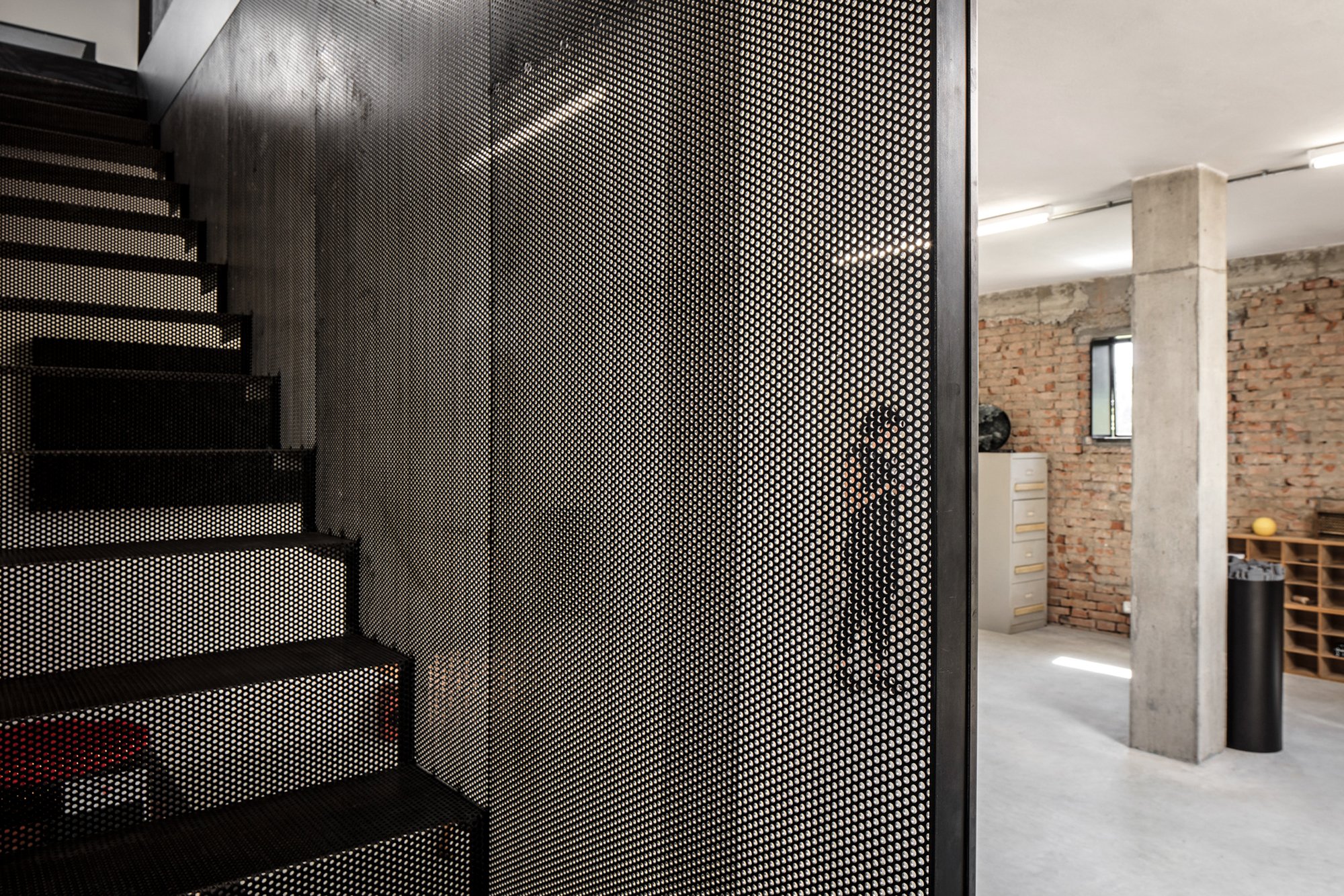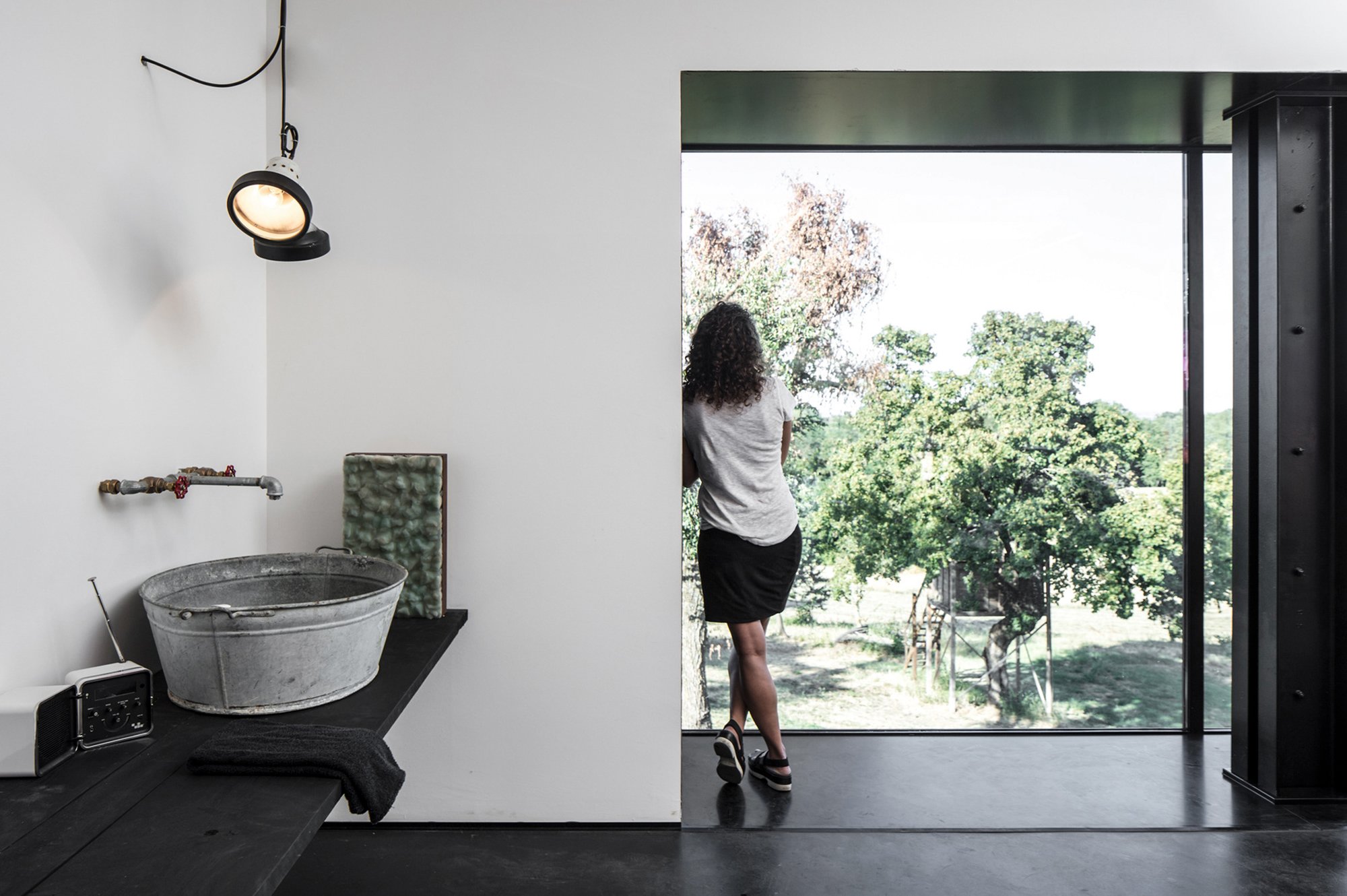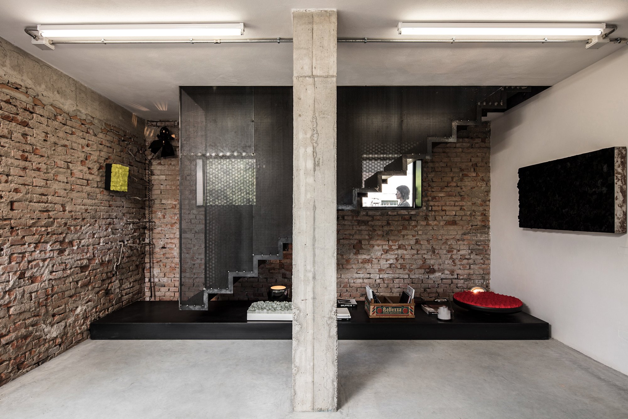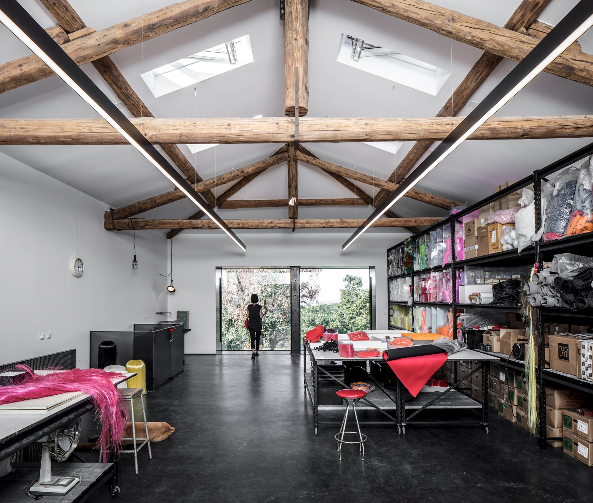 The house includes three separate areas. A large workshop and expansive studio, with a kitchen, bathroom, and small lounge acting as a buffer between the two work areas. The ground floor also features concrete pillars that define the space. With the service rooms on lower level, the first floor has a completely open layout. Filled with natural light while also overlooking the natural landscape, this large area stimulates creativity. Throughout this live and work space, industrial and rustic elements combine seamlessly. Wooden beams, perforated metal sheets, and concrete surfaces appear alongside exposed bricks and antique furniture. Nature becomes a part of the interior, with large windows on the upper level bringing the greenery inside the studio. Photographs© Fabio Mantovani.