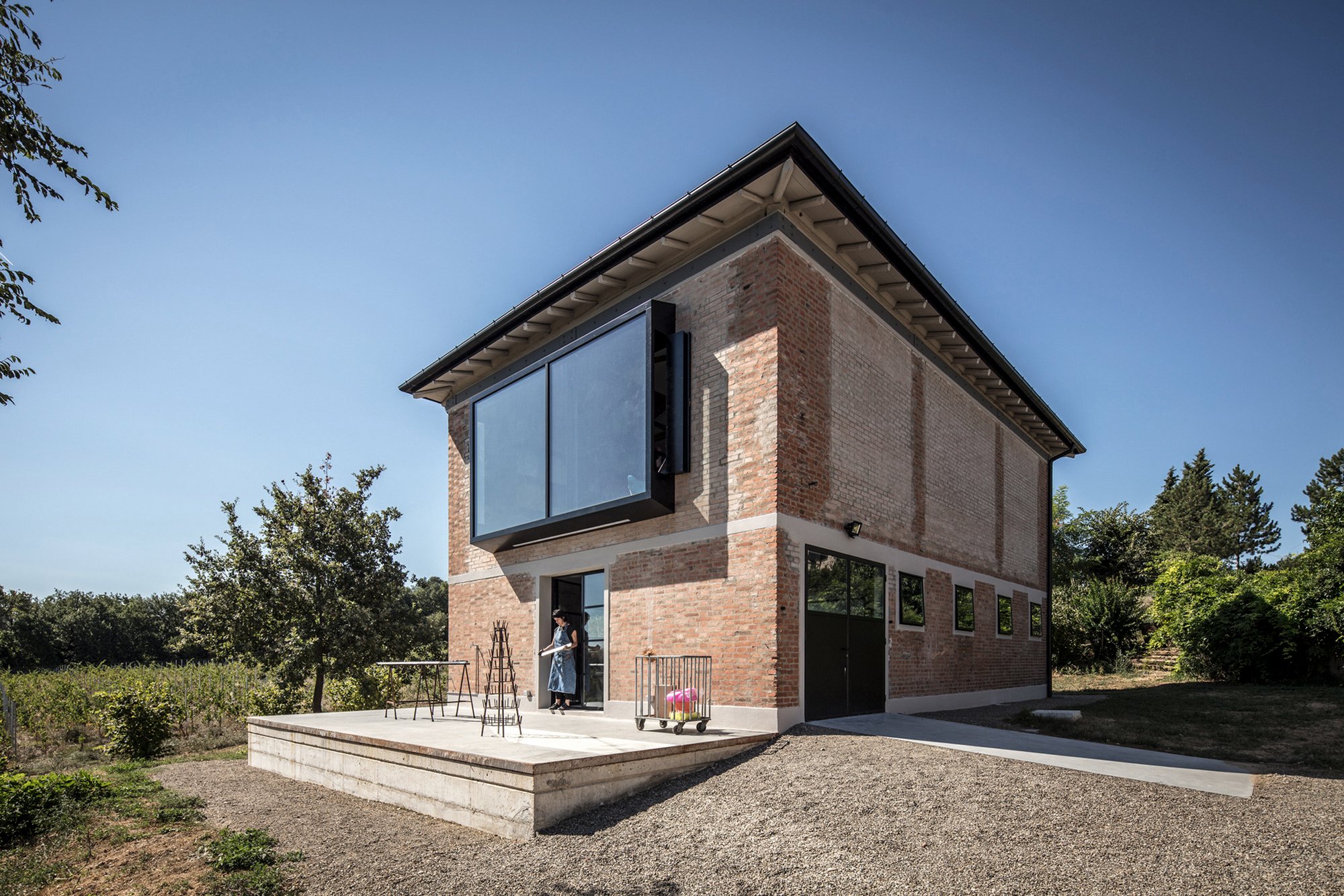 Ciclostile Architettura designed a beautiful live and work space for artist Francesca Pasquali. The studio upgraded an old barn from the ‘60s and transformed it into an experimental living and creating space that blends rustic exposed bricks and industrial elements in a refined way. The adaptive reuse architecture maintains traces of the building’s history, but reimagines the layout according to the client’s specific needs while also responding to the local context and surrounding landscape. As a result, the structure has a distinctive character.