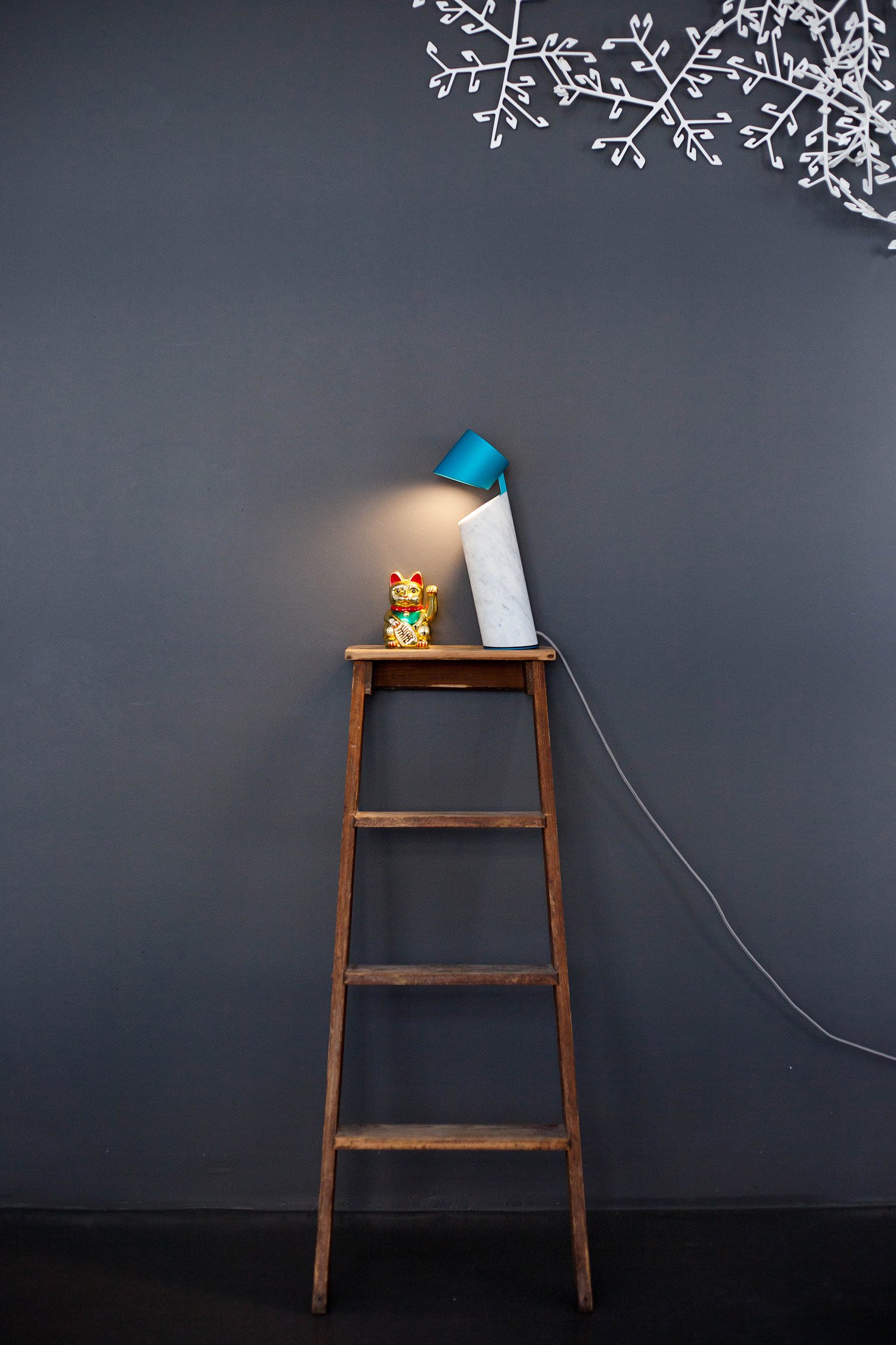 Created by Berlin architecture and design studio COORDINATION, “Italic Light” explores the familiarity of the table lamp through an interactive design and a reduced sculptural form. Shaped like an italicized “i,” the light pays homage to classic and postmodern iconography, playing into both the two- and three-dimensional worlds. The well-considered design makes it incredibly versatile; whether or not “Italic Light” is illuminated, the contrast of elegant marble and bold turquoise aluminum make for a simple yet striking sculptural piece that would compliment practically any aesthetic. Its touch-dim sensor allows the user to engage intuitively with the 31 cm light in an insightful interpretation of the ever-changing relationship between user and product. With an LED light inside its swiveling aluminum shade, “Italic Light” is a sustainable piece that is sure to stand the test of time. Additionally it is furnished with long-life LED ring, textile cable, and a built-in transformer.