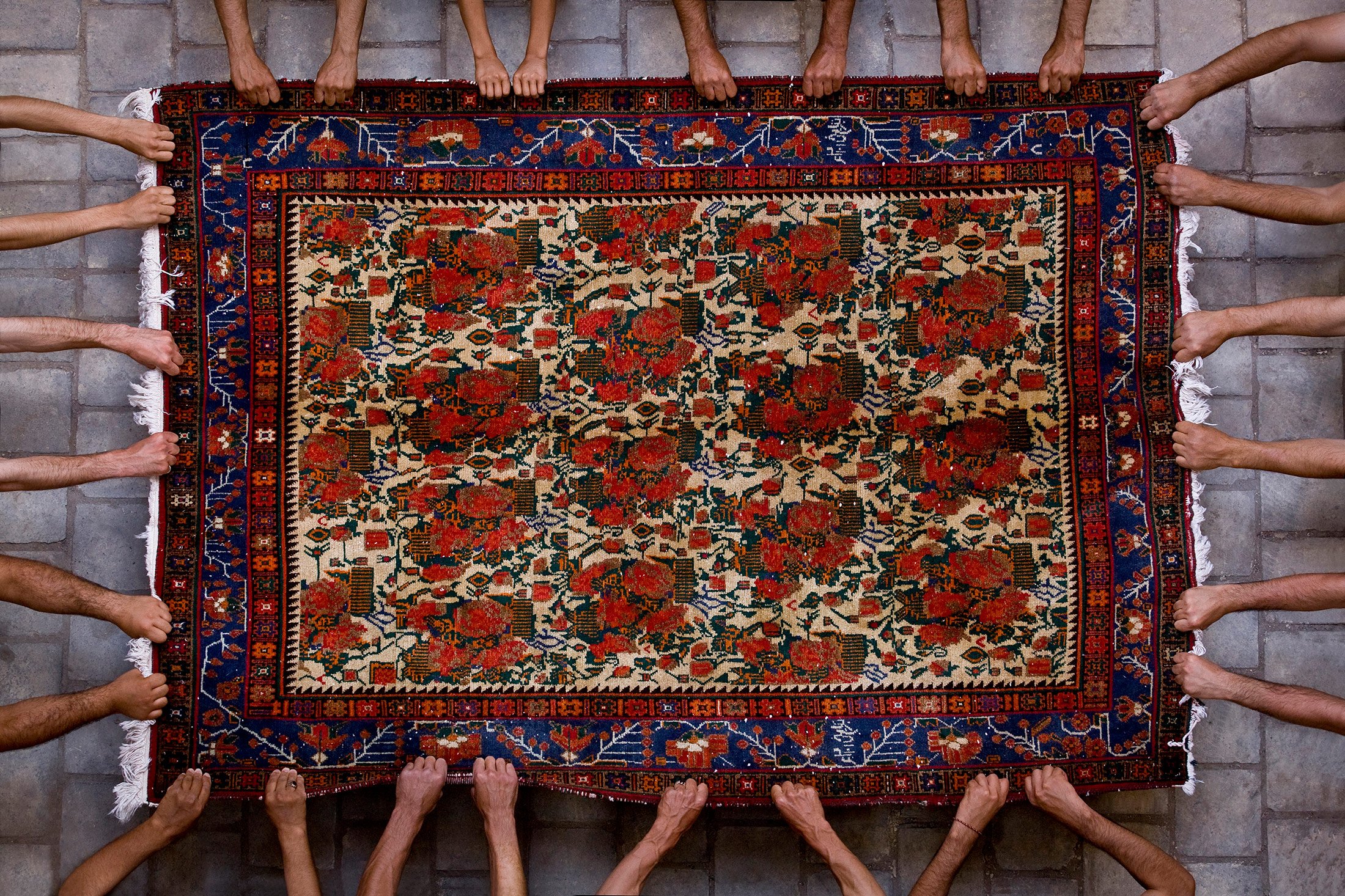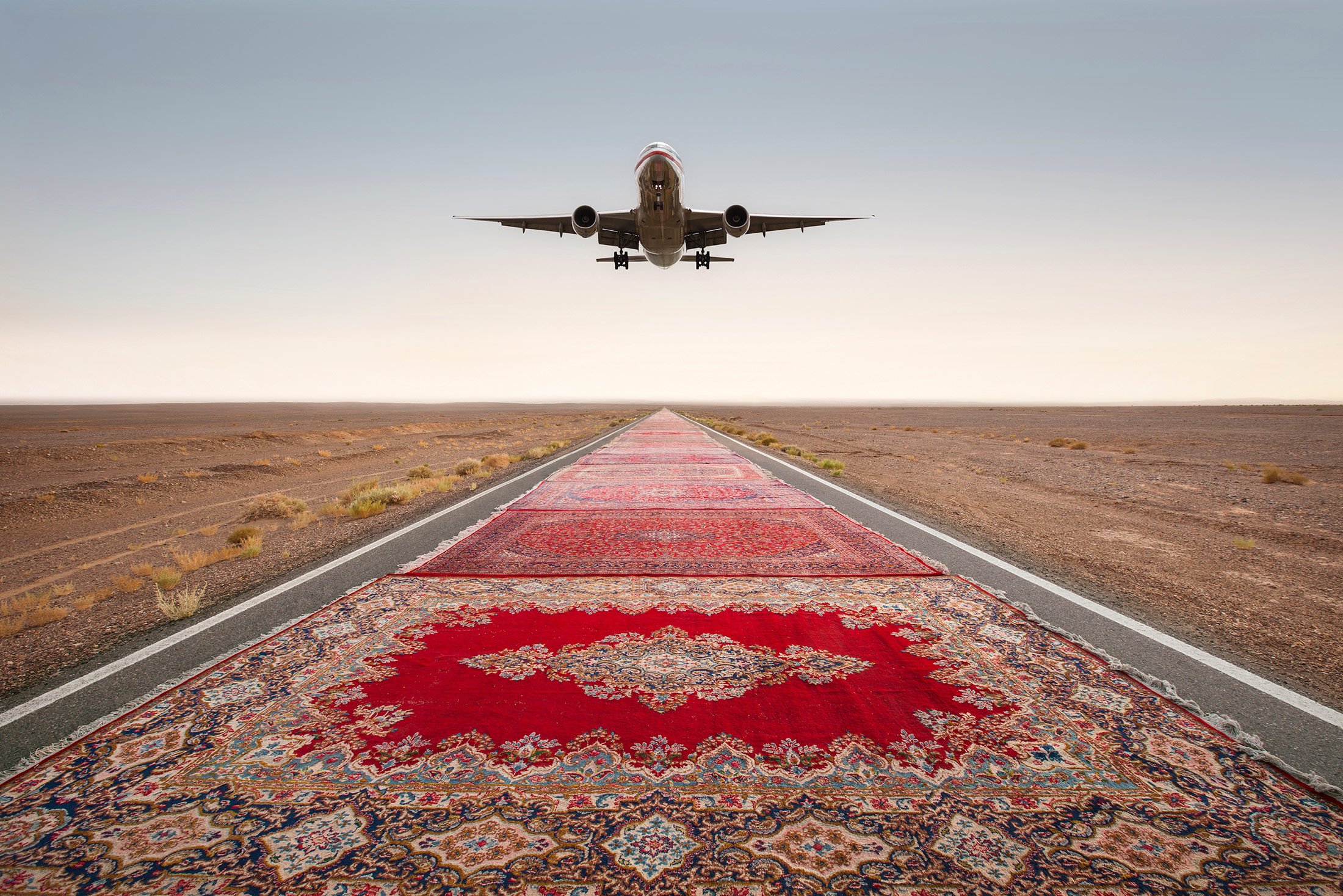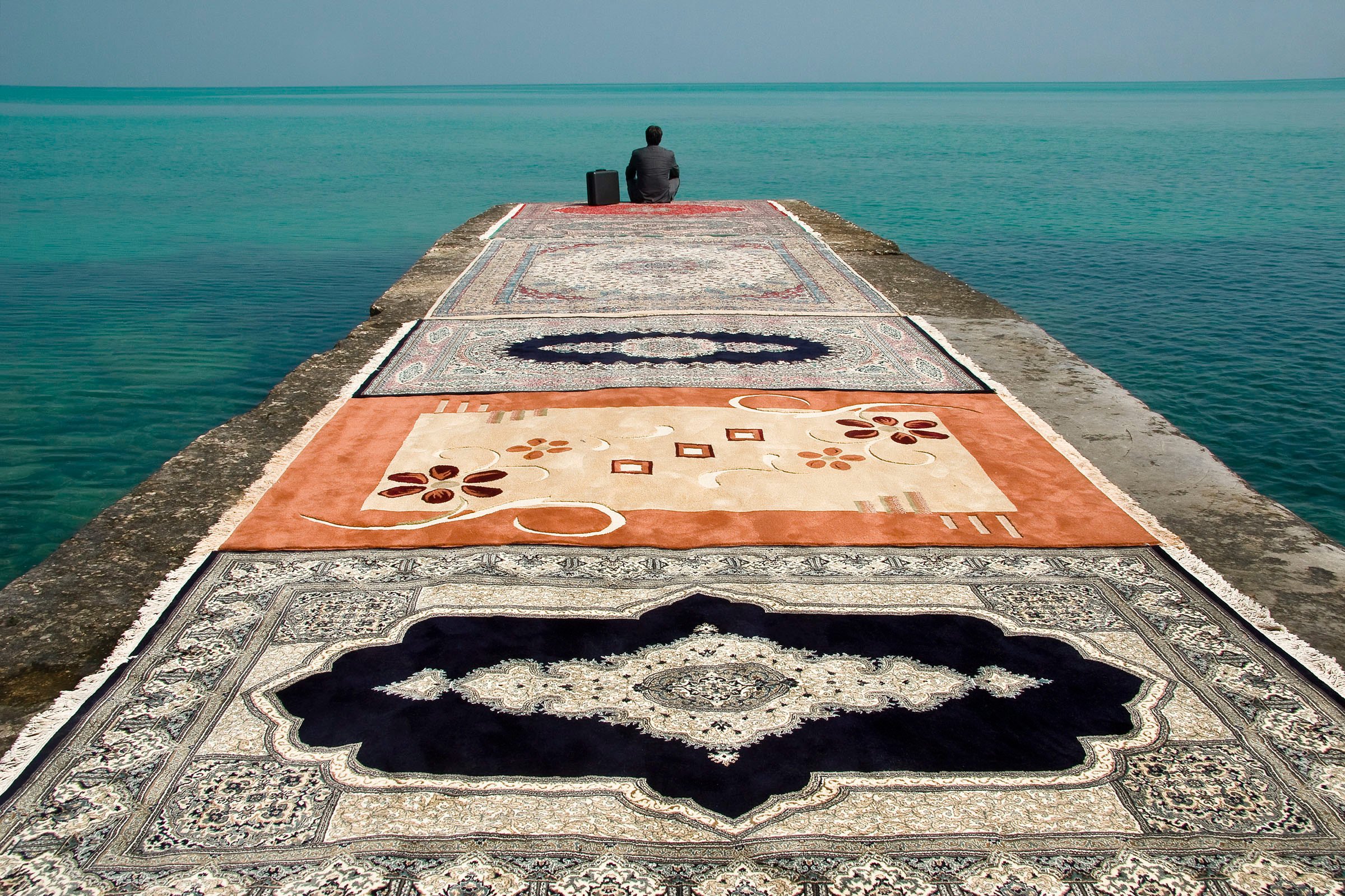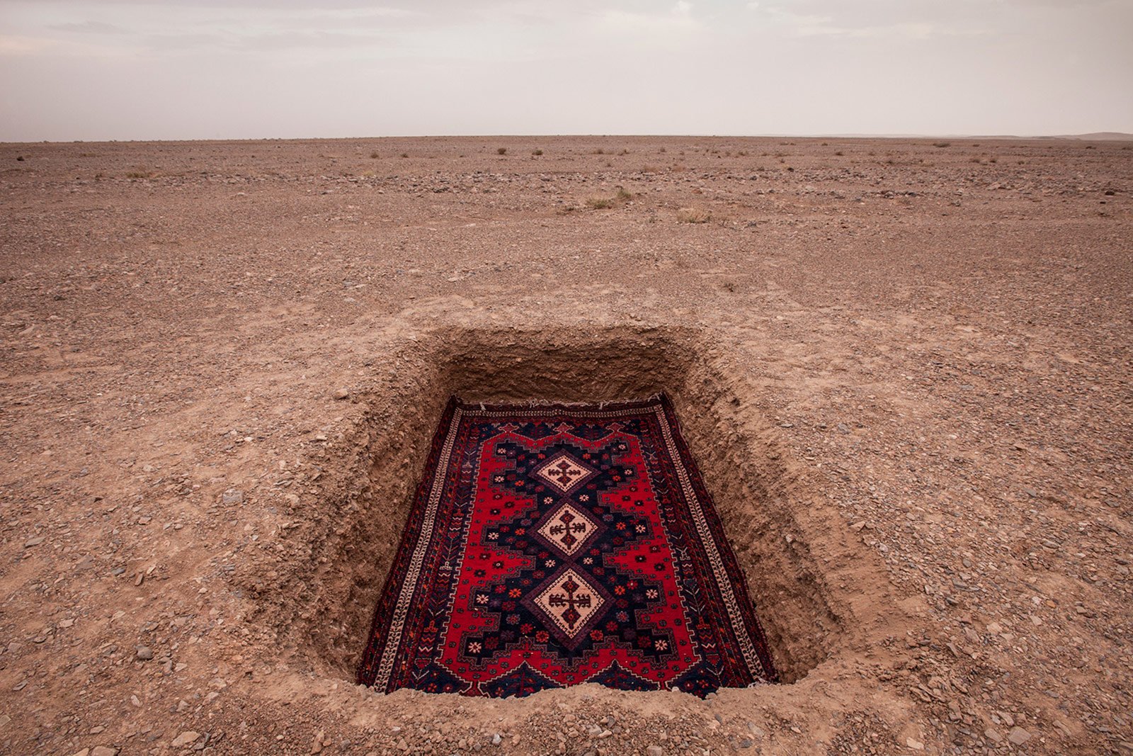Iranian photographer Jalal Sepehr offers a rare perspective on global affairs through his recent series, “Red Zone;” the title refers to the unending state of alarm and panic thrust upon Middle Eastern populations as war and political unrest become commonplace. A road paved with Persian rugs lays at the center of each composition as it disappears into the horizon, establishing the common cultural thread shared by a people displaced. It feels as though the viewer is a part of this arduous journey, invited to walk the road ahead. Various obstacles – a sandstorm, a massive wall, a plane, and even a black hole – impede this almost idyllic path in each scene. While nothing but empty desert surrounds the trail of rugs, one cannot traverse the void; a sense of exclusivity accompanies the path as though it is the only useable route for an entire people. Cloudy, grey skies above create a sense of imminent danger, foreshadowing the troubles that lay ahead.