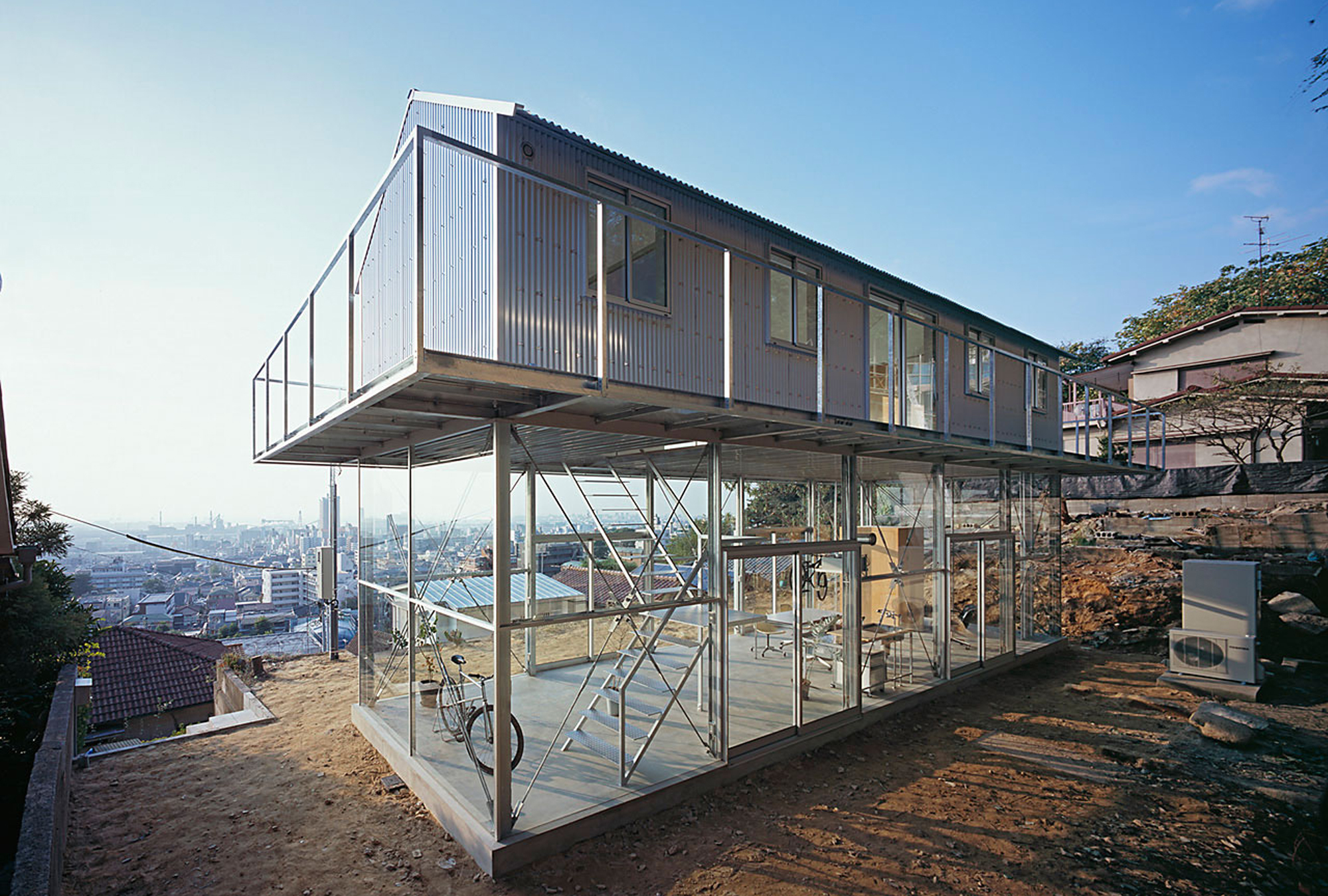 If we’re featuring the most creative modern houses Japan produced so far, we have to include this house on a steep slope on Mount Rokko. Designed by Yo Shimada, founder of Tato Architects, the house offers an imaginative twist on classic designs. It features a glass base that supports a metal-clad, barn-like volume with a silhouette inspired by traditional gabled architecture. The ground floor contains a kitchen, a dining room, and bike storage space as well as a wooden volume with a guest bathroom. Upstairs, there’s a bedroom and a bathroom with a glass partition, along with storage areas and other facilities. A balcony wrapped around the metal volume shields the glass box below while offering great views of the landscape.