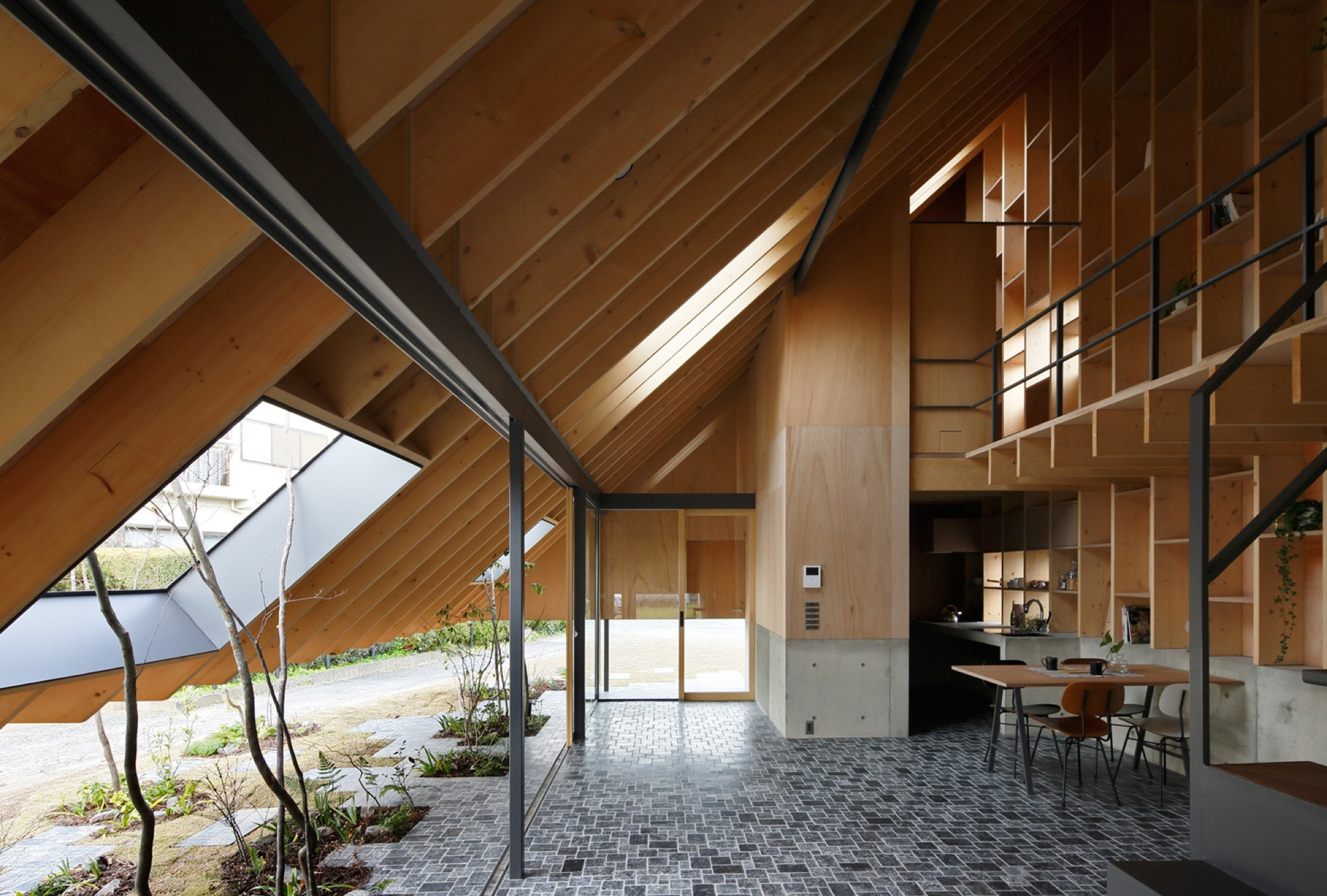 The aptly named Eaves House exemplifies the range of creative modern houses Japan based studios complete every year. Designed by mA-style architects, this home features a triangular silhouette with the roof eaves extending to create a sheltered outdoor space. Windows bring more natural light inside the house, but otherwise the dwelling enjoys almost complete privacy from the neighboring houses. Inside, the studio enhanced the impact of the vertical orientation by leaving the main living space virtually open and not separated by any elements, floors, or partitions. Shelving covers the entire straight wall; a staircase offers access to the top shelves and to the other areas on the upper level.