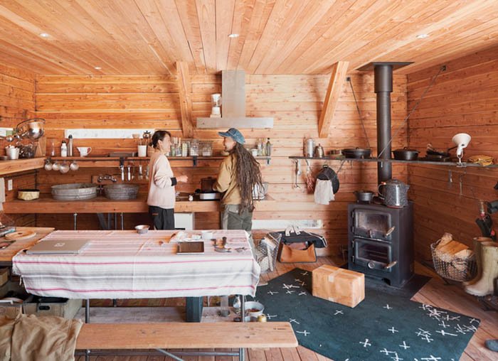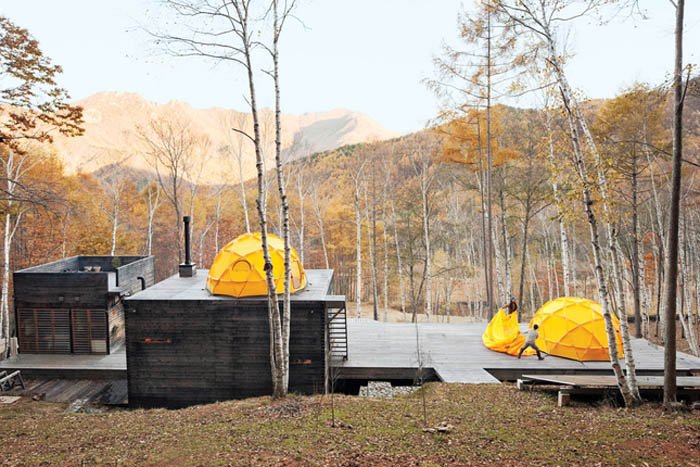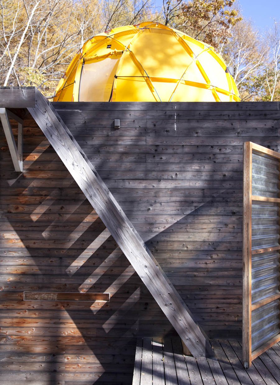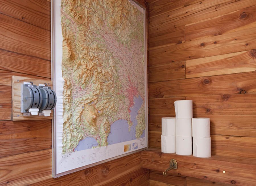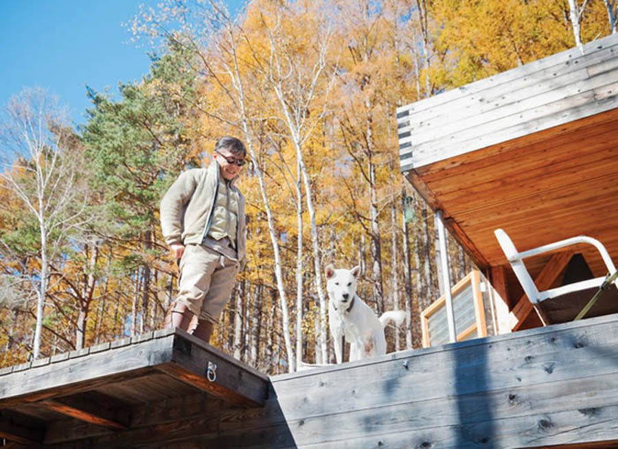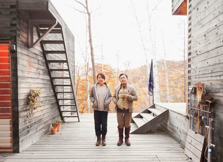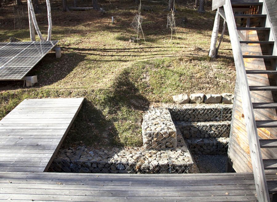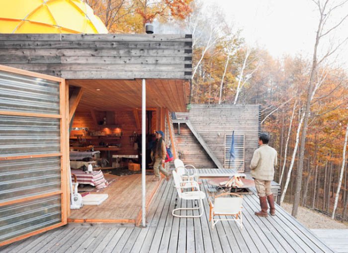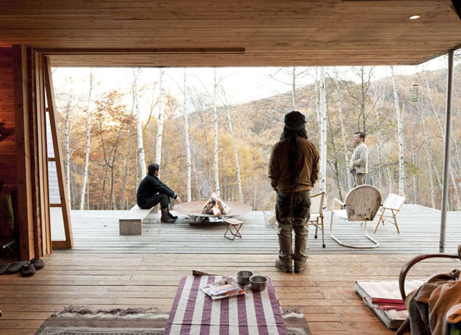 A weekend retreat designed by Shin Ohori of General Design Co. for Setsumasa and Mami Kobayashi, Research employees and adventure enthusiasts. It is nestled in the hills of Kawakami, two and a half hours northwest of Tokyo. The foundation is outlined in stone erosion walls, highly defined by the continuous deck encompassing the entire property. Fully run on solar energy, this rustic living stays comfortable with electricity and running water. It holds a self sufficient ora with wood burning stove and many extreme case Research products.