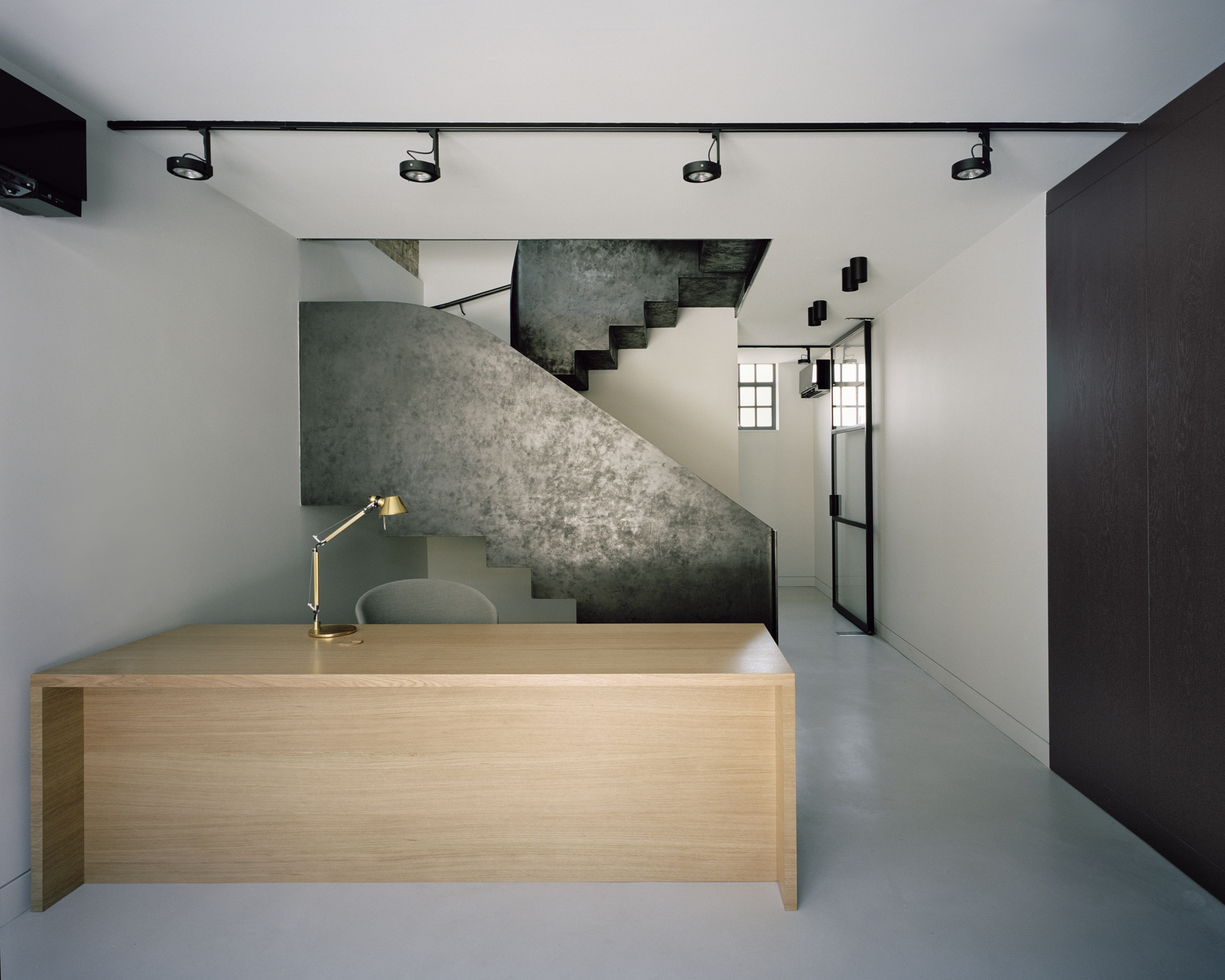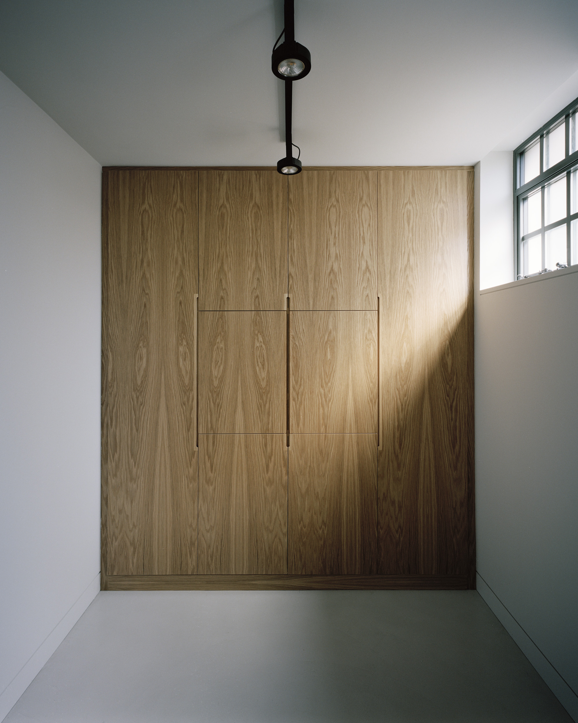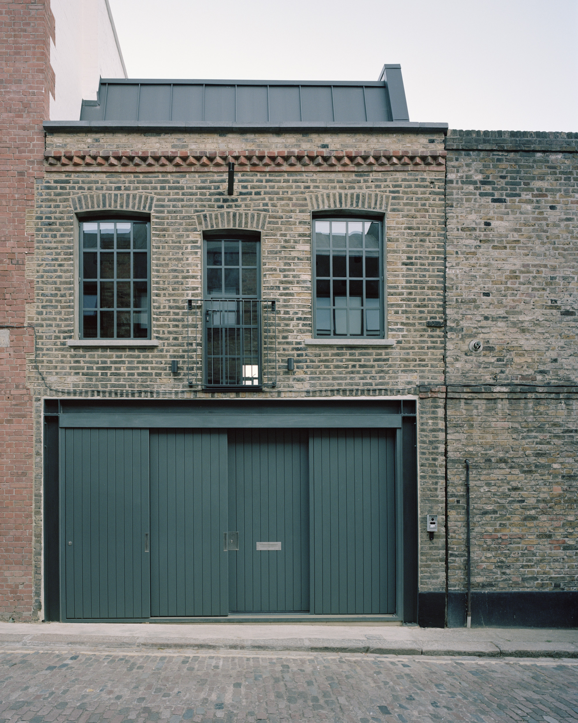 The studio designed sliding wood shutters that remind of the old stable fronts when shut. Apart from celebrating the area’s past, the shutters also provide an easy way to control light and privacy. When opened, however, the timber panels allow the client to connect the workspaces to the quiet street. The wood lining flows into the interior. A new story with a central skylight brightens the building from its center. Set back from the lower stories, the addition remains almost invisible from the street level. The architects also used black zinc to cover the extension and placed the only opening at the back. This window offers views of the back gardens.
