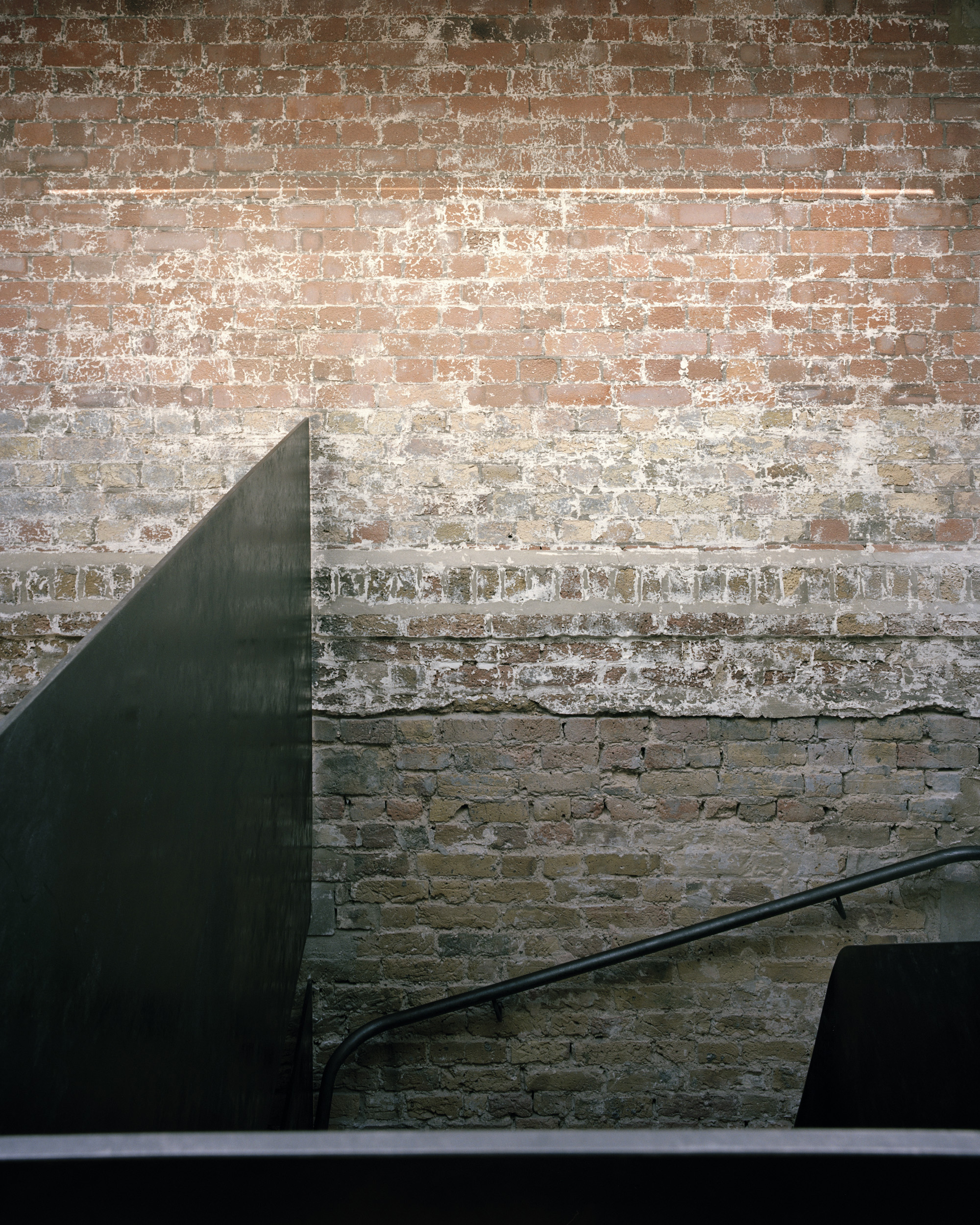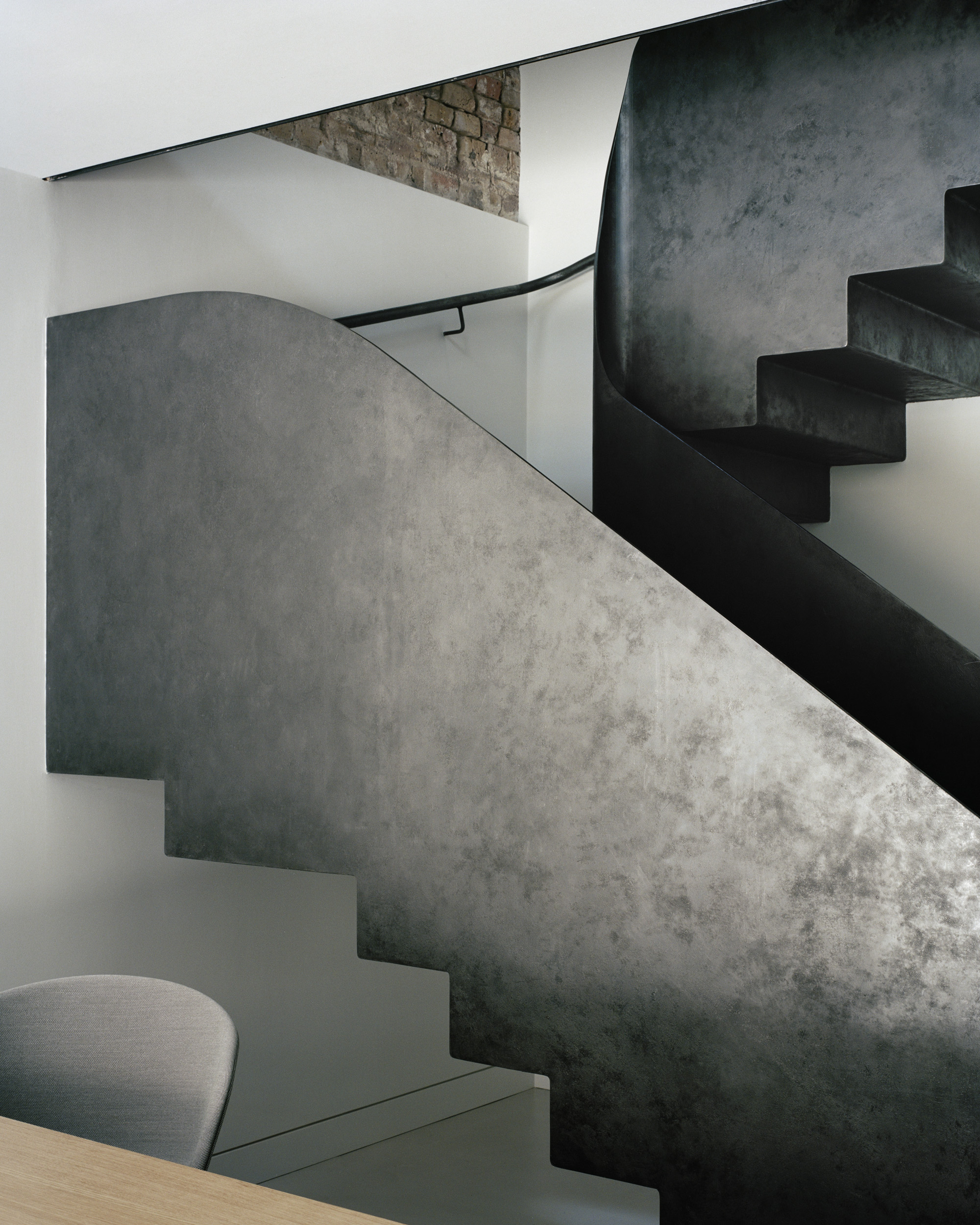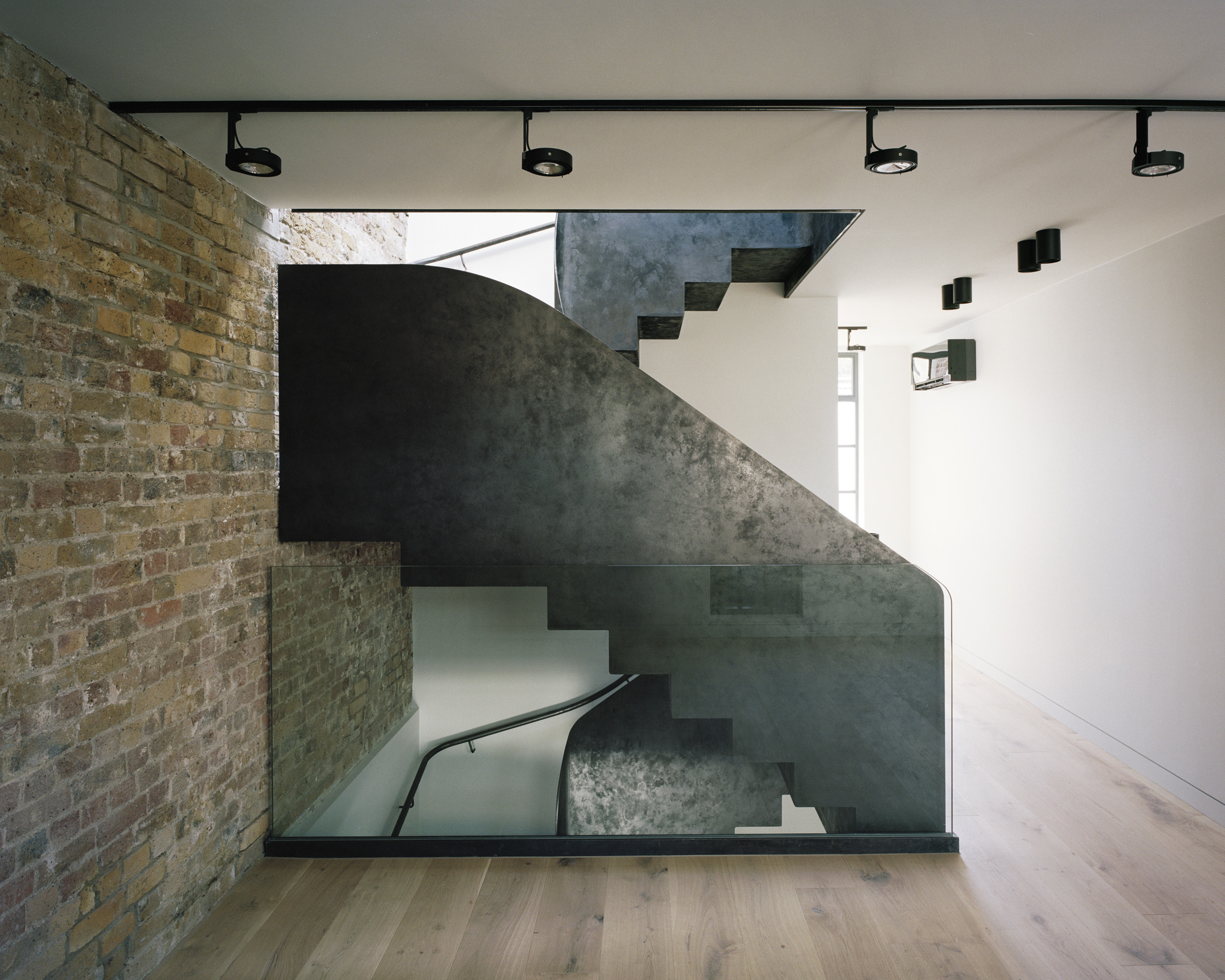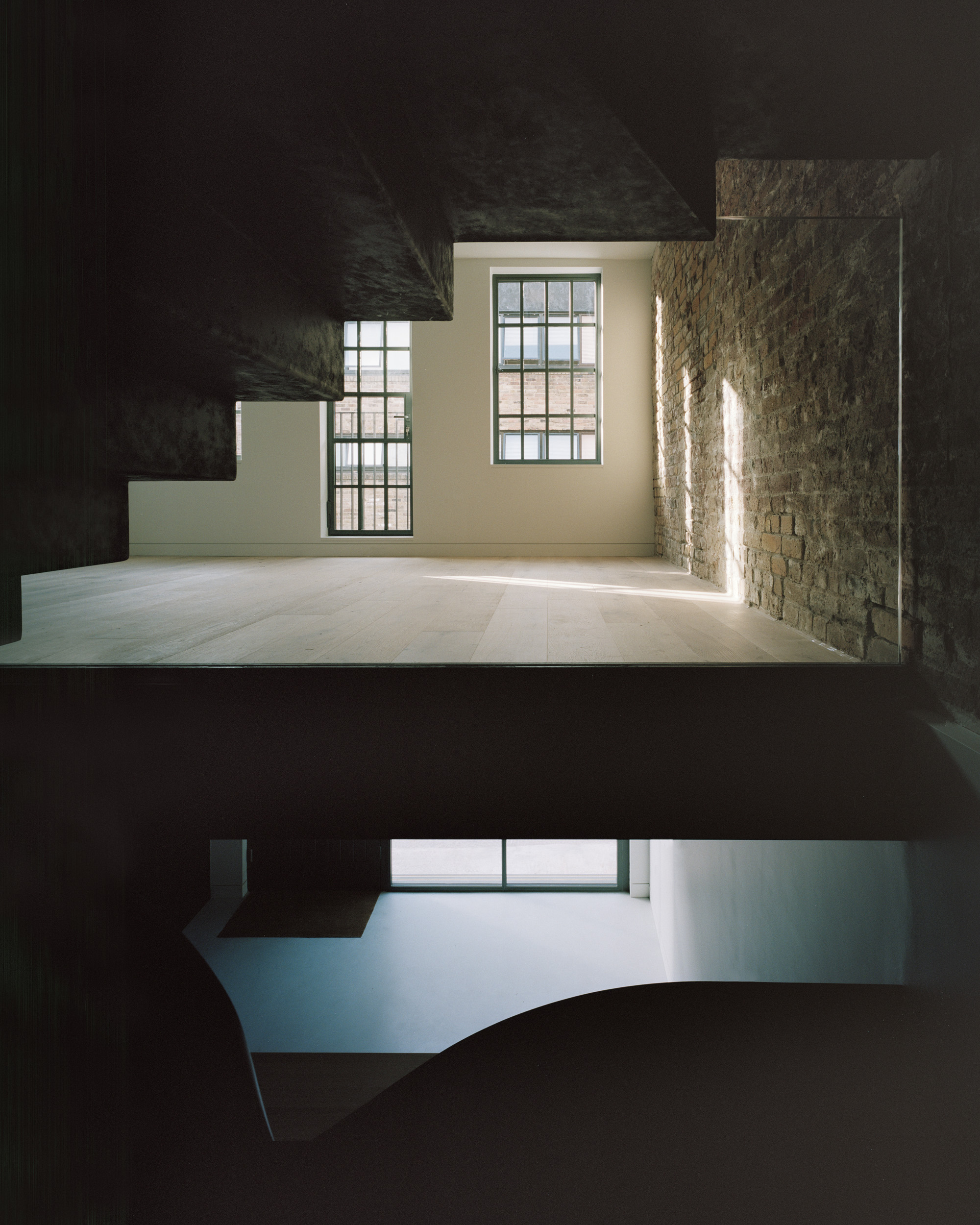 A folded steel staircase connects the three levels and at the same time, optimizes the available space. The choice of steel references the building’s industrial past; the metal perfectly complements both the exposed brick walls and the oak and walnut wood surfaces. Finally, the studio worked closely with the local authorities to preserve the integrity and character of the building. The team also made significant improvements to enhance the performance of the structure, from using highly efficient insulation to installing a green roof and new windows. Photography© Rory Gardiner.