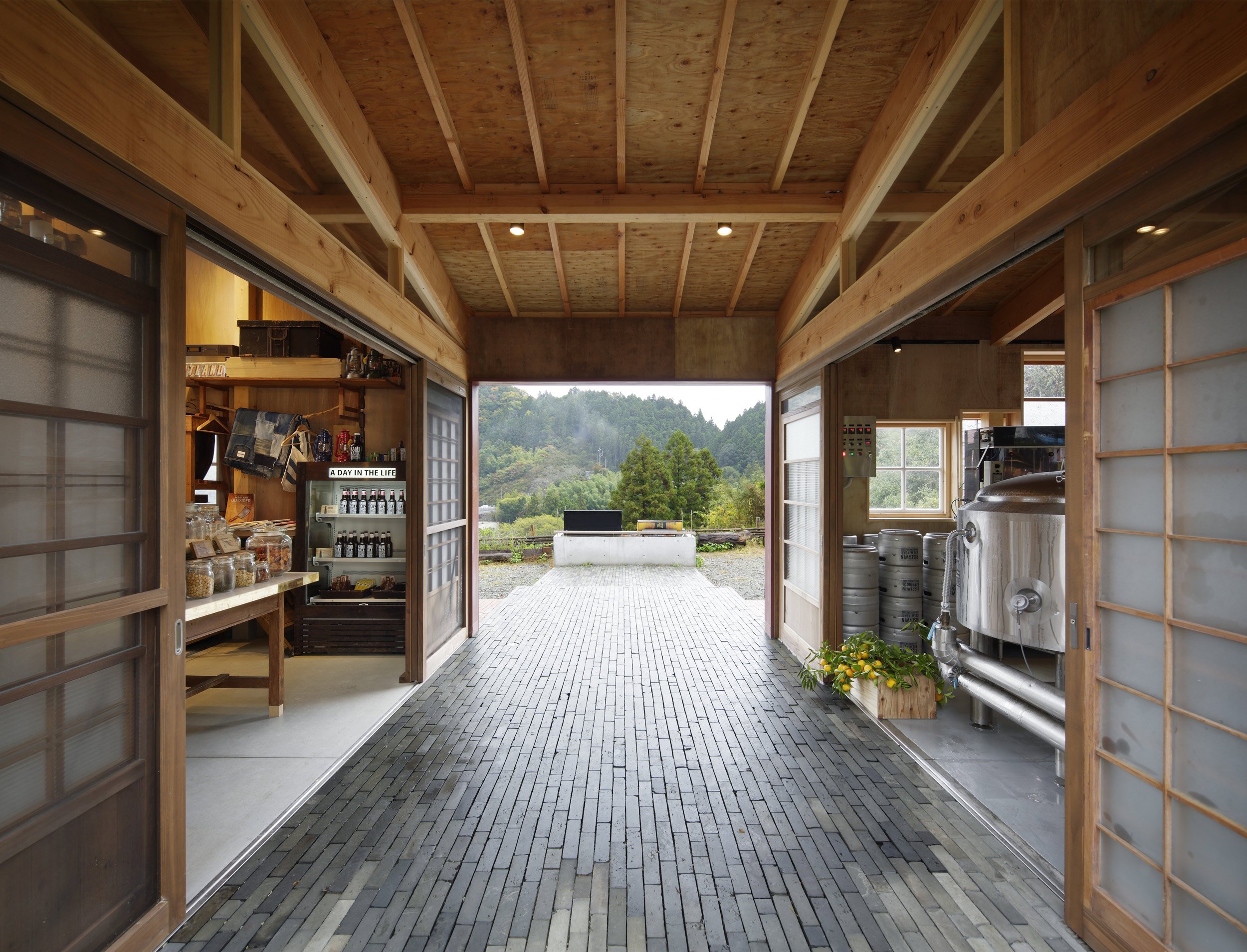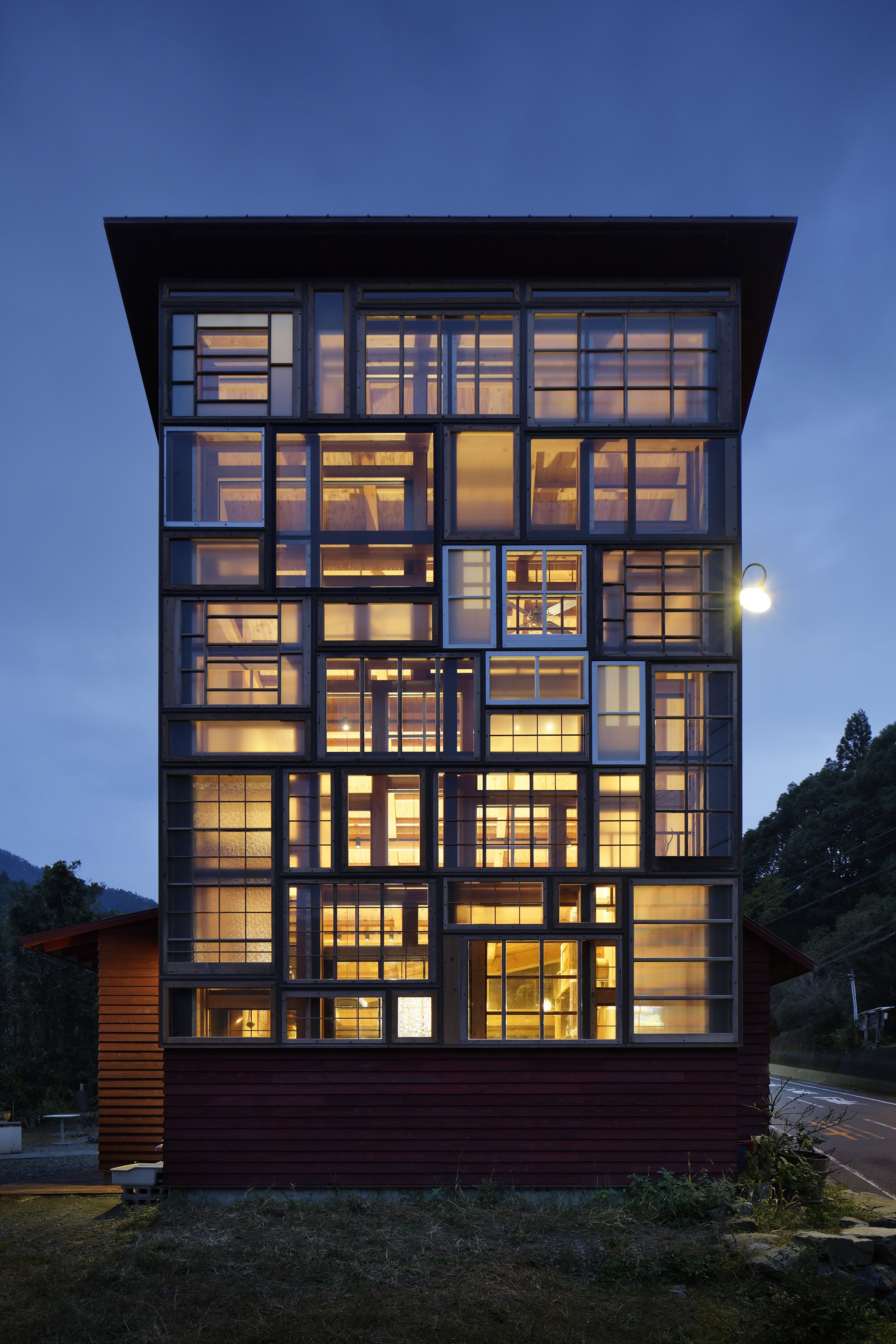 A high ceiling and ceiling fan allow the air to naturally ventilate the interior during the summer months, while the double layer fittings act as efficient insulators during the winter. Heat comes from the carbon-neutral heater, fueled by branches found in the nearby forest. The cladding features local cedar board wood left over as waste and colored with a natural, persimmon-derived paint. Even the furniture, lighting, and décor elements come from the town. Bridal chests as well as recycled farm equipment appear alongside re-used tiles from a factory, empty bottles that form a quirky chandelier, and wallpaper made of old newspaper. The embodiment of the town’s passion and dedication to a green lifestyle, the public house also encourages the community to see not only the nobility, but also the creative and fun side of their chosen way of living. Photographs© Koji Fujii / Nacasa and Partners Inc.