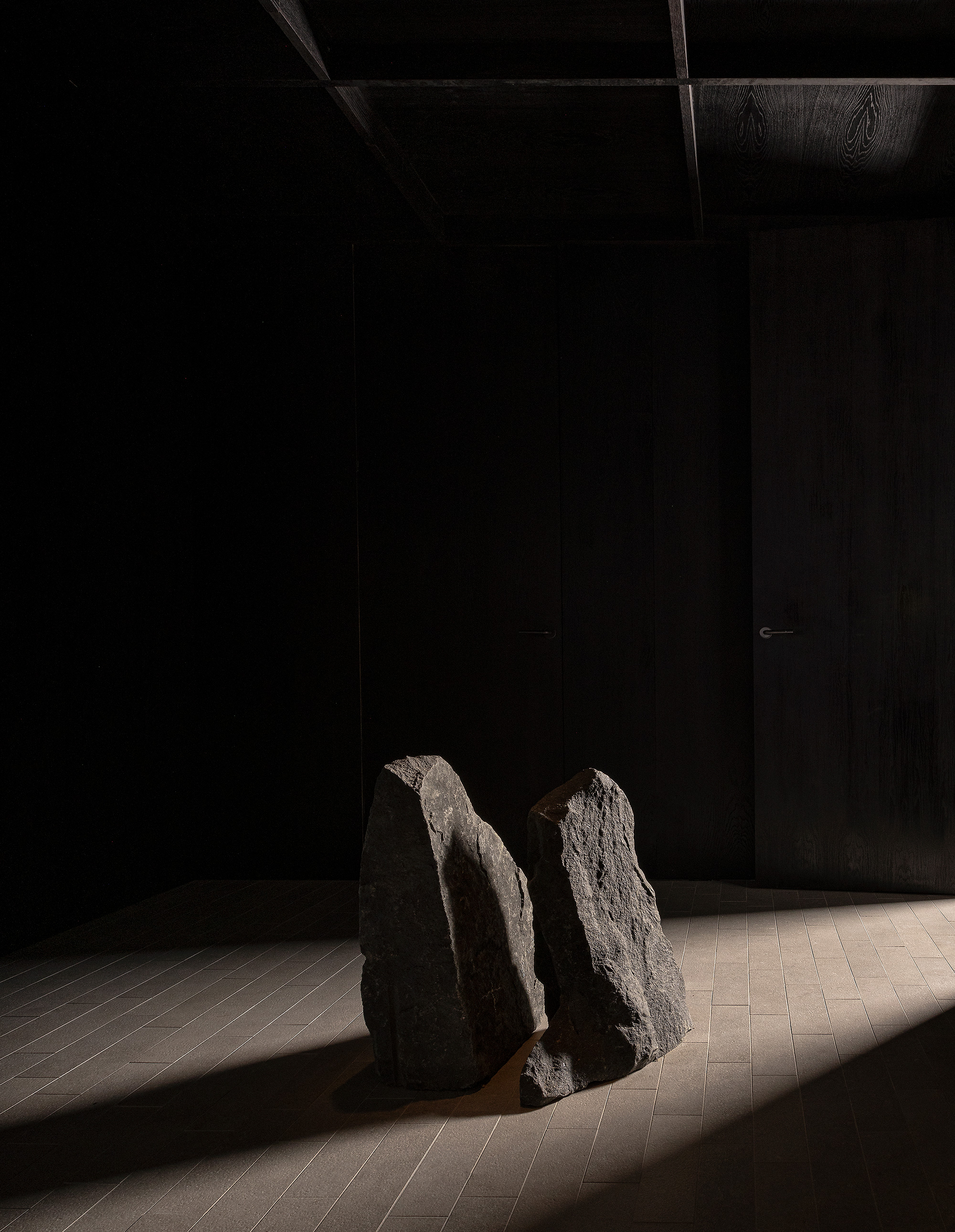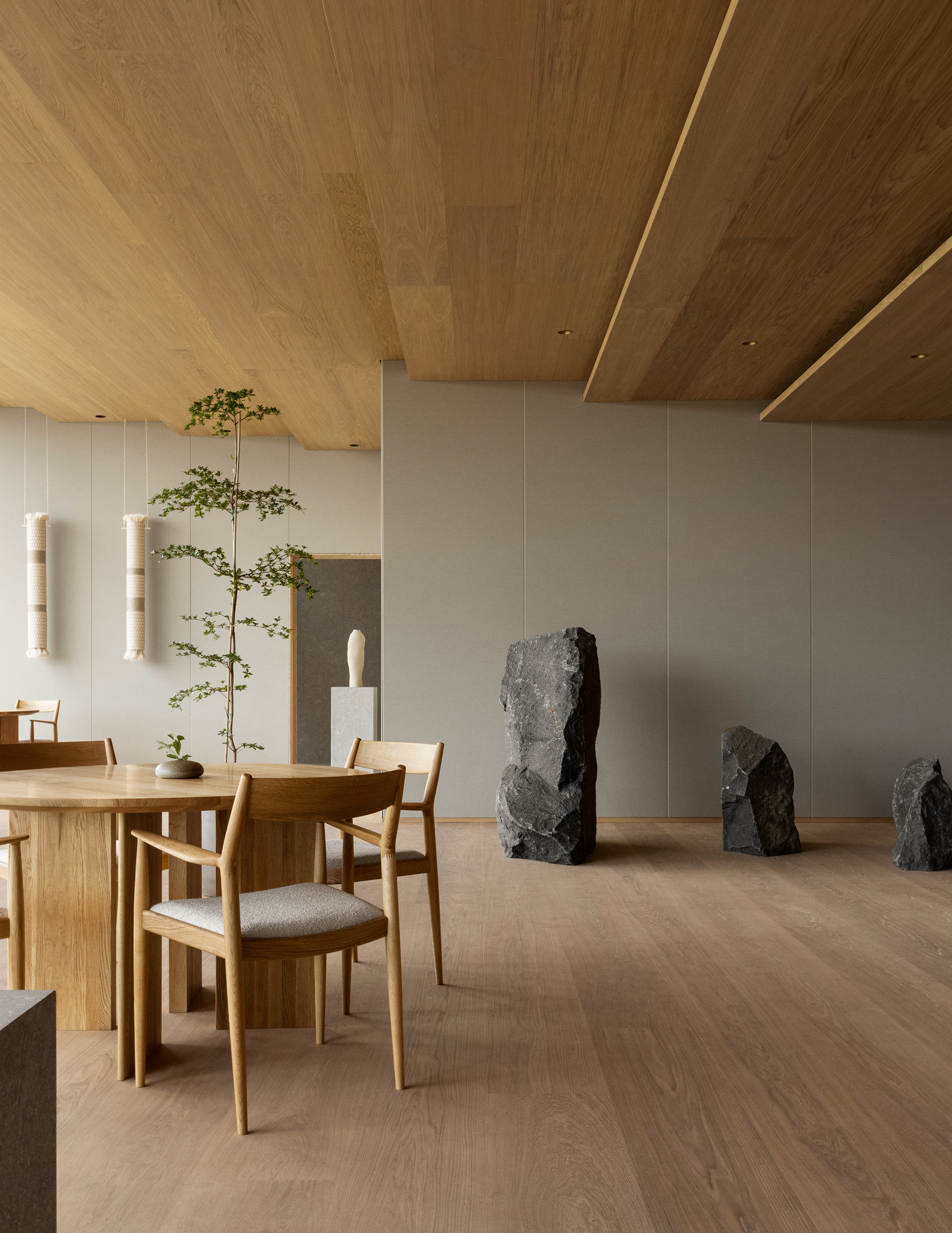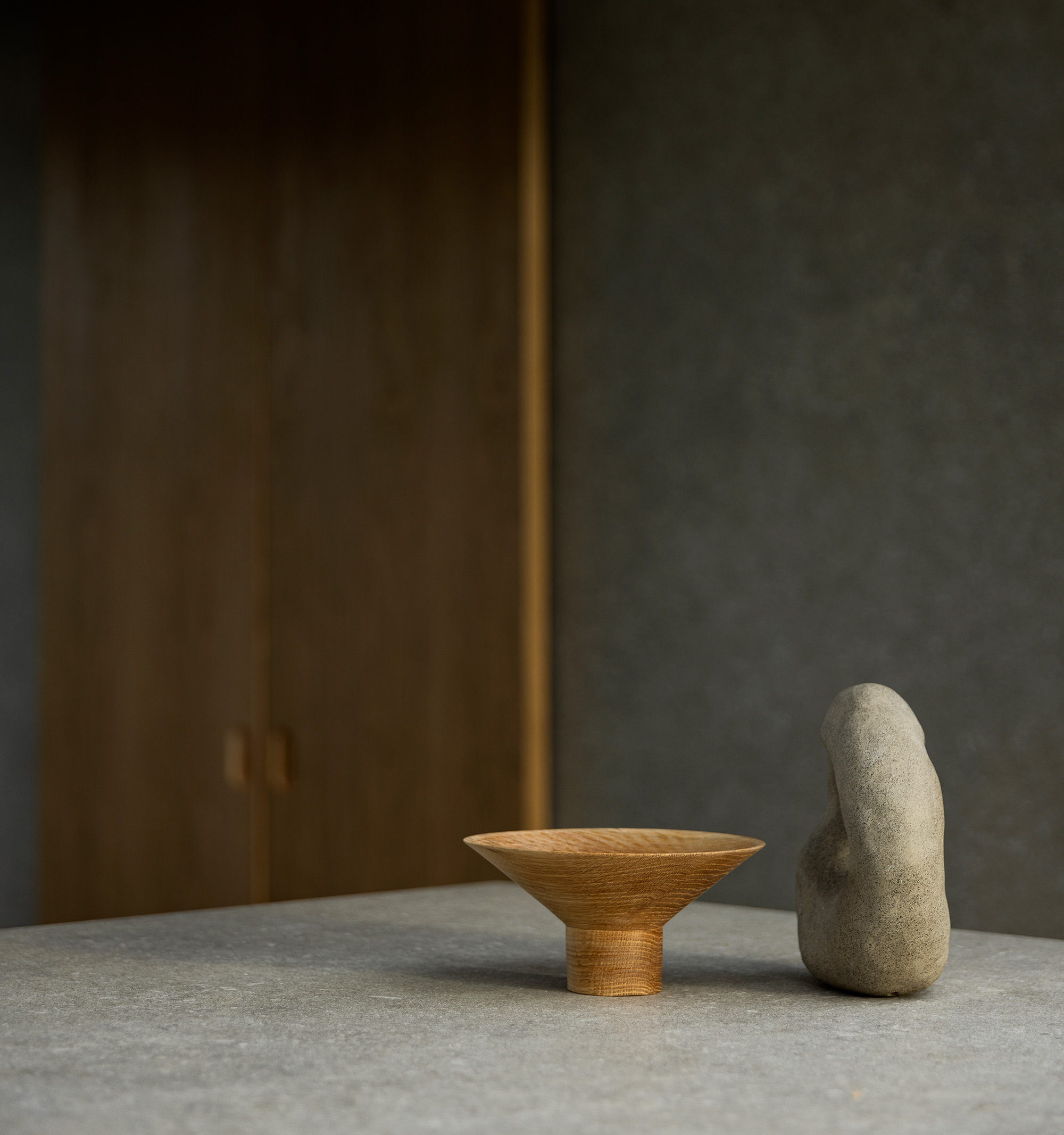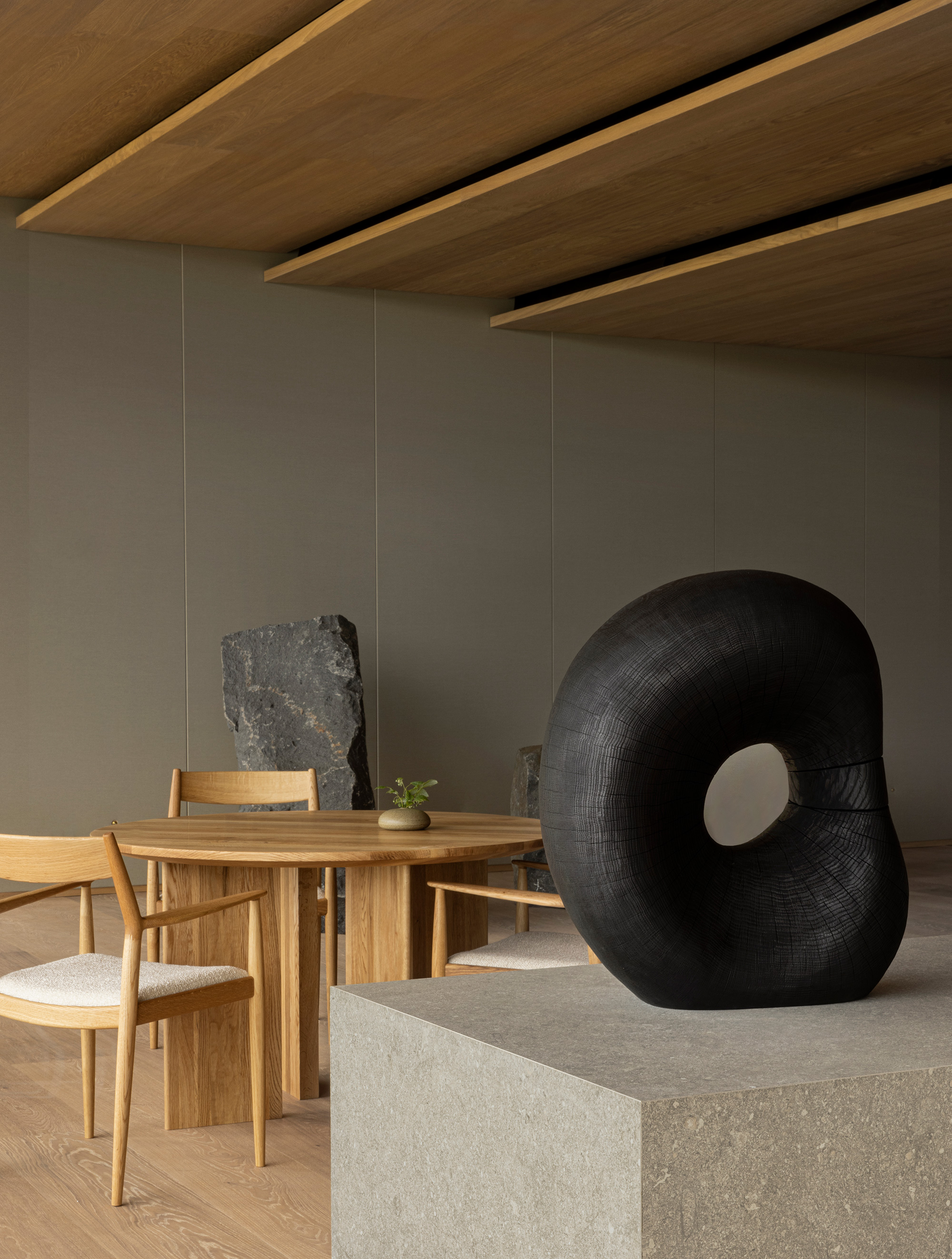 The restaurant contains a bar and lounge area on the ground floor. In the basement level, there’s the more intimate dining area and wine lounge as well as a wine cellar. The rural scenery informed the studio’s choice of materials. Both the solid oak furniture and the stone and timber flooring complement the canvas wall panels. The interiors feature furniture pieces from the Karimoku collection along with several new designs. These bespoke pieces include a geometric coffee table, a 2-seater club chair, a serving trolley and wooden trays designed by Norm Architects, as well as a circular dining table by Keiji Ashizawa. Made from Japanese oak, these new furniture designs will join the rest of the permanent Karimoku collection this fall. Photographs © Norm Architects.