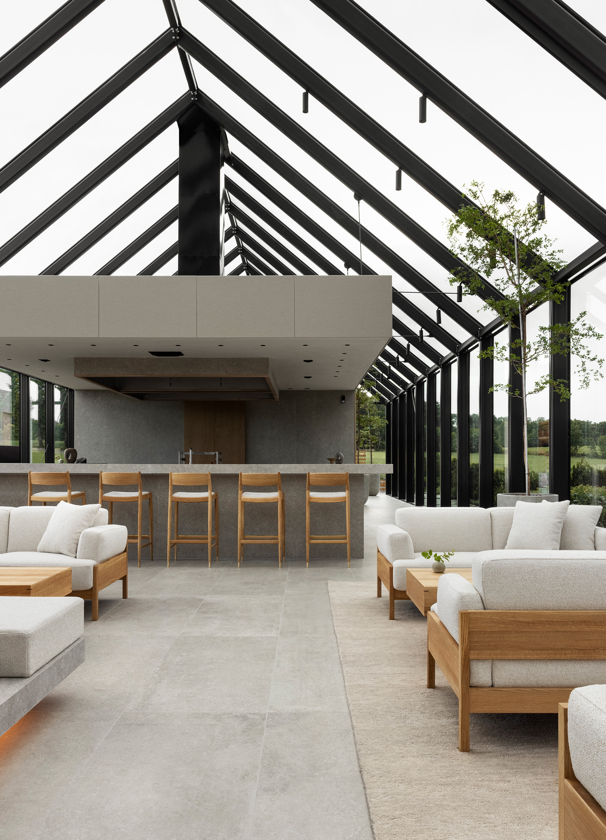 A barn-like glass greenhouse designed for a Michelin-starred restaurant.