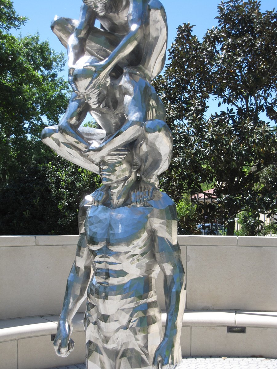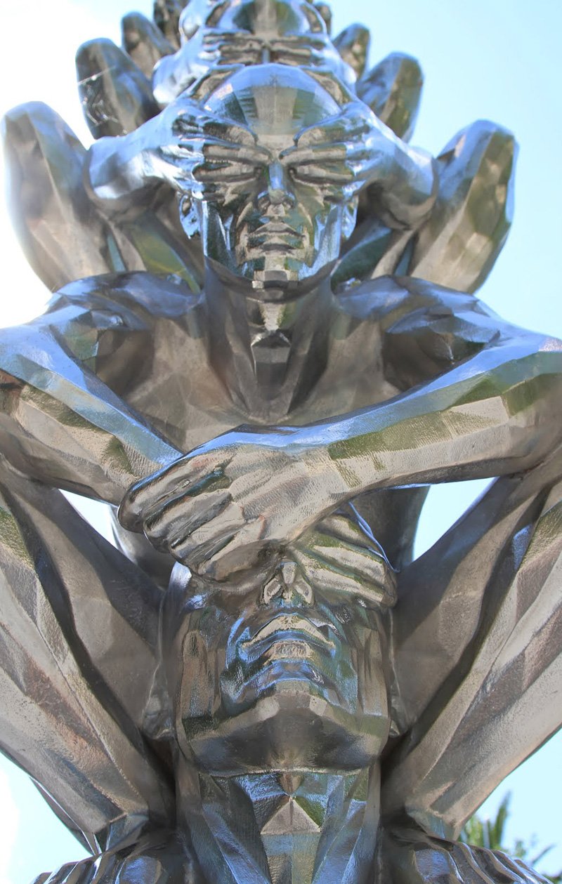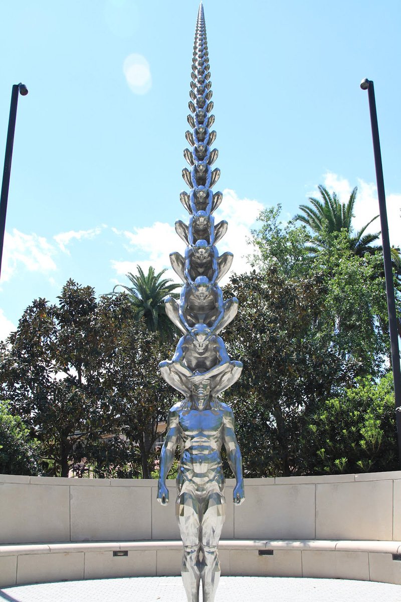 Renowned for his large-scale installations, Korean artist Do Ho Suh continues to deliver impact through both concept and construction. Karma is a brushed stainless steel sculpture that towers seven meters high, both formidable and frightening. From far away, the sculpture appears to be an elegant spine, with each vertebrae gently curving past the next, though a closer look reveals the presence of 98 human figures stacked atop one another. A striding male holds up the remaining 97 who squat and cover the eyes of the one below. A visual representation of Karmic connection, the outdoor installation solicits fear and admiration alike.