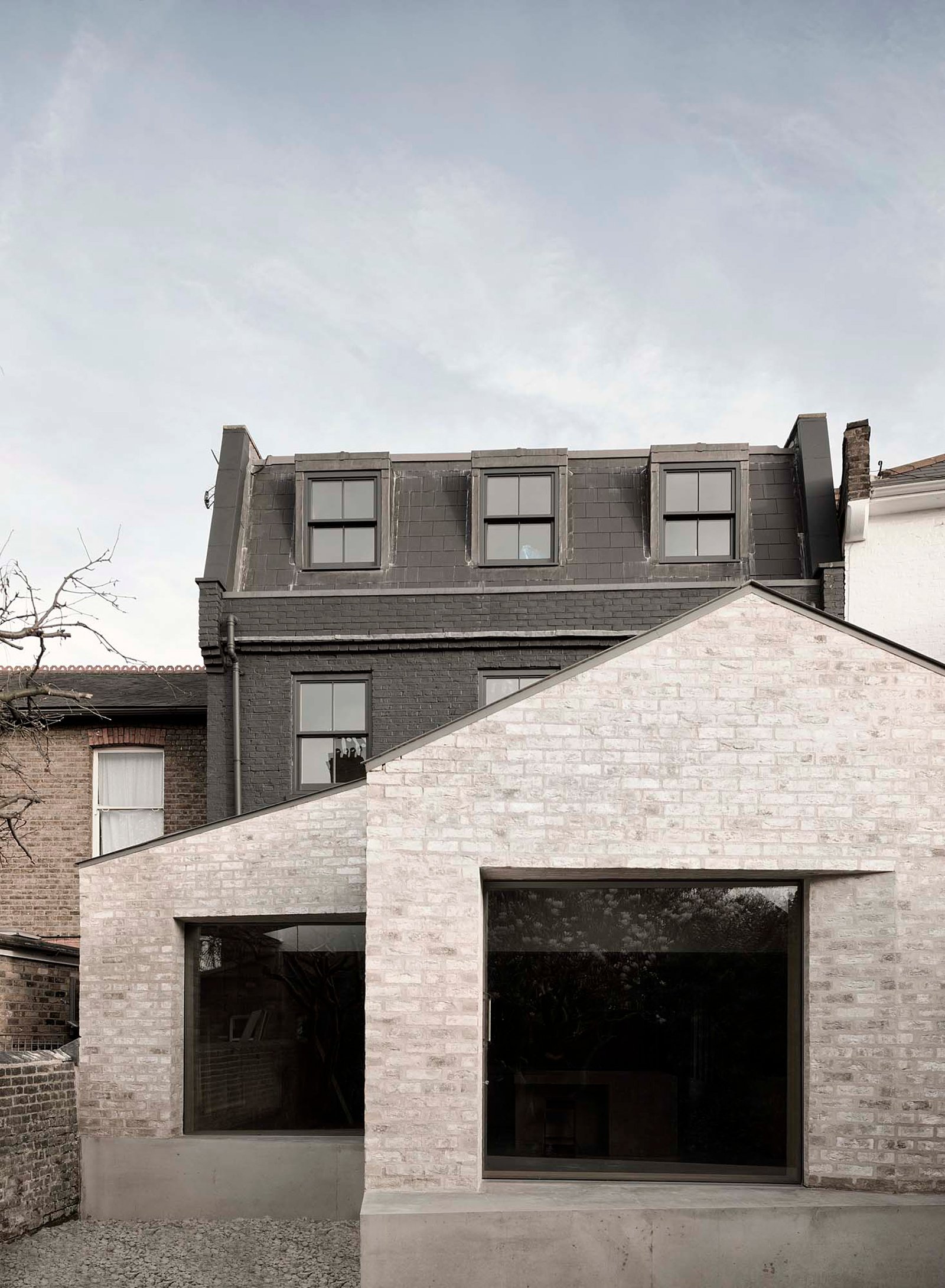 Part Victorian house, part former stable yard, this beautiful property in London recently underwent a major transformation. The owners hired the McLaren.Excell architecture practice to complete the complex re-structuring project and make their ideal home a reality. Initially housing multiple small rooms, the dwelling became a refined and bright living space defined by its thoughtful exploration of volumes, solidity and contrasts. Kew House now features a new rear extension, designed with two chamfered forms. The light brick exterior boasts a rough lime mortar finish, contrasting the painted façade of the house. Tapering windows and wedge shapes combine with the interlocking pitched roofs to give the extension a distinctive appearance. The structure almost brings natural rock formations to mind.
