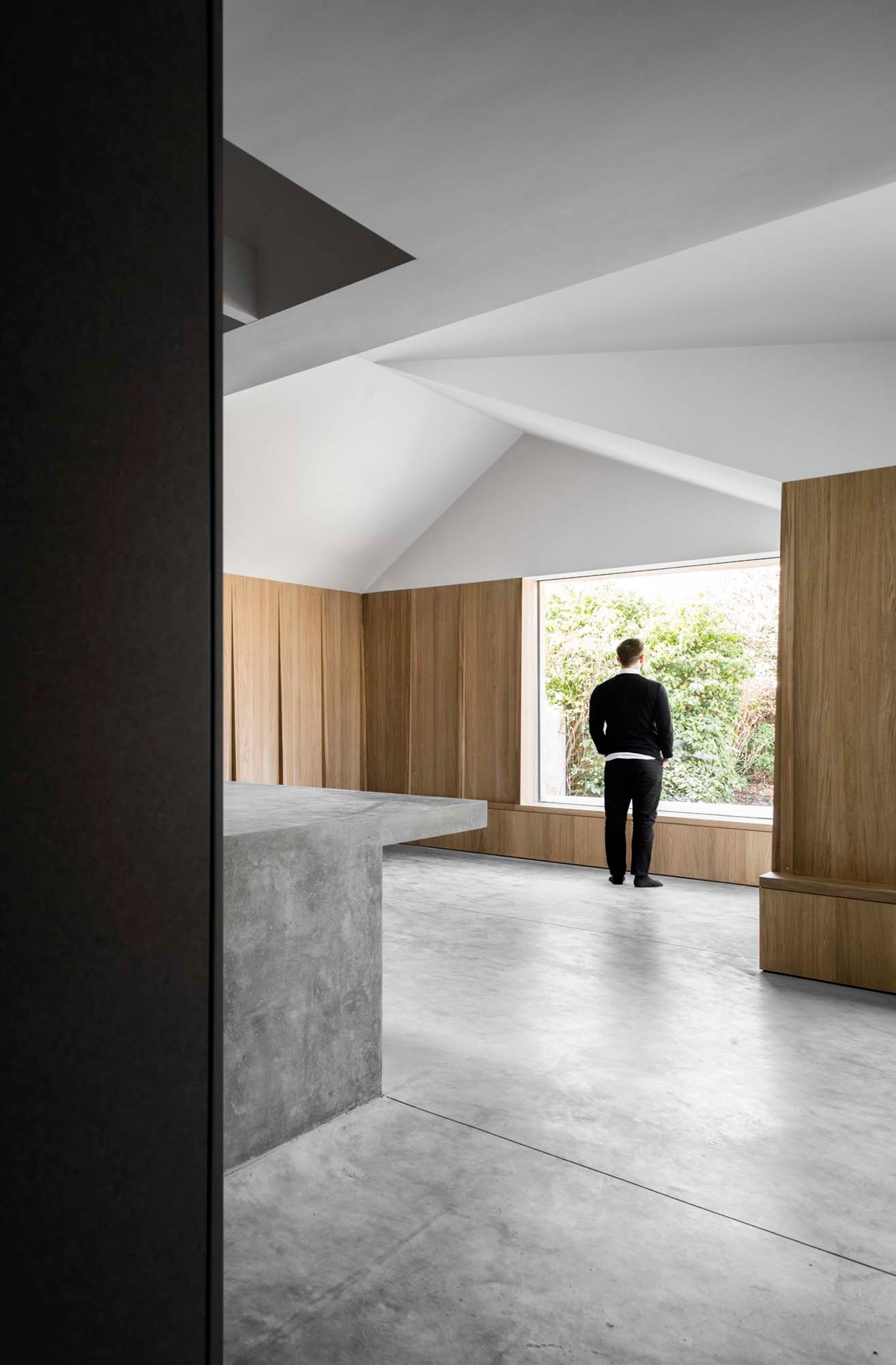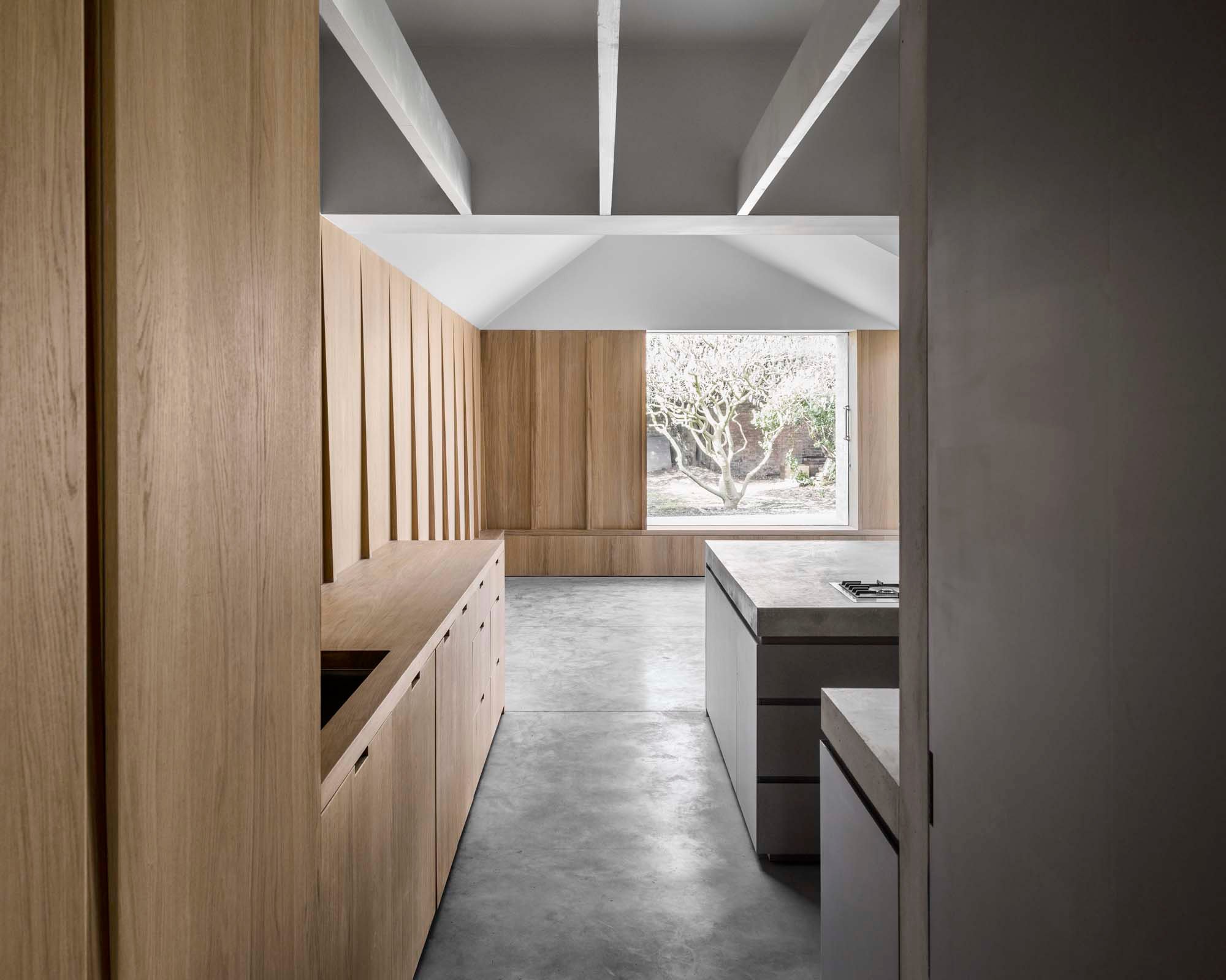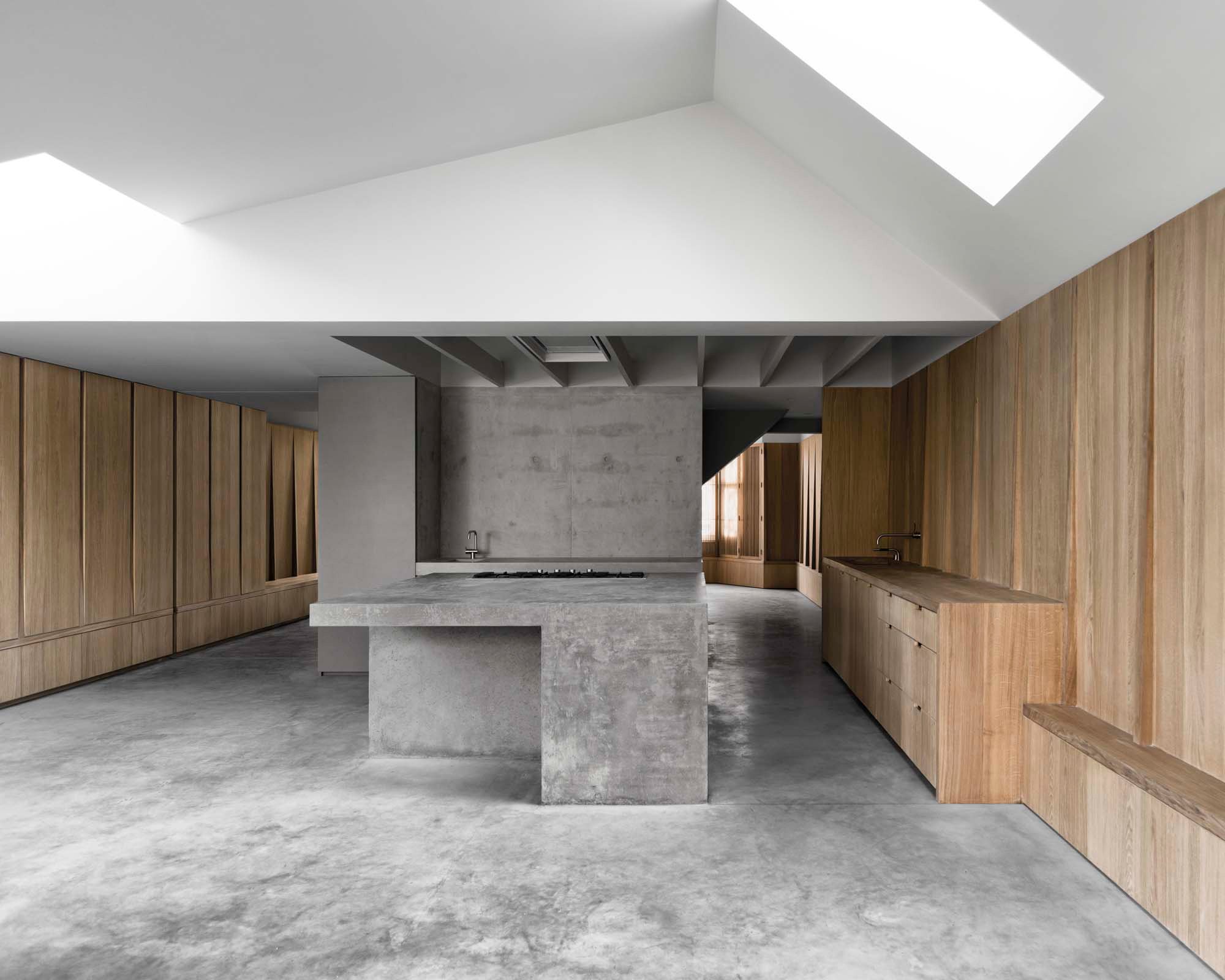 Eye-catching ceiling folds and geometric shapes add a dramatic accent to the interior, while concrete elements connect the living spaces. Concrete floors, a sculptural island, and a central wall which forms the heart of the home stand out on the ground level. Here, large windows frame the garden as well as an old magnolia tree. Oak wall panels and furniture provide the perfect counterpoint to the solidity of stone and concrete, bringing a touch of rustic warmth at the same time. On a ceiling, restored Victorian detailing reminds of the house’s past, while modern, minimalist bathrooms and an understated décor celebrate its new identity. Photographs © Simone Bossi.