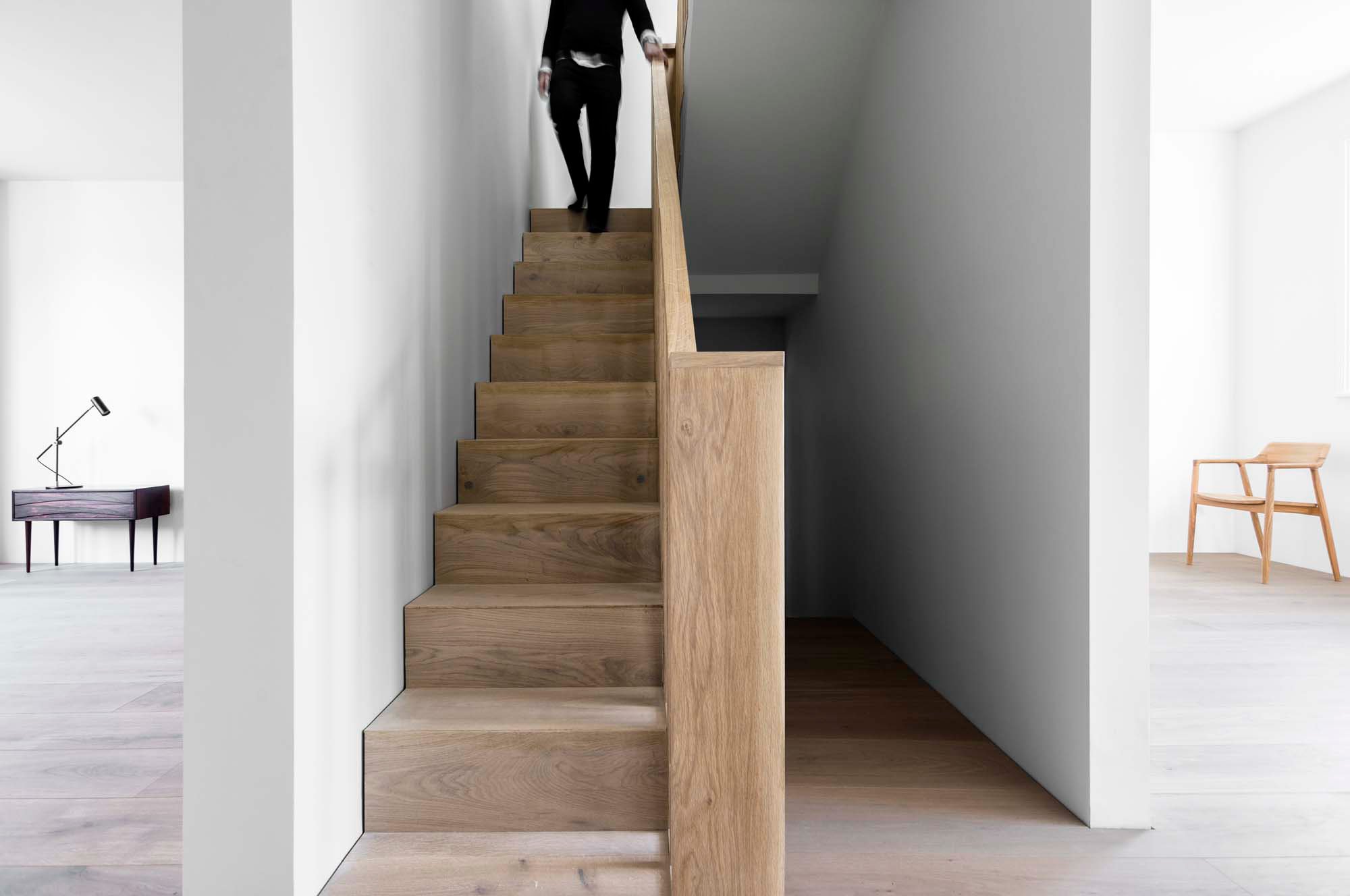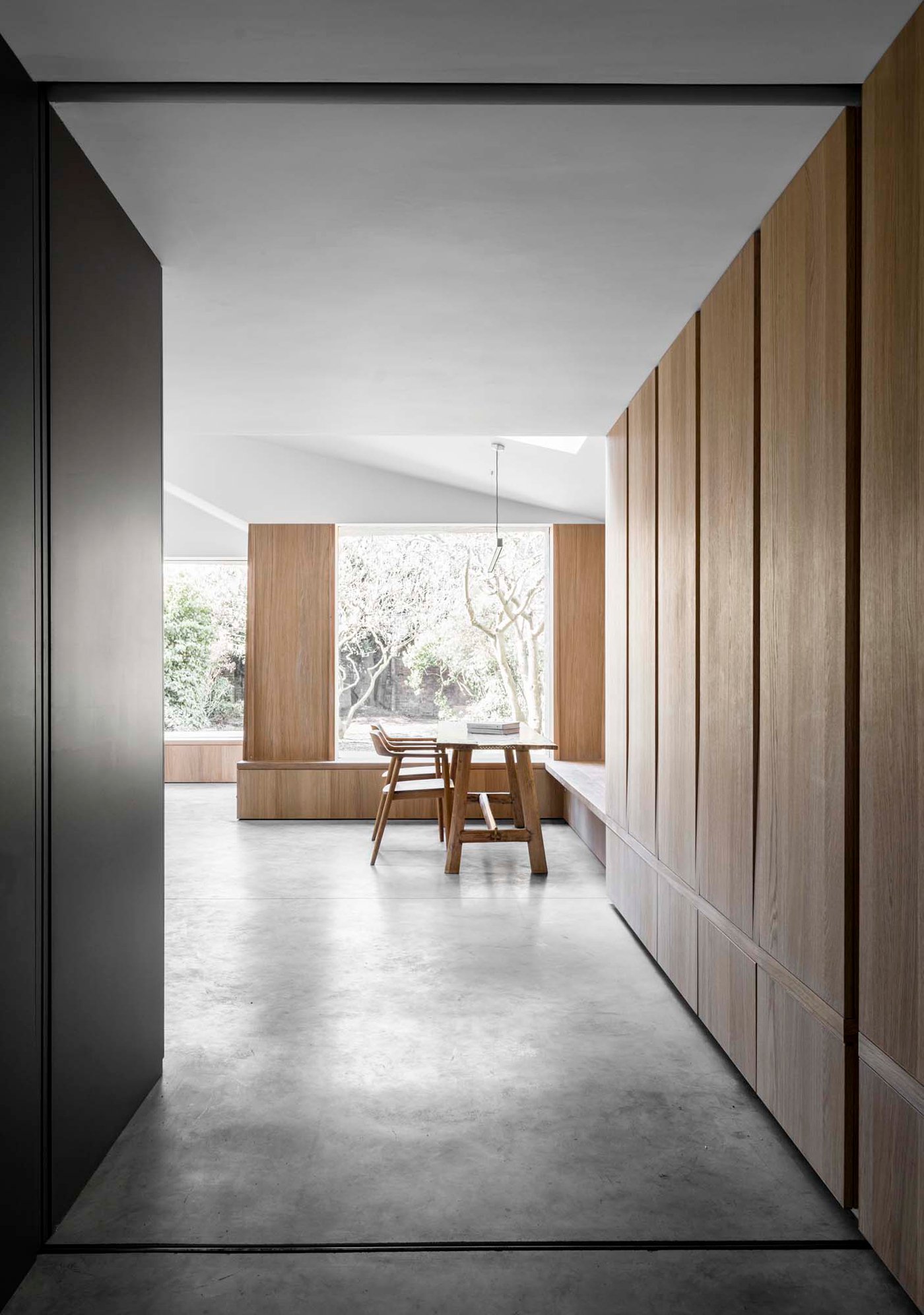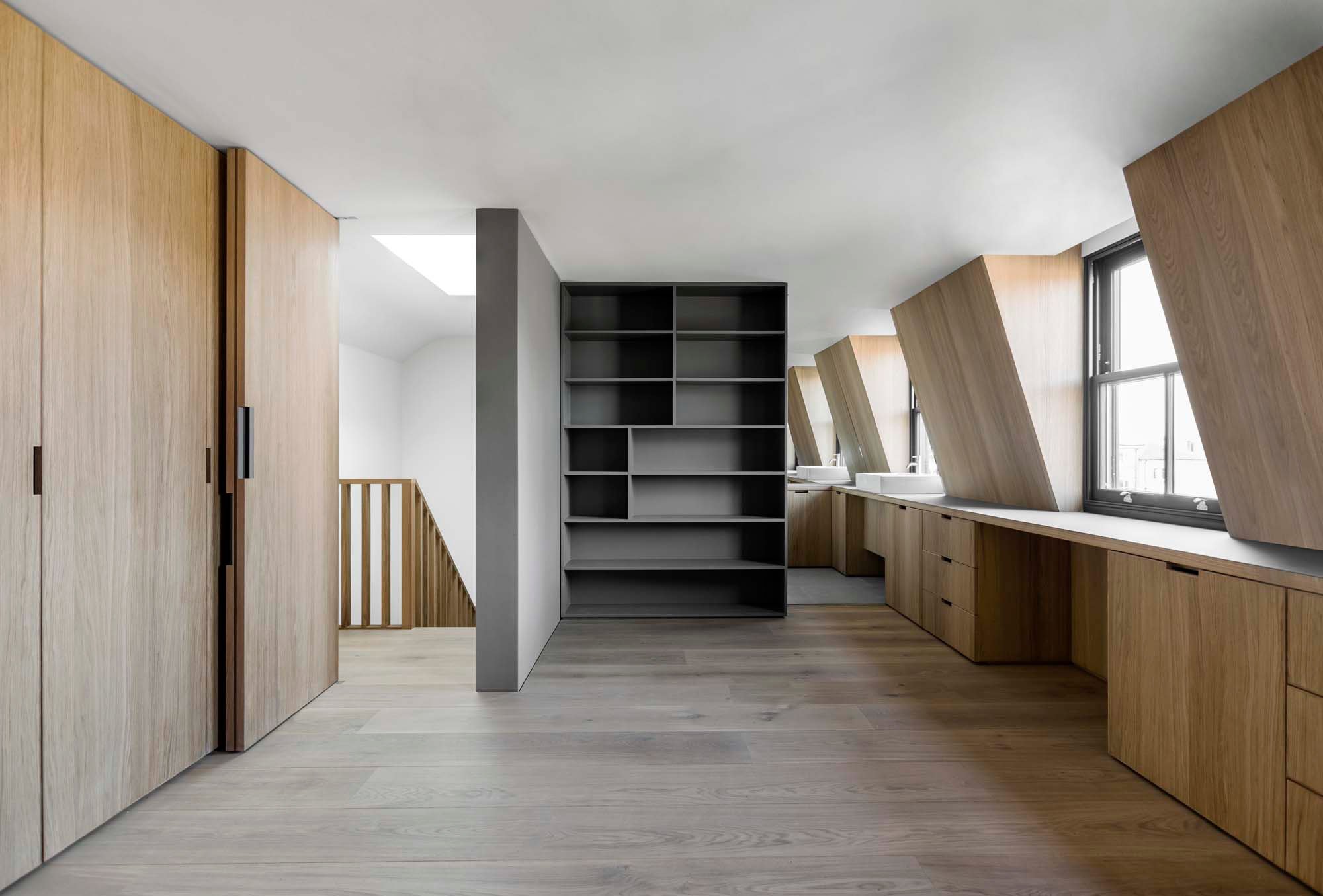 Eye-catching ceiling folds and geometric shapes add a dramatic accent to the interior, while concrete elements connect the living spaces. Concrete floors, a sculptural island, and a central wall which forms the heart of the home stand out on the ground level. Here, large windows frame the garden as well as an old magnolia tree. Oak wall panels and furniture provide the perfect counterpoint to the solidity of stone and concrete, bringing a touch of rustic warmth at the same time. On a ceiling, restored Victorian detailing reminds of the house’s past, while modern, minimalist bathrooms and an understated décor celebrate its new identity. Photographs © Simone Bossi.