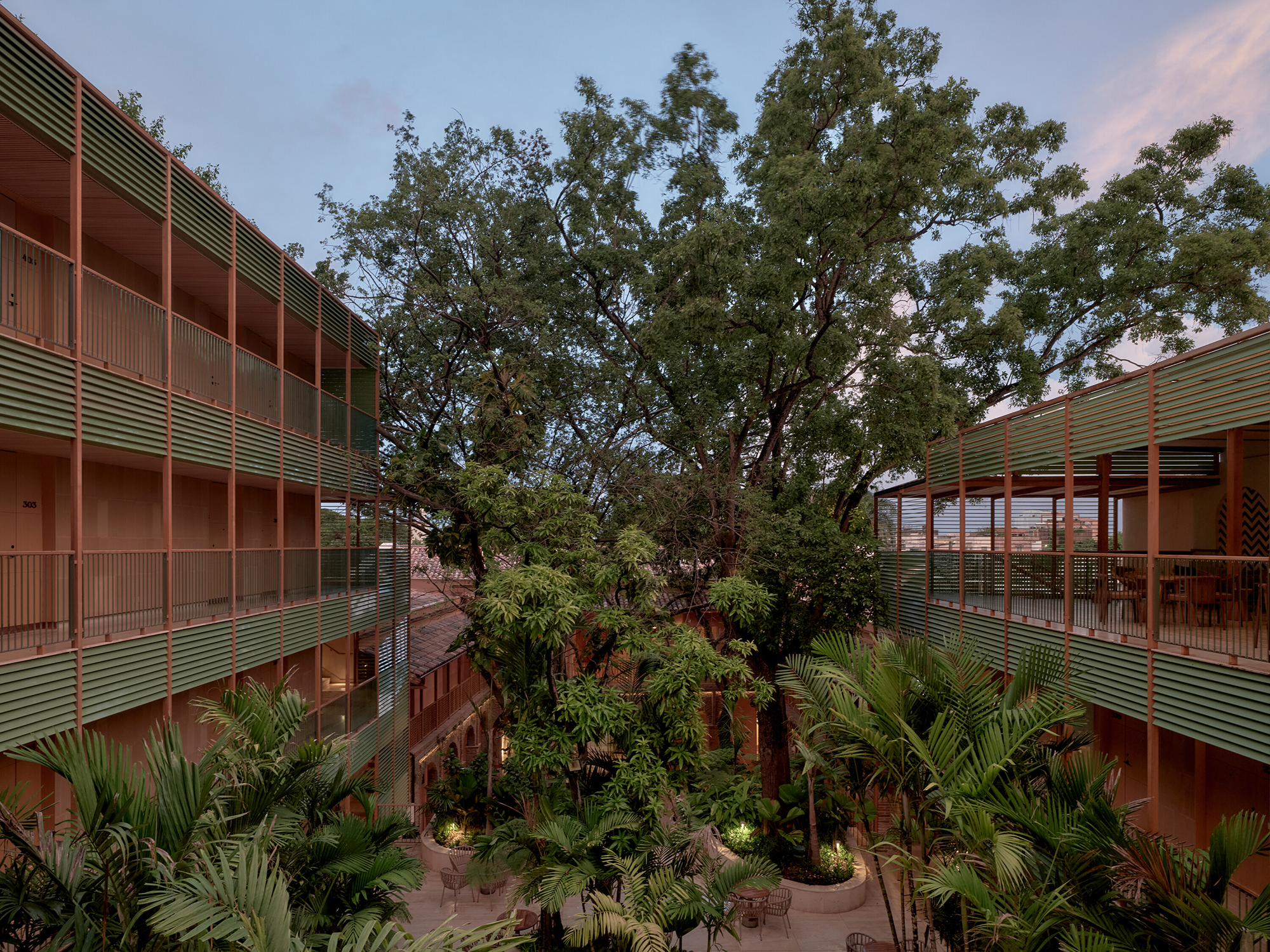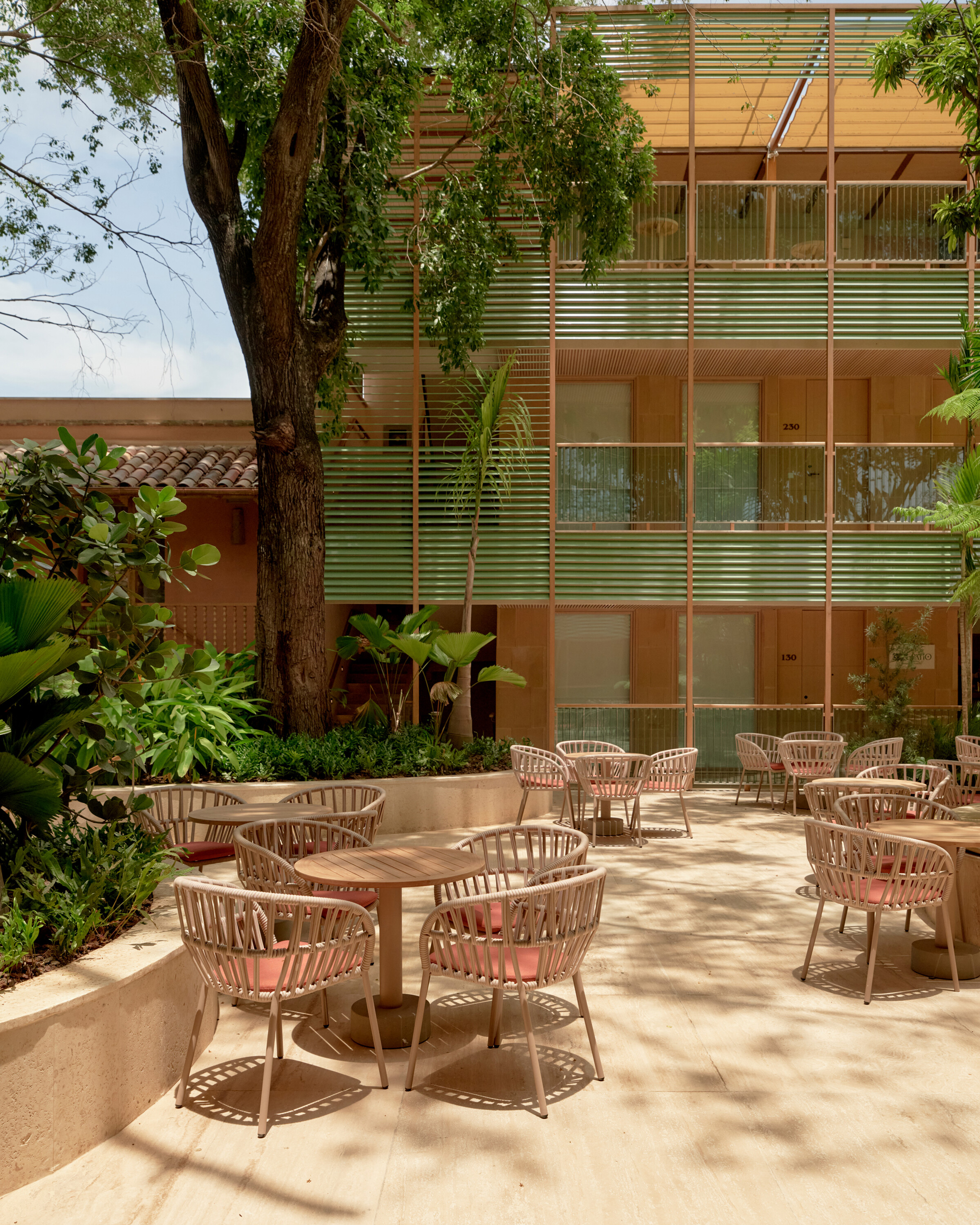 The 130-room hotel is more than a place to stay—it’s an extension of the city. Public courtyards weave through the property, blurring the line between private and communal space. The design embraces Santo Domingo’s climate, with permeable sidewalks, native vegetation, and naturally ventilated walkways that channel the breeze. Inside, materials like travertine, wood, and ceramics reflect the region’s character, while locally sourced timber, chosen for its sustainability and insulating properties, keeps interiors cool in the tropical heat.