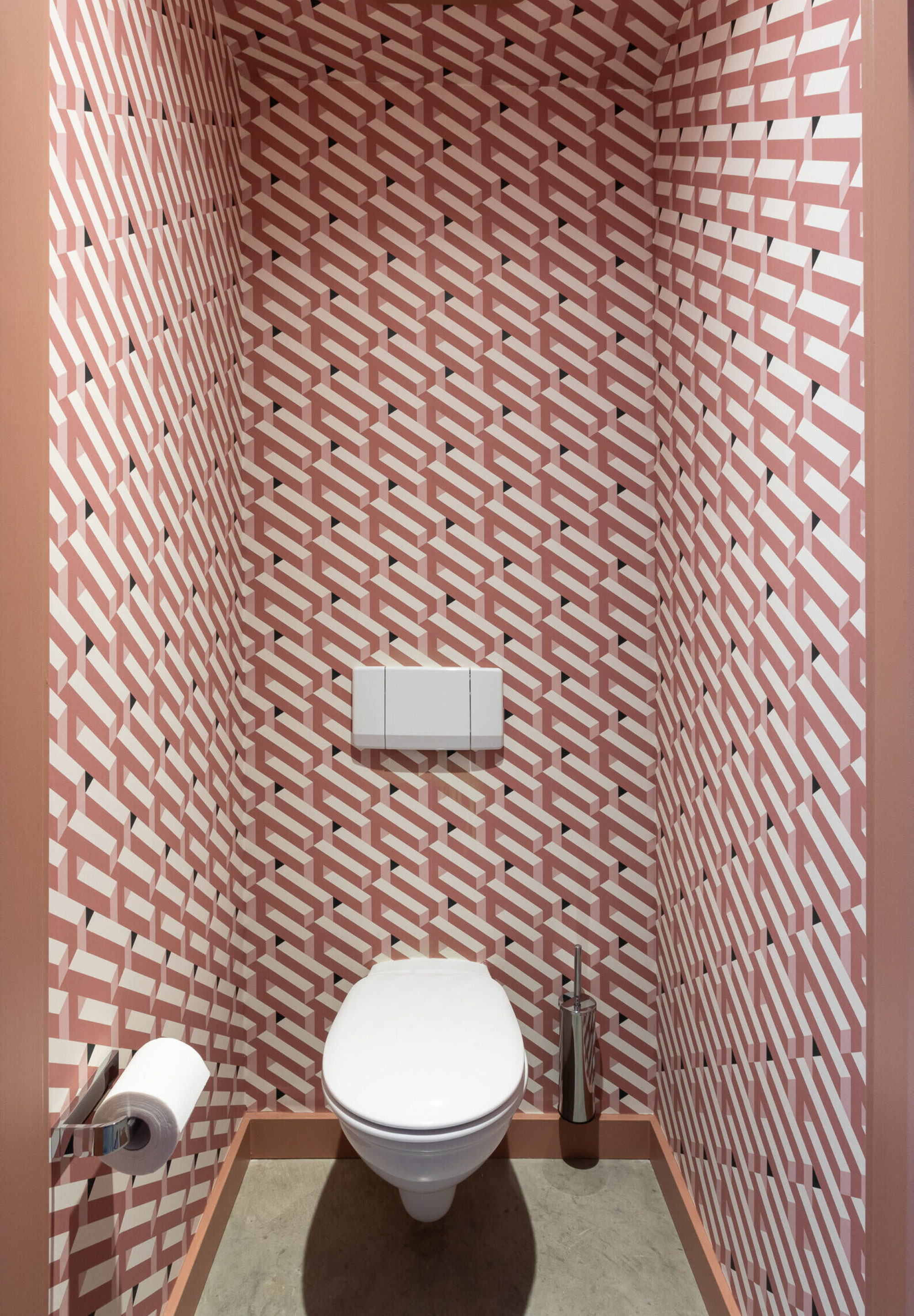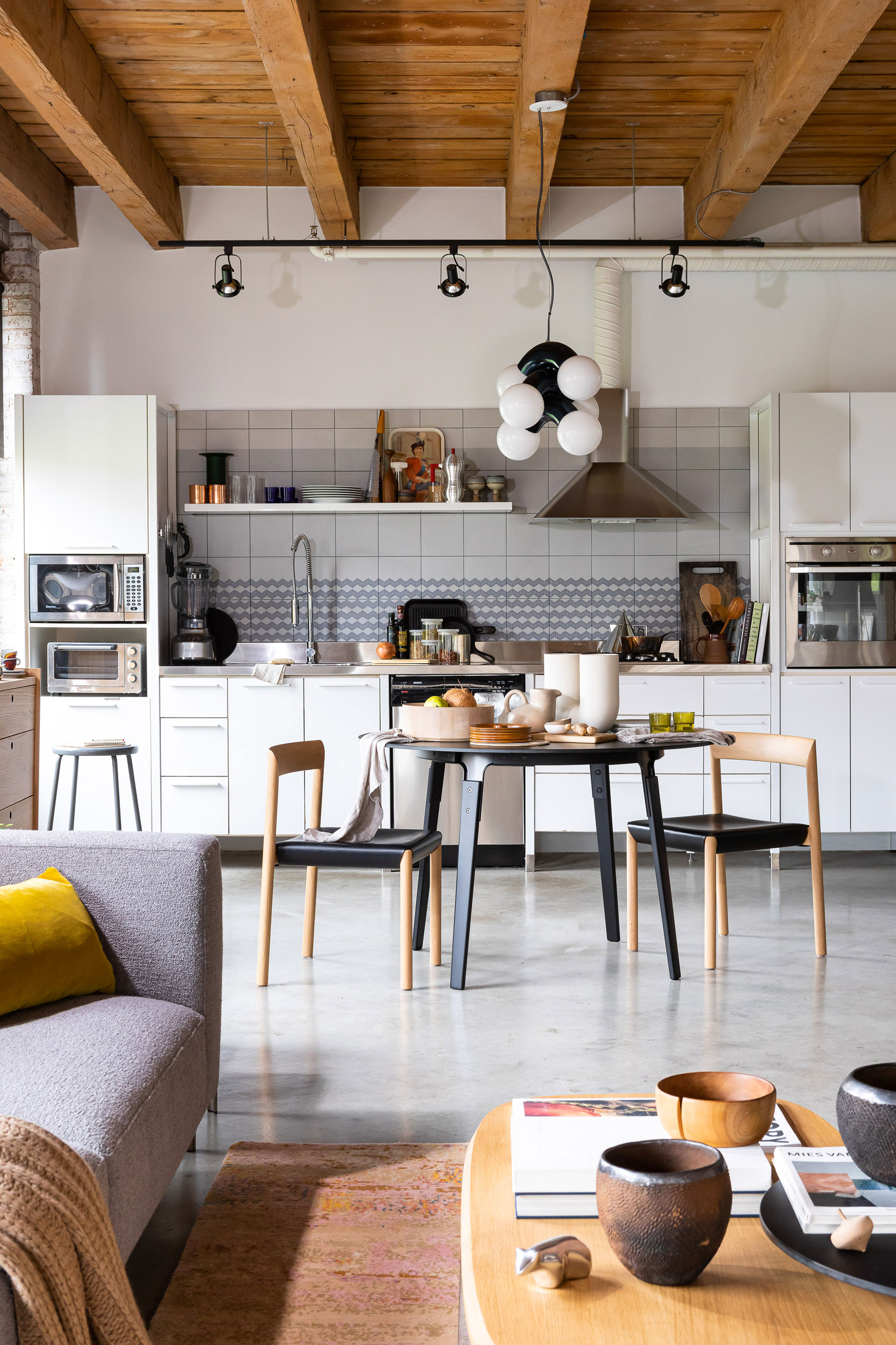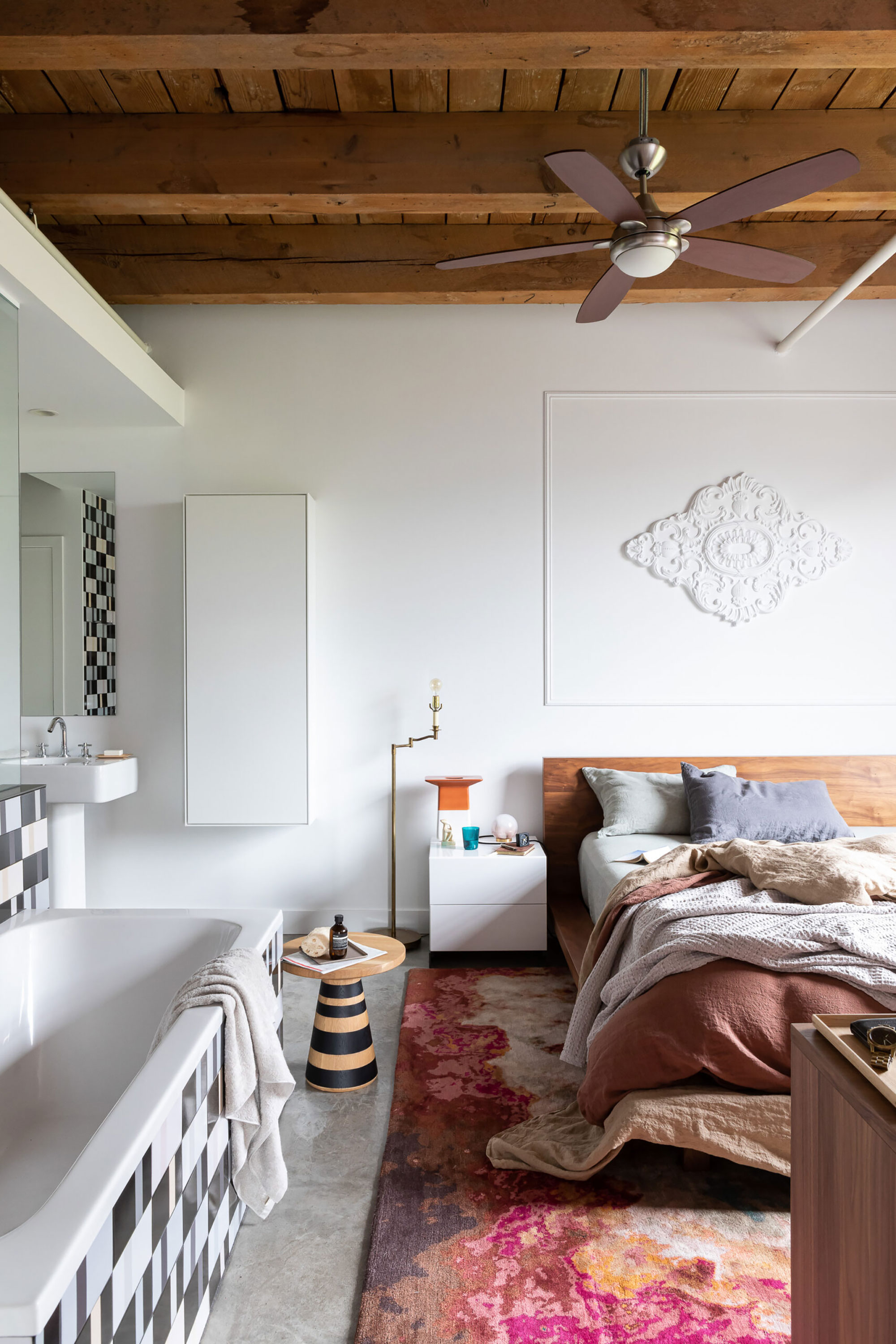 The new loft boasts vibrant colors and patterns, capturing the client’s preference for vibrant design. The studio rebuilt some areas and also curated a selection of vintage and contemporary furniture, lighting, and decorative items. Multilayered and full of design gems, the interior is both stylish and fun. To add warmth to the polished concrete floor, the team used a series of Jan Kath Artwork 19 rugs. In the dining area, the designers paired the Magis Steelwood bistro table with Bensen Stax chairs, while a Vine 3 pendant from local lighting brand ANDlight adds a sculptural accent.