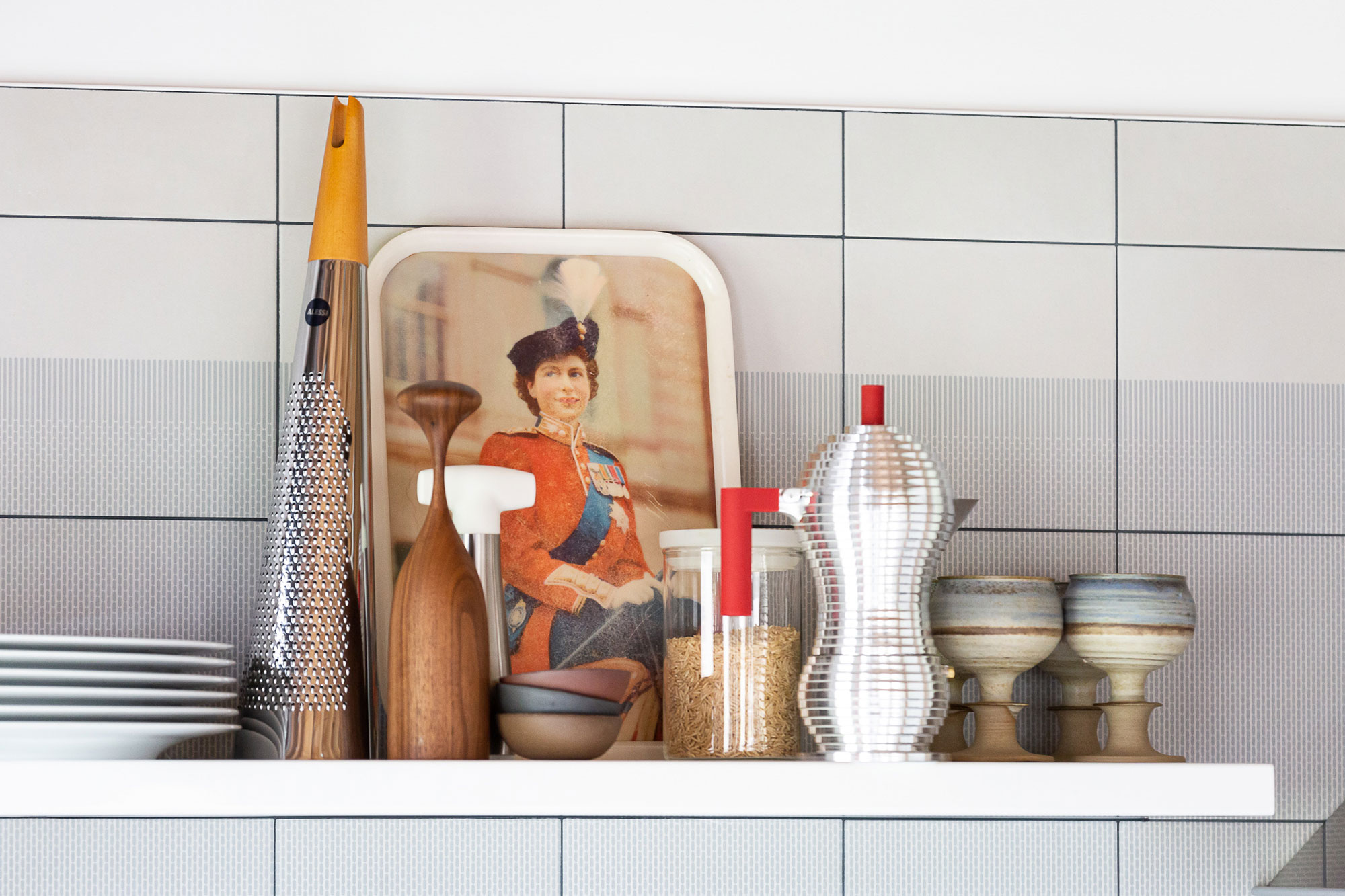 In the kitchen, the team extended the steel framed millwork and added new tiles and shelving. The open-plan living room and lounge area features a custom shelving system from Integrity Woodwork. Made with cable supported shelves, the unit provides space for the client’s collection of books, art, music and artifacts. The studio added a splash of blue to a custom chest of drawers in the bedroom, which also features an open ensuite, to connect this design with the rug and the bathtub tiles. A black tube hangs from the ceiling, holding gold brass hangers from Bocci / OAO Works. Finally, the bathroom boasts vibrant tiles carefully arranged in eye-catching patterns. Photography © Ema Peter.