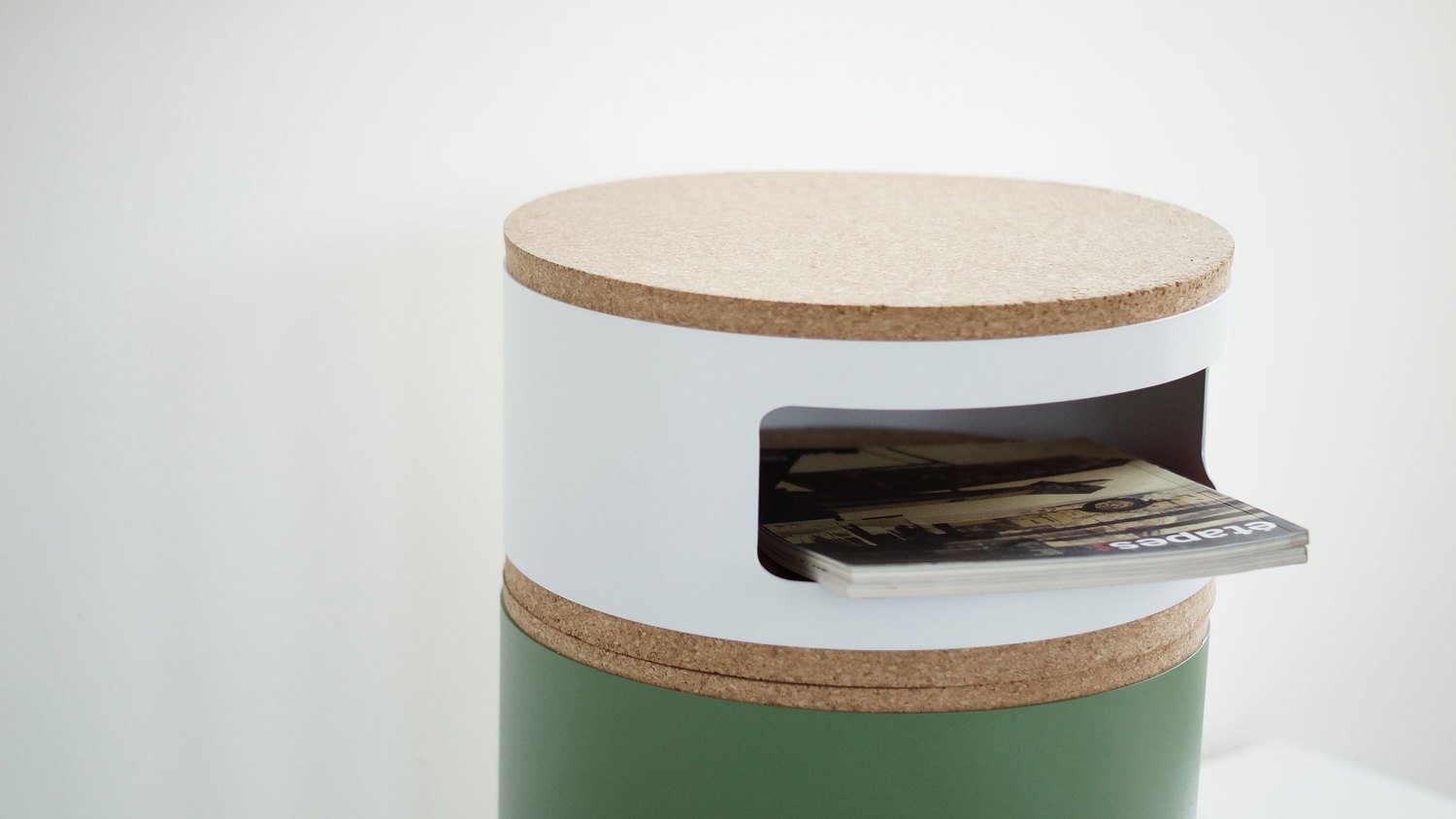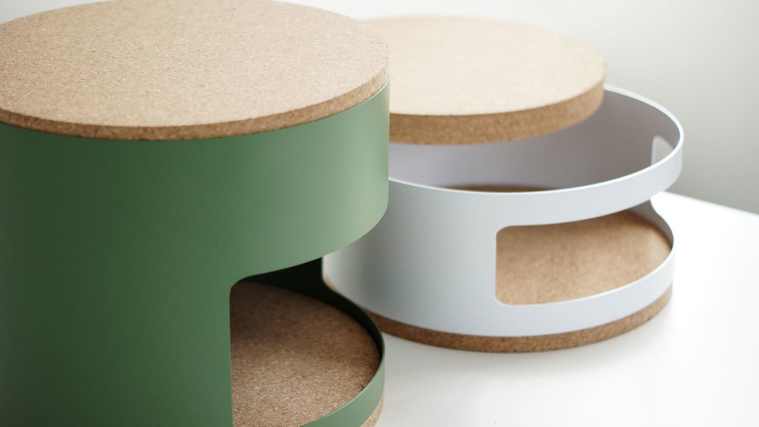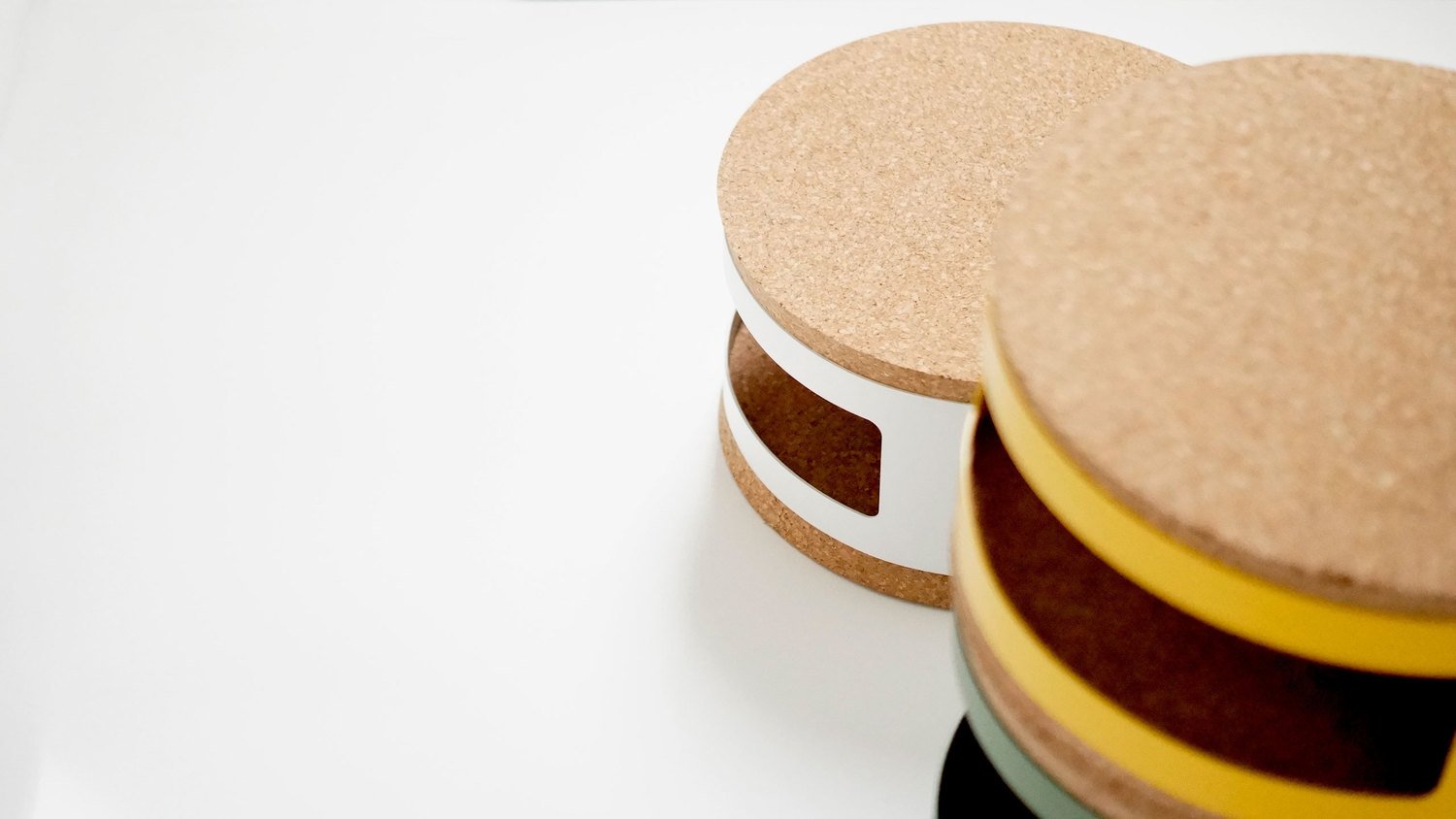 Twodesigners’ Kork is a storage module that can be used by itself or stacked with others. Made of cork and metal components that fit together without adhesive, the unit is available in two heights and four colors–yellow, green, blue, and white.