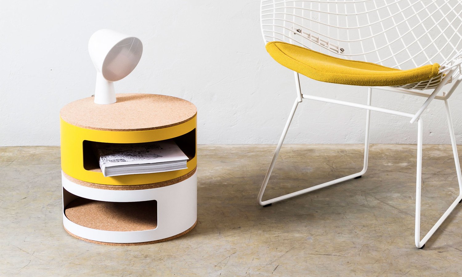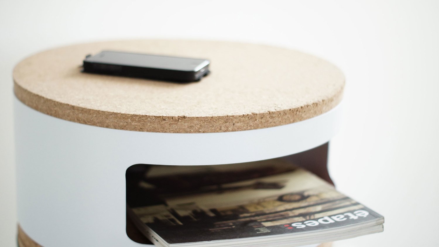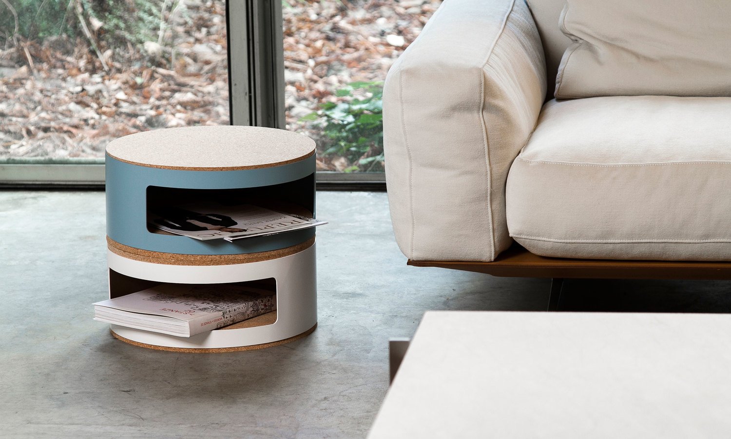 Twodesigners’ Kork is a storage module that can be used by itself or stacked with others. Made of cork and metal components that fit together without adhesive, the unit is available in two heights and four colors–yellow, green, blue, and white.