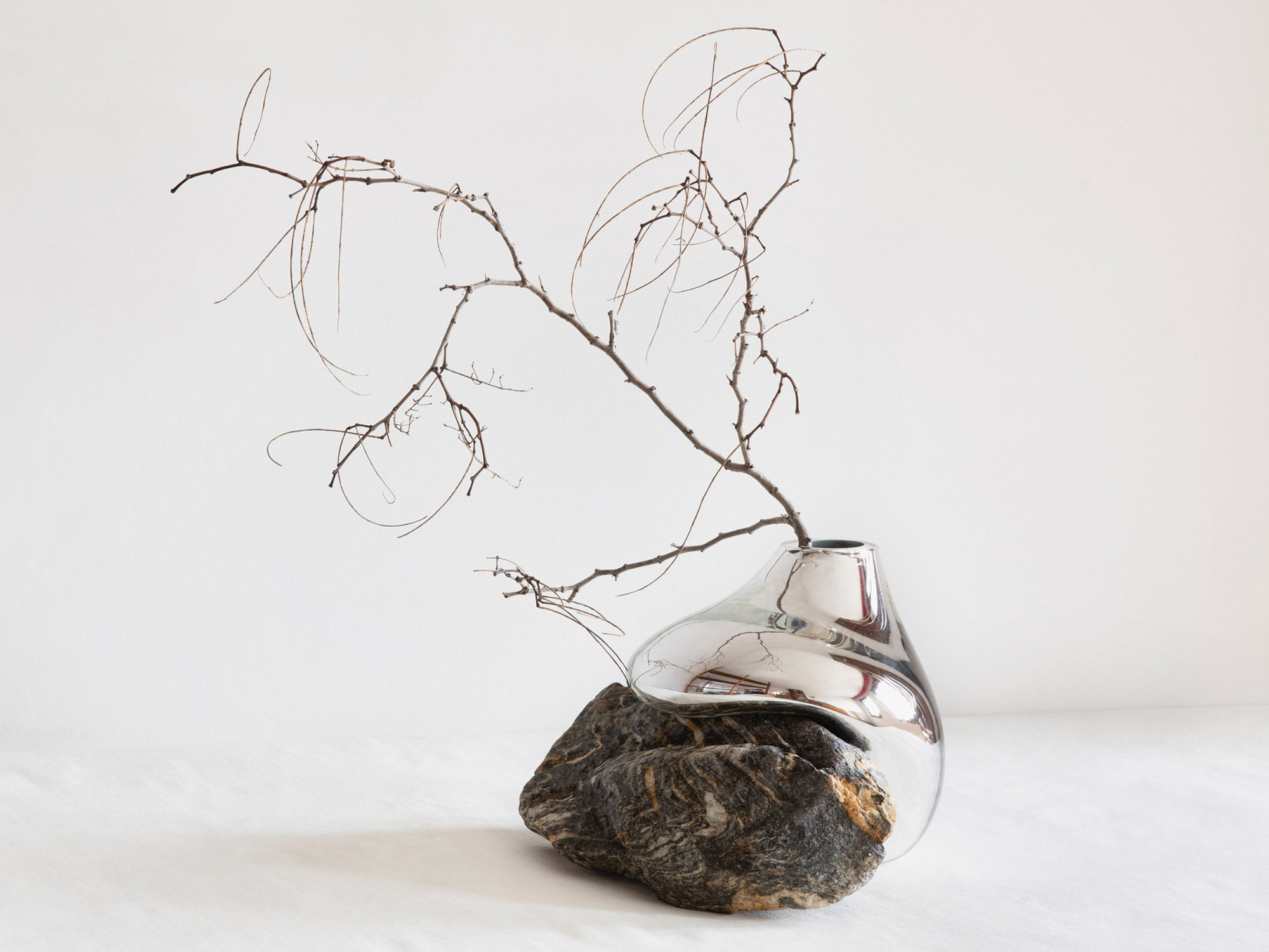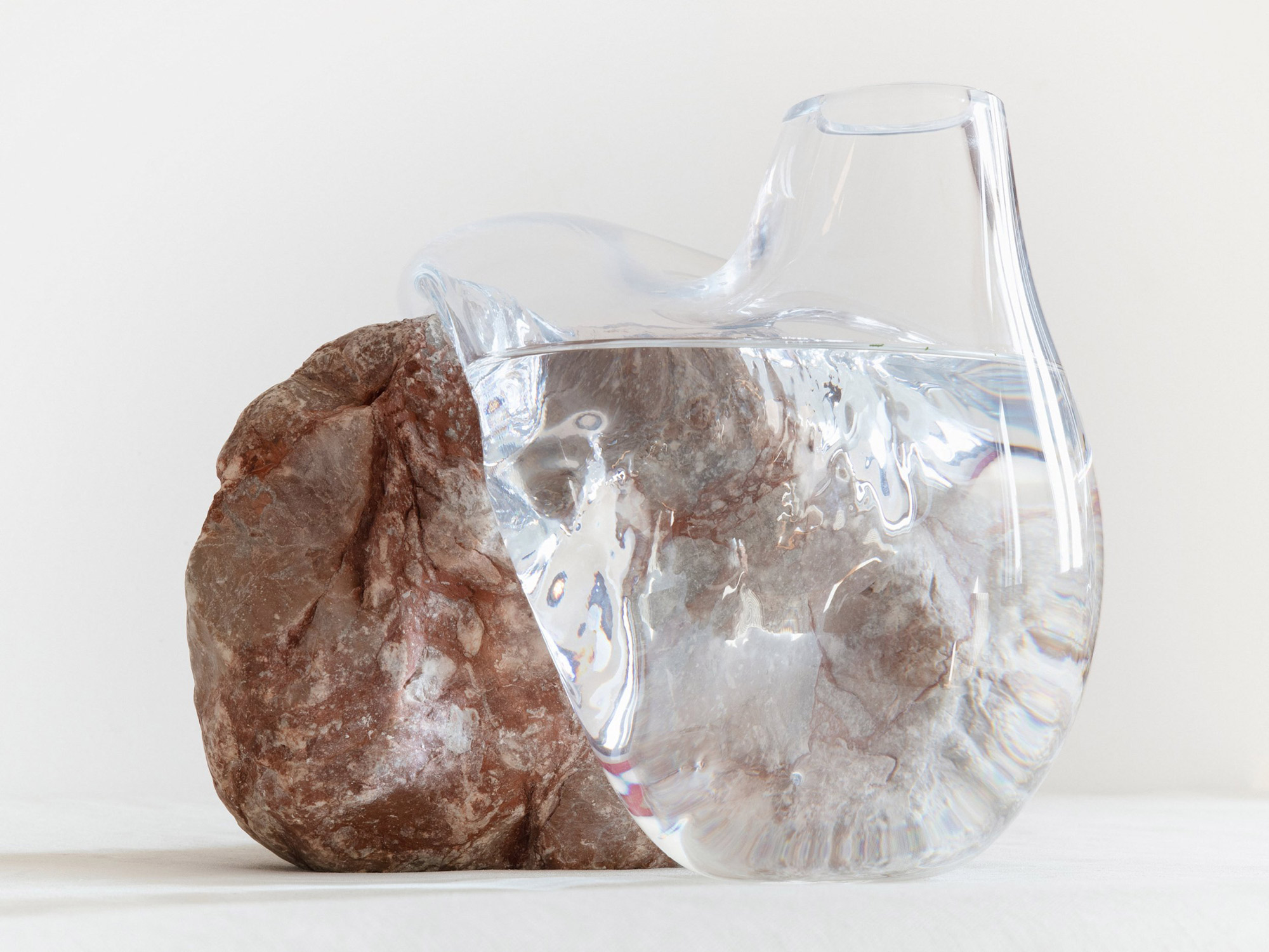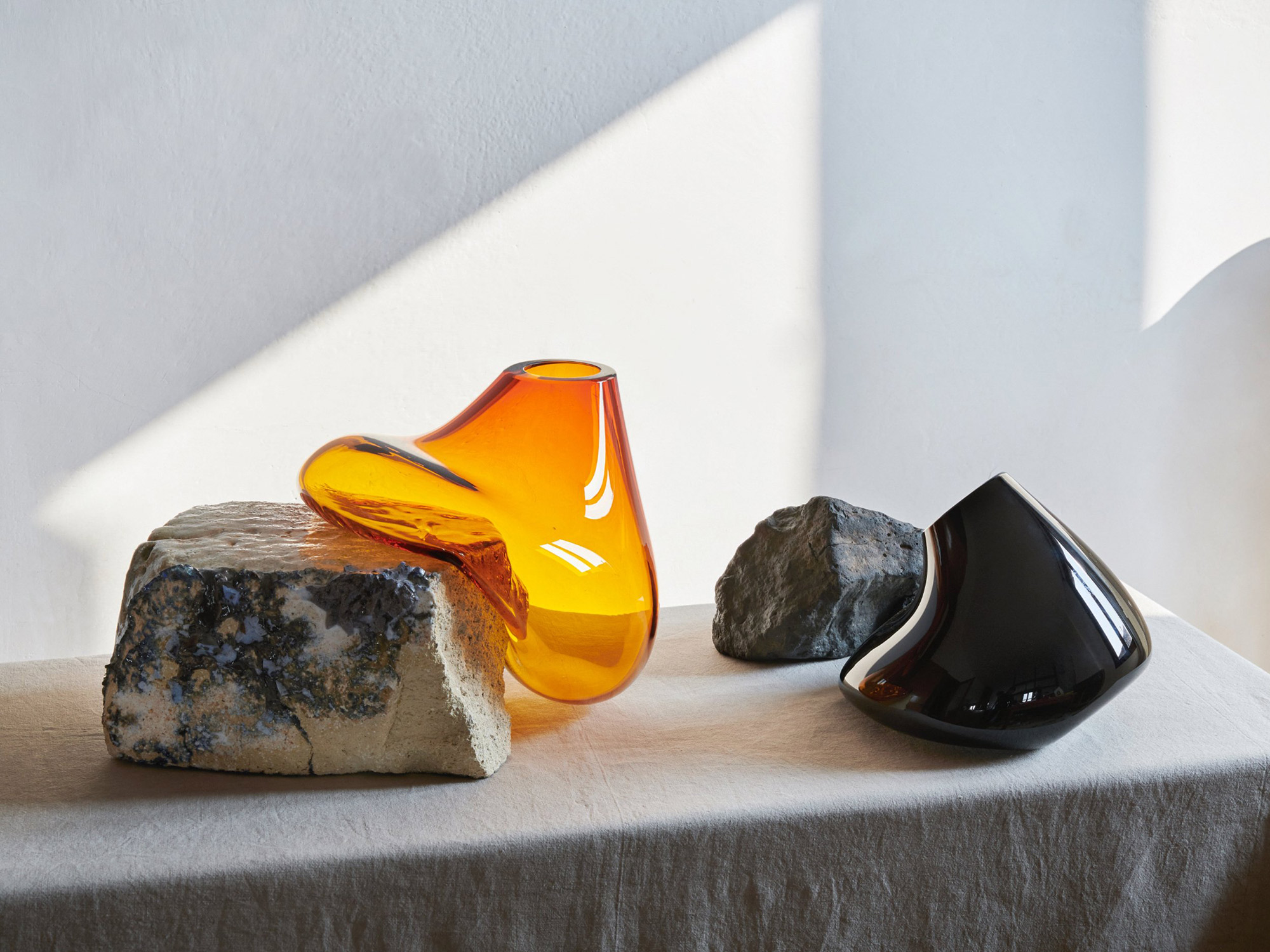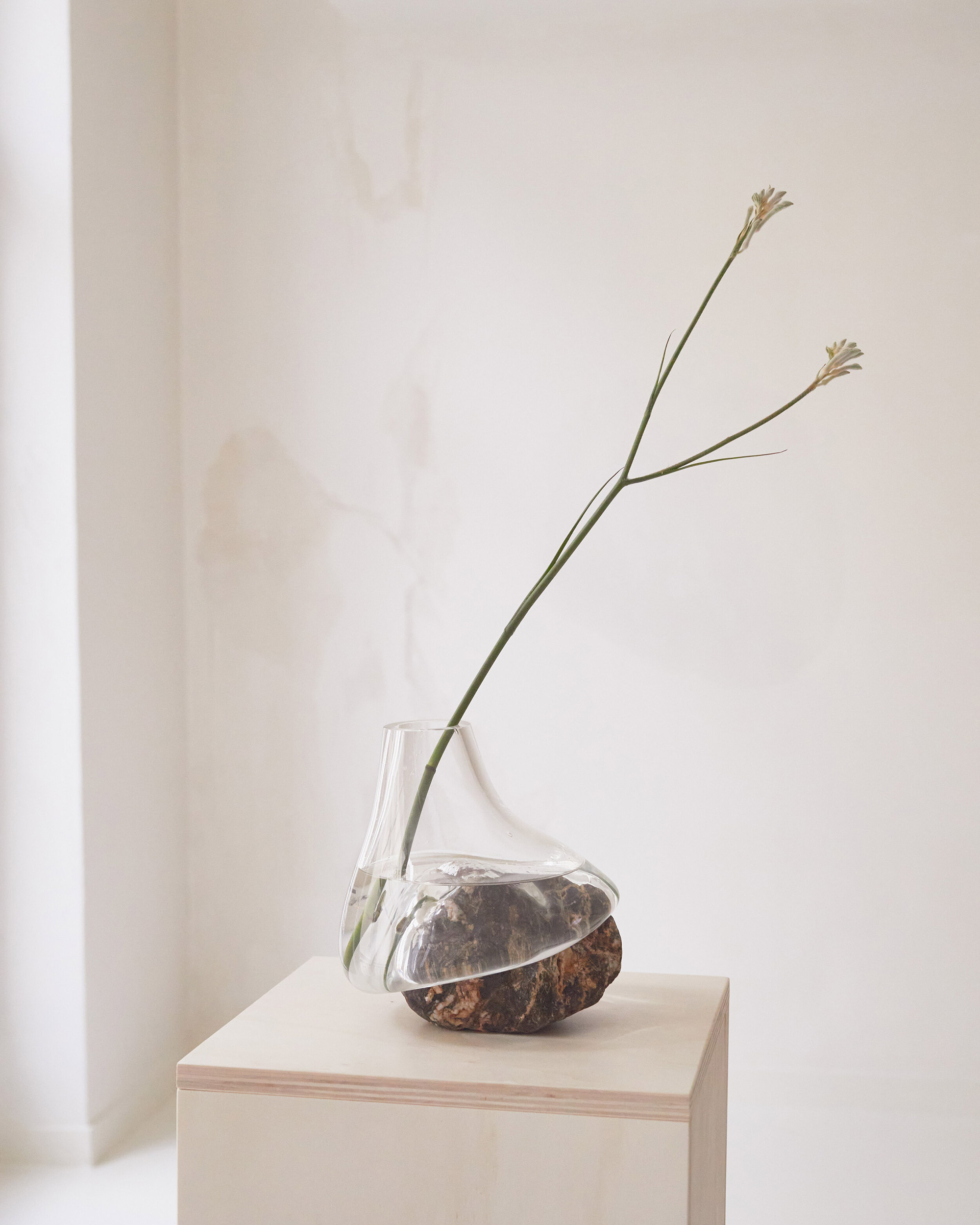 Earth, air, fire, and then water come together in her creations. Poetic and always one of a kind, the vases feature glass containers that “slump” over the rocks. The vases have a seemingly fluid form and an asymmetric shape. Apart from creating a parallel between the solidity of the rocks and the fragility of glass, the works also explore mineral and organic materials and the beauty of imperfection. The artist uses both clear and colored glass in her work along with matte black and translucent amber glass. When in use, the vases truly come to life. The water and the flowers bring yet another dimension to the artist’s multi-layered and captivating work. Photography © Lætitia Jacquetton, Linus Ricard, Alizée Quinche.