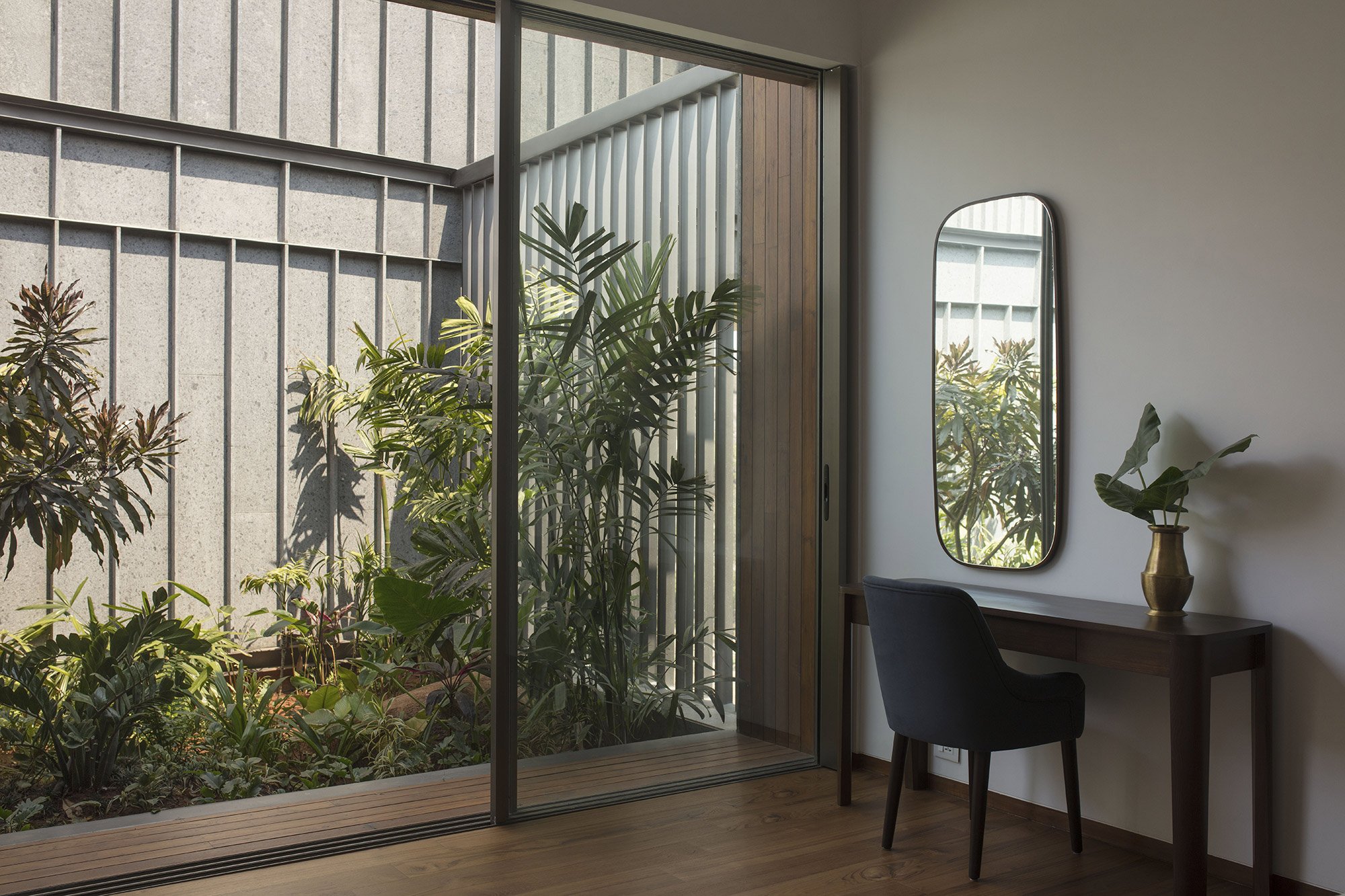 Located in Hyderabad, India, Lakehouse is a weekend home that allows the inhabitants to relax in the middle of nature while still feeling close to the city. Designed by CollectiveProject the dwelling has a clean, contemporary design that maximizes the spectacular views with cantilevered volumes and glazed walls. Unlike other houses from the area, the building sits lightly on the land, as the architects preserved the site’s integrity. Instead of excavating the plot of land and flattening it, the team nestled the house into the sloping, rocky terrain. The structure stands on pillars, almost hovering above the ground. The privileged location offers access to views of the Durgam Cheruvu lake and to lush vegetation as well as to the rapidly growing city in the distance, creating a dialogue between the natural and urban settings.